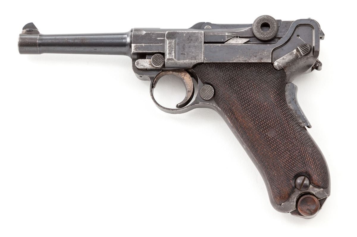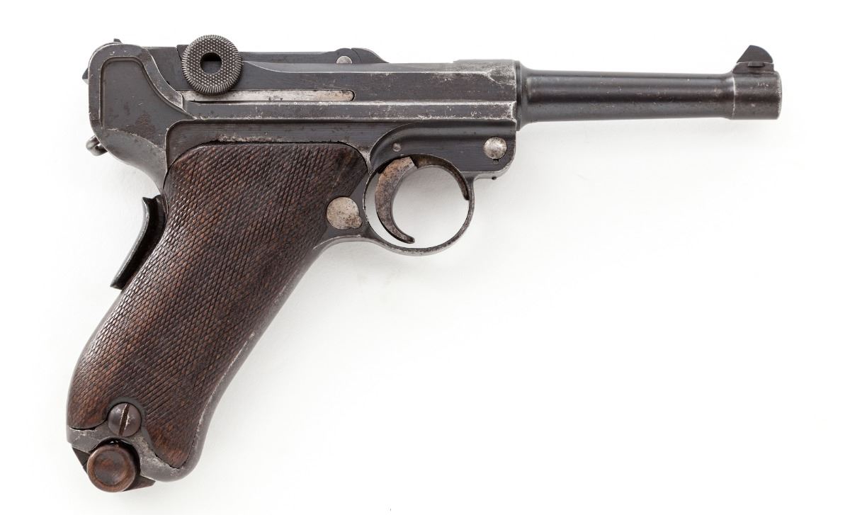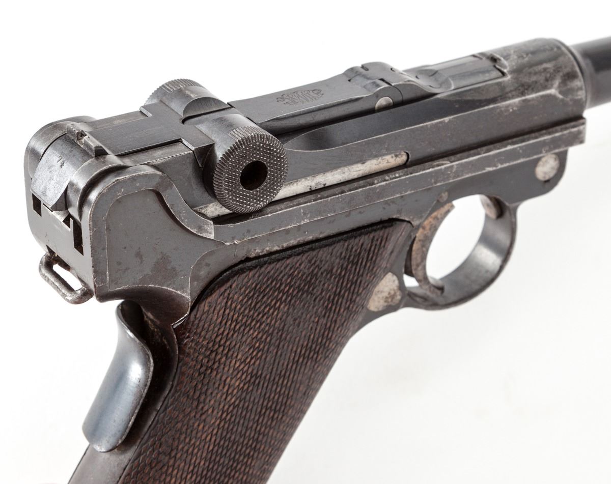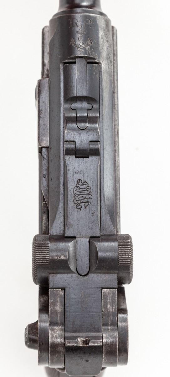 Republic of Portugal Navy Model 1906 Luger, #574, 9mm, 4'' barrel, blue finish with straw small parts, factory checkered walnut grips, with nickel-plated magazine with unnumbered walnut base. Chamber area marked ''RP'' with anchor; toggle link marked DWM; safety marked ''Carregada''. Condition is very good retaining approx. 60%-70% thinning and toning blue. Grips with moderate flattening. Action is good, bore is fair. Est.: $1,500-$2,000. (C&R)