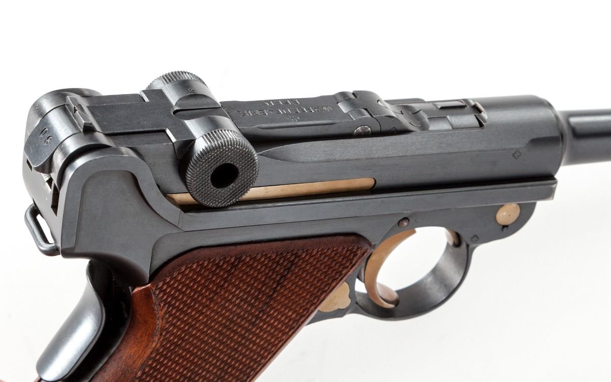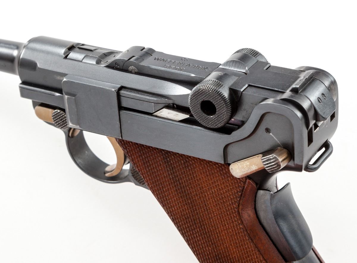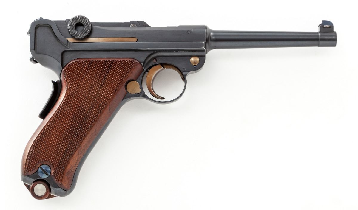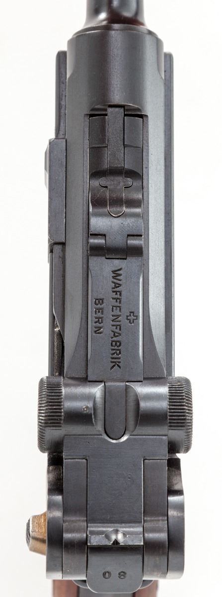 Swiss Model 06/24 Luger, with holster and extra mag., #16908, .30 Luger cal., 4-3/4'' barrel, blue finish with straw small parts, checkered walnut grips with smooth borders, Swiss nickel-plated magazine with wood base and inset bright metal disc. In 1945 dated Swiss holster with shoulder sling, and one extra plain wood base magazine lightly marked with the numeral ''2''. Condition is excellent retaining approx. 98% original finish. Grips and action are crisp, bore is bright. Pistol is very lightly import marked along bottom edge of frame and is near imperceptible. Holster is fine, remaining supple, with just minor oil darkening. Est.: $1,800-$2,400. (C&R/PPT)