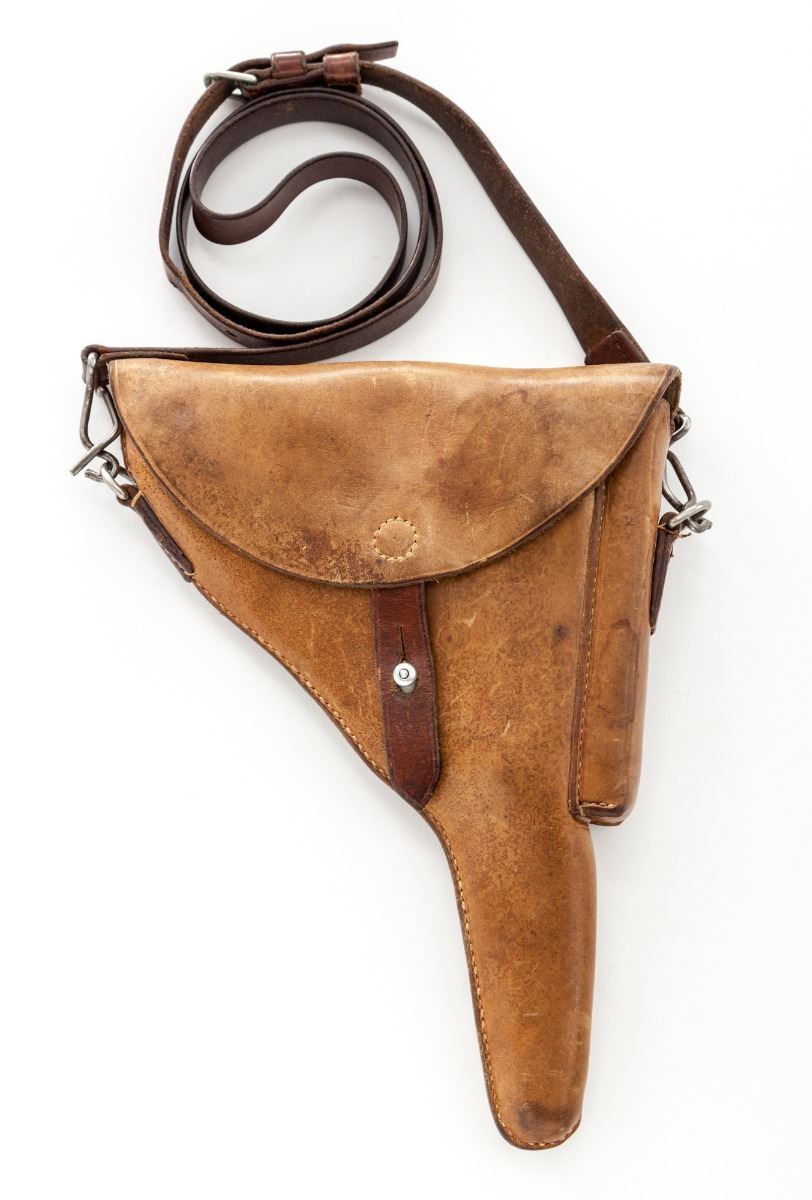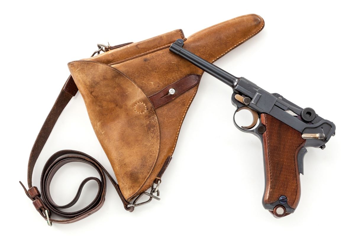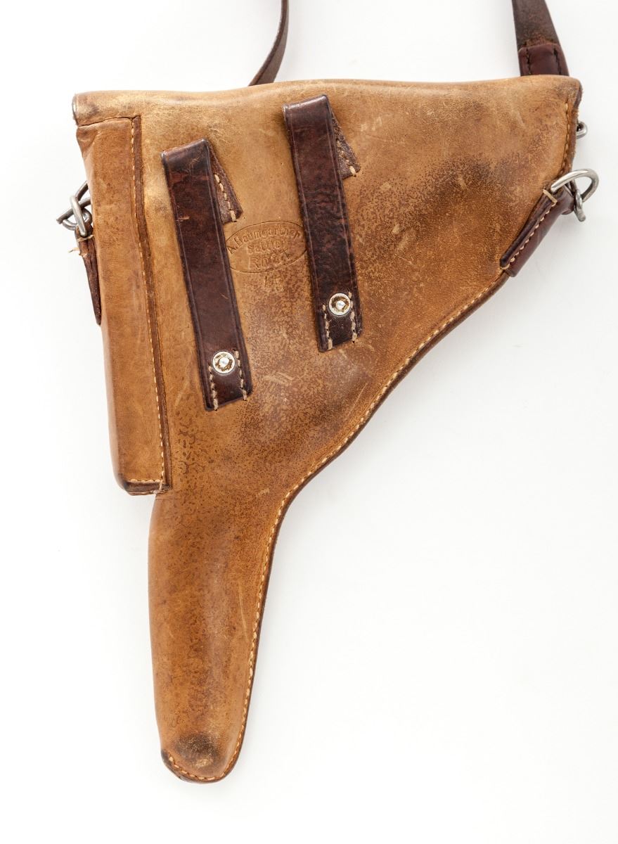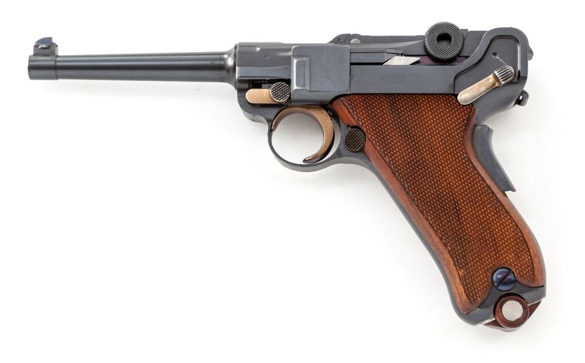 Swiss Model 06/24 Luger, with holster and extra mag., #16908, .30 Luger cal., 4-3/4'' barrel, blue finish with straw small parts, checkered walnut grips with smooth borders, Swiss nickel-plated magazine with wood base and inset bright metal disc. In 1945 dated Swiss holster with shoulder sling, and one extra plain wood base magazine lightly marked with the numeral ''2''. Condition is excellent retaining approx. 98% original finish. Grips and action are crisp, bore is bright. Pistol is very lightly import marked along bottom edge of frame and is near imperceptible. Holster is fine, remaining supple, with just minor oil darkening. Est.: $1,800-$2,400. (C&R/PPT)