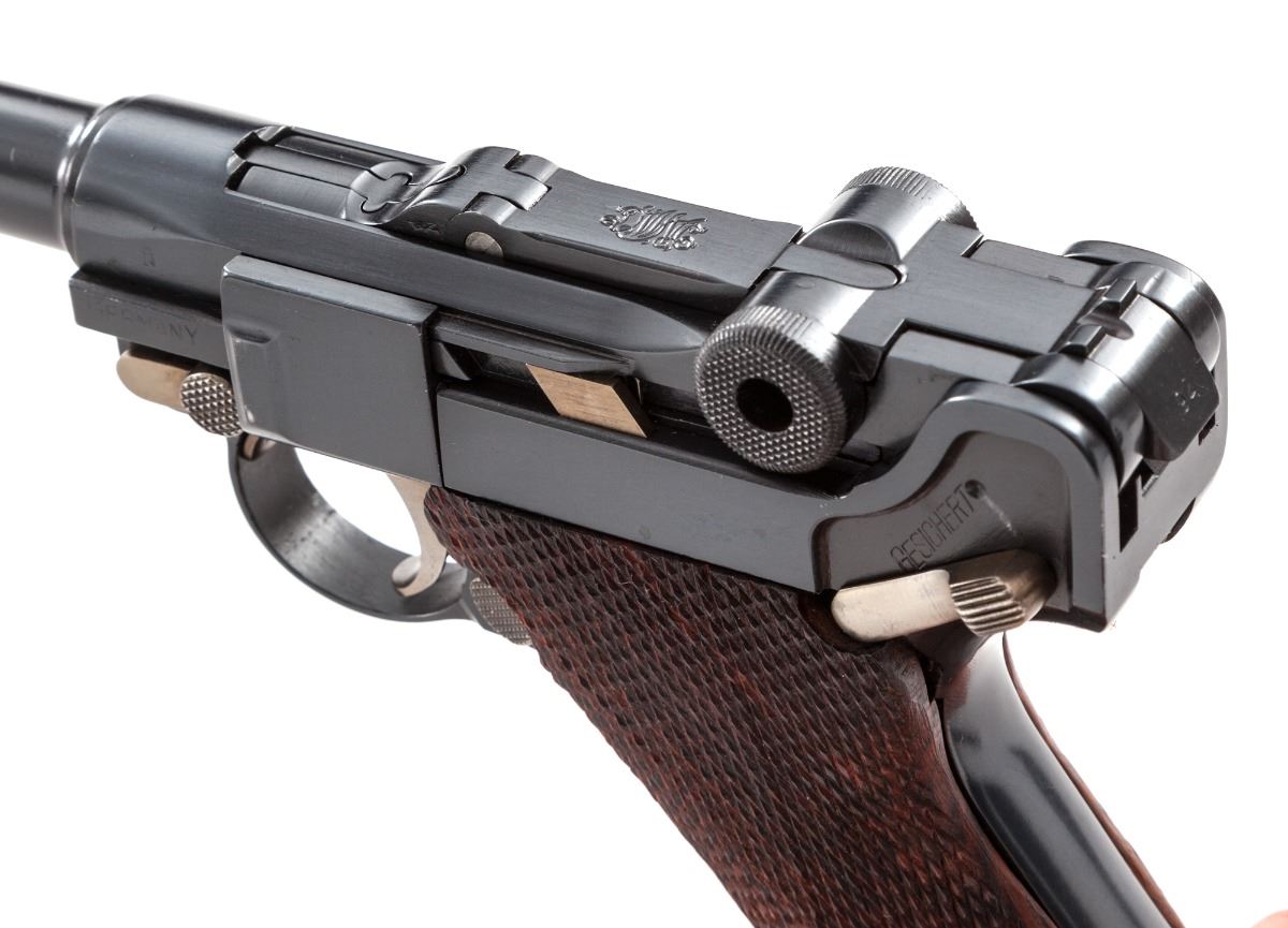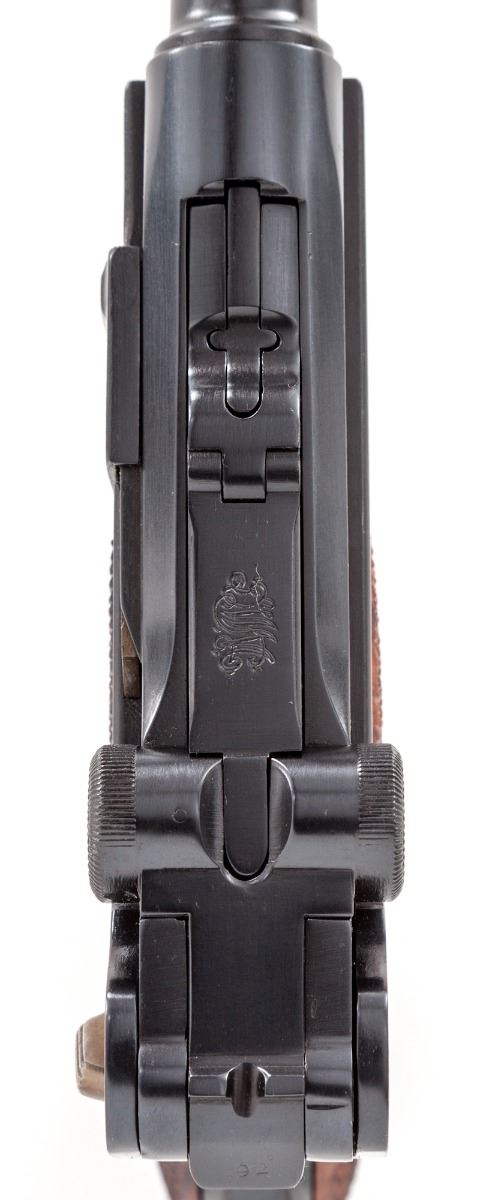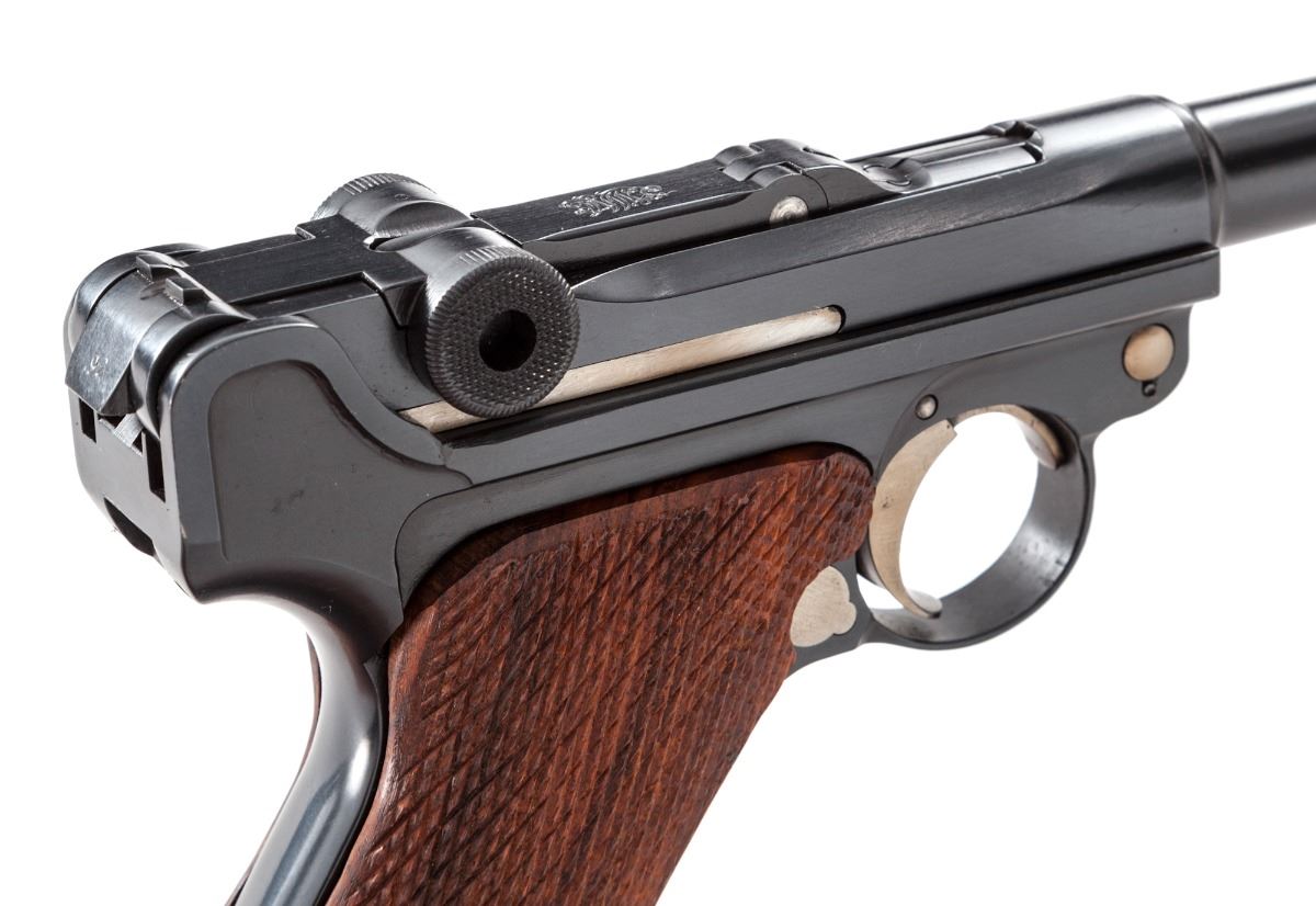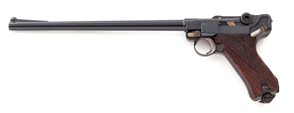 Custom Long-Barreled Luger P.08 Semi-Automatic Pistol, #8492o, 9mm, 11-1/2'' barrel, blue finish, straw-colored small parts, coarse checkered walnut grips, with one tin-plated WWI era magazine with unmarked wooden base. Chamber area is blank, toggle marked DWM, ''(crown)/N'' proofmarks to upper receiver. Barrel and left side of frame marked ''Germany''. Condition is excellent as modified and refinished, retaining approx. 98% blue. Later made grips show well with little use. Action is good, bore is bright. Left grip panel needs additional relief cut to better facilitate thumb safety operation. Est.: $1,200-$1,800. (C&R/PPT)