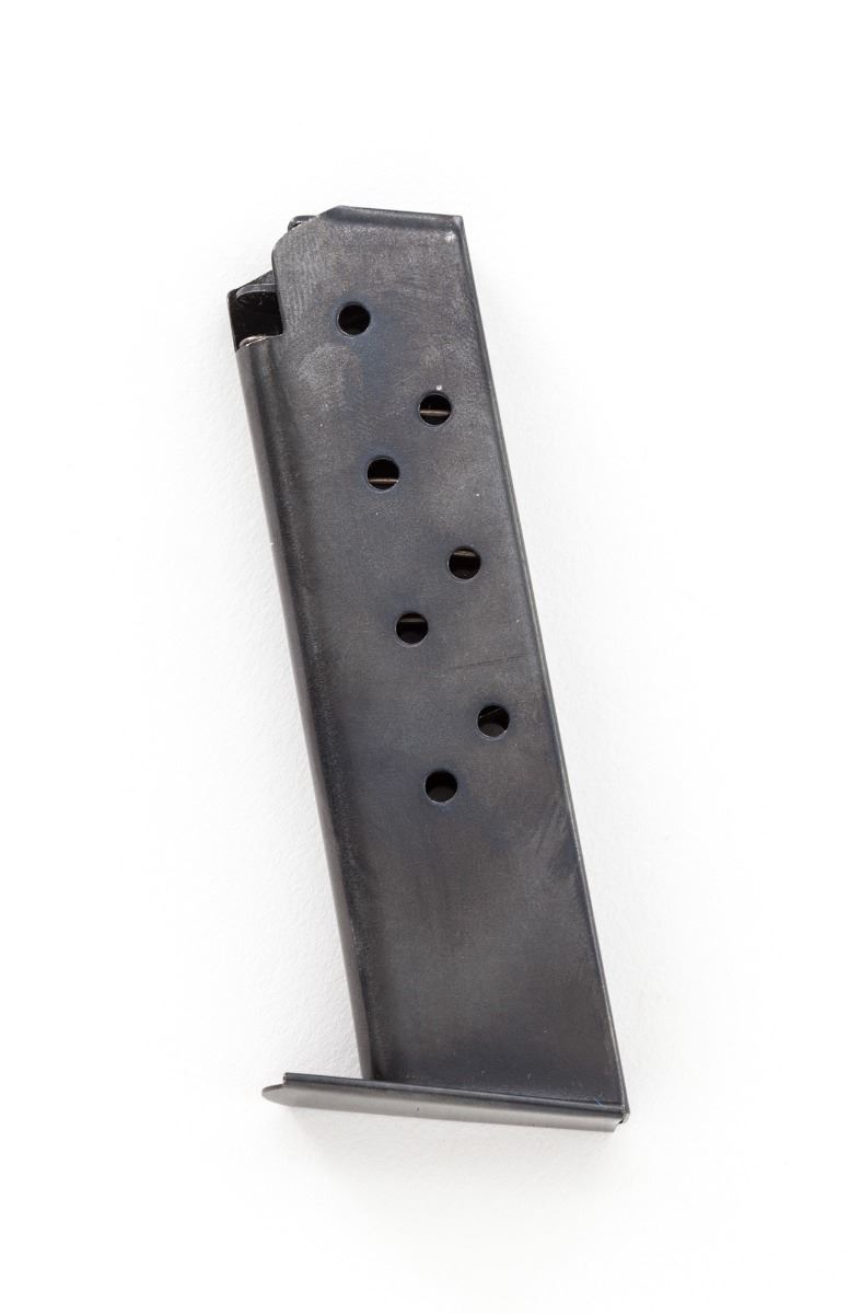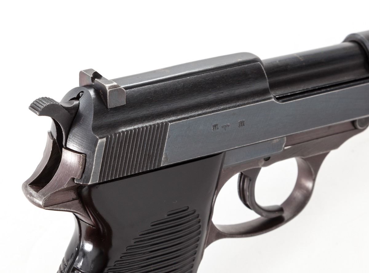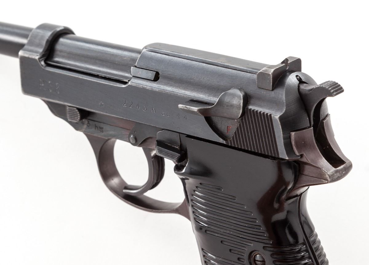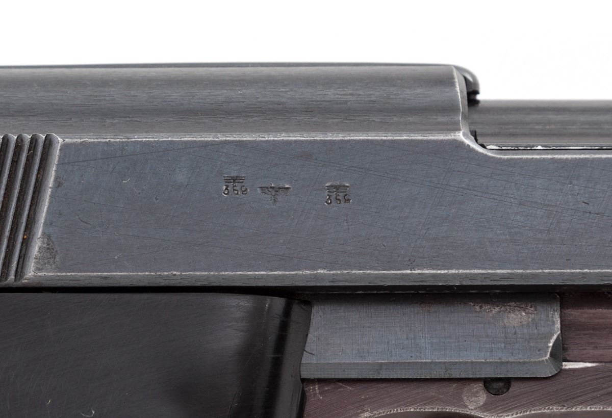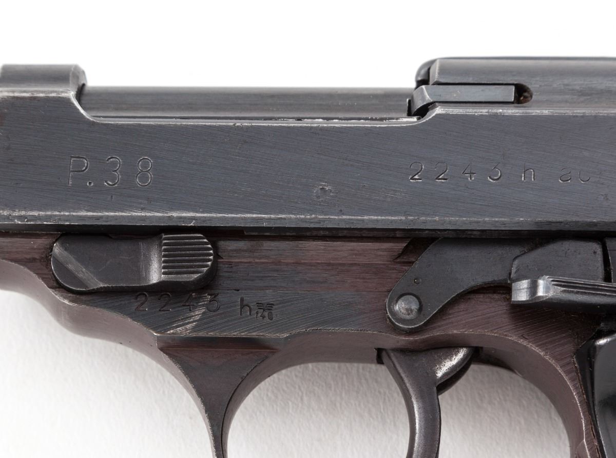 WWII Era Walther P-38 Semi-Automatic Pistol, #2243h, 9mm, 4-7/8'' barrel, blue finish, black phenolic resin grips, with one WWII era magazine and one aftermarket magazine. All visible matching numbers, including locking block. Condition is excellent. Blue and plum frame retains approx. 92% thinning blue with most of the losses to front strap. Slide and barrel show 95% blue with wear at high edges. Grips, action and bore are excellent. Est.: $800-$1,200. (C&R/PPT)