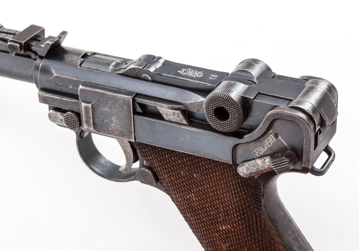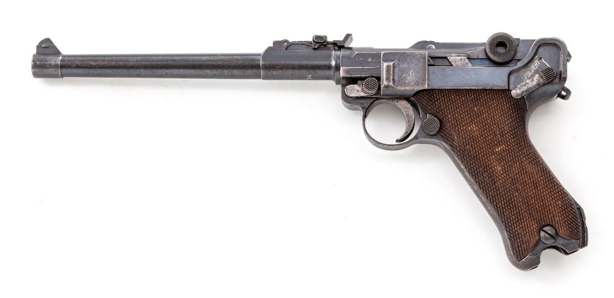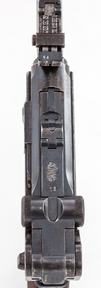 WWI Era Model 1917 Artillery Luger, by DWM, #5861m, 9mm, 8'' barrel, blue finish, straw small parts, checkered walnut grips. No mag. Chamber dated 1917, toggle link marked ''DWM''. This is not the version with the fine-tune front and rear sights. Condition is very good retaining approx. 80%-85% thinning and lightly toning blue. Front and backstrap retain approx. 50%-60% thinning and flaking blue. Straw parts with moderate carbon spotting; grips show moderate wear as well. Action is crisp, bore is fair. Est.: $1,500-$2,000. (C&R)