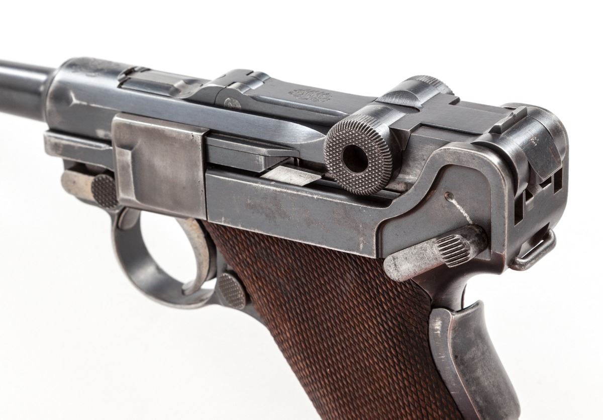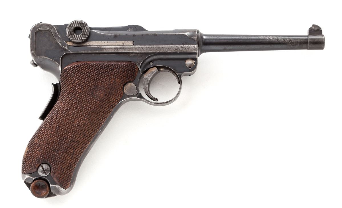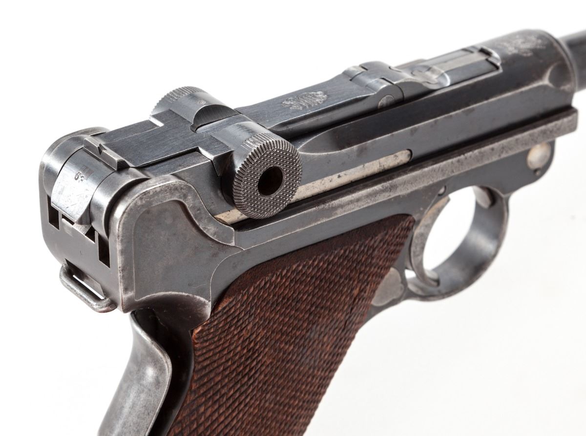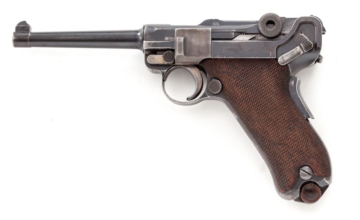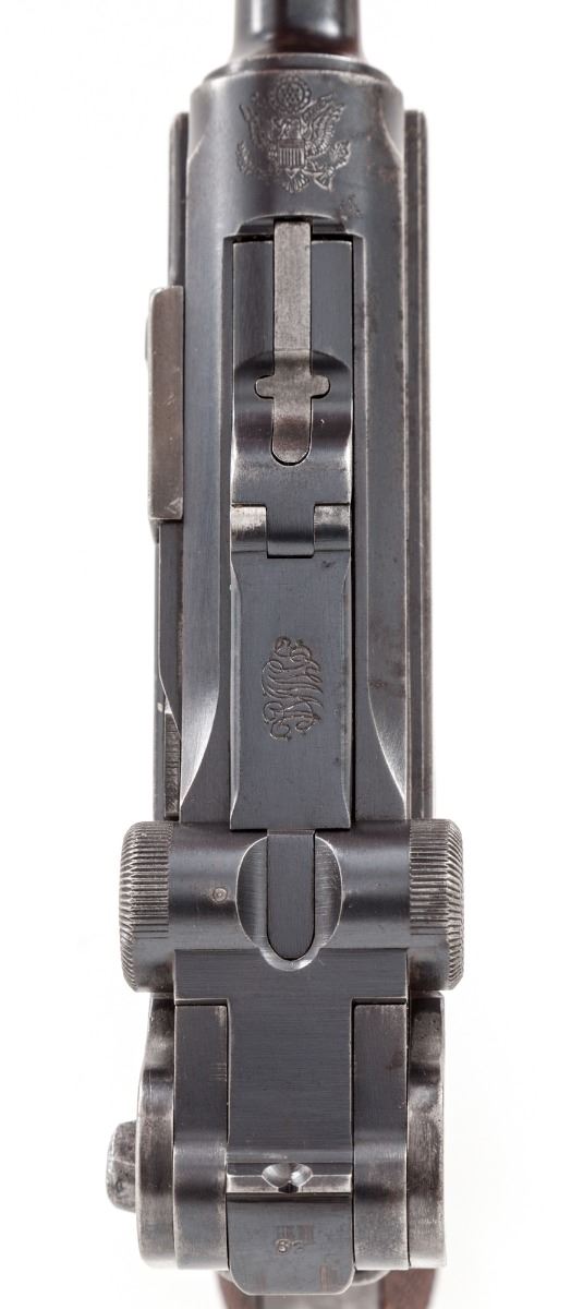 American Eagle Model 1923 Commercial Luger, #45763, .30 Luger cal., 4-3/4'' barrel, blue finish, straw small parts, factory checkered walnut grips, with blue-bodied unmarked wood based magazine. Lower portion of thumb safety polished bright, American eagle over chamber, DWM to central toggle, extractor marked ''Loaded''. Condition is very good retaining approx. 85% original blue. Case colored components show 70%, a little less to thumb safety. Grips show moderate flattening. Action is good, bore is bright. All visible matching numbers. Est.: $1,200-$1,800. (C&R)