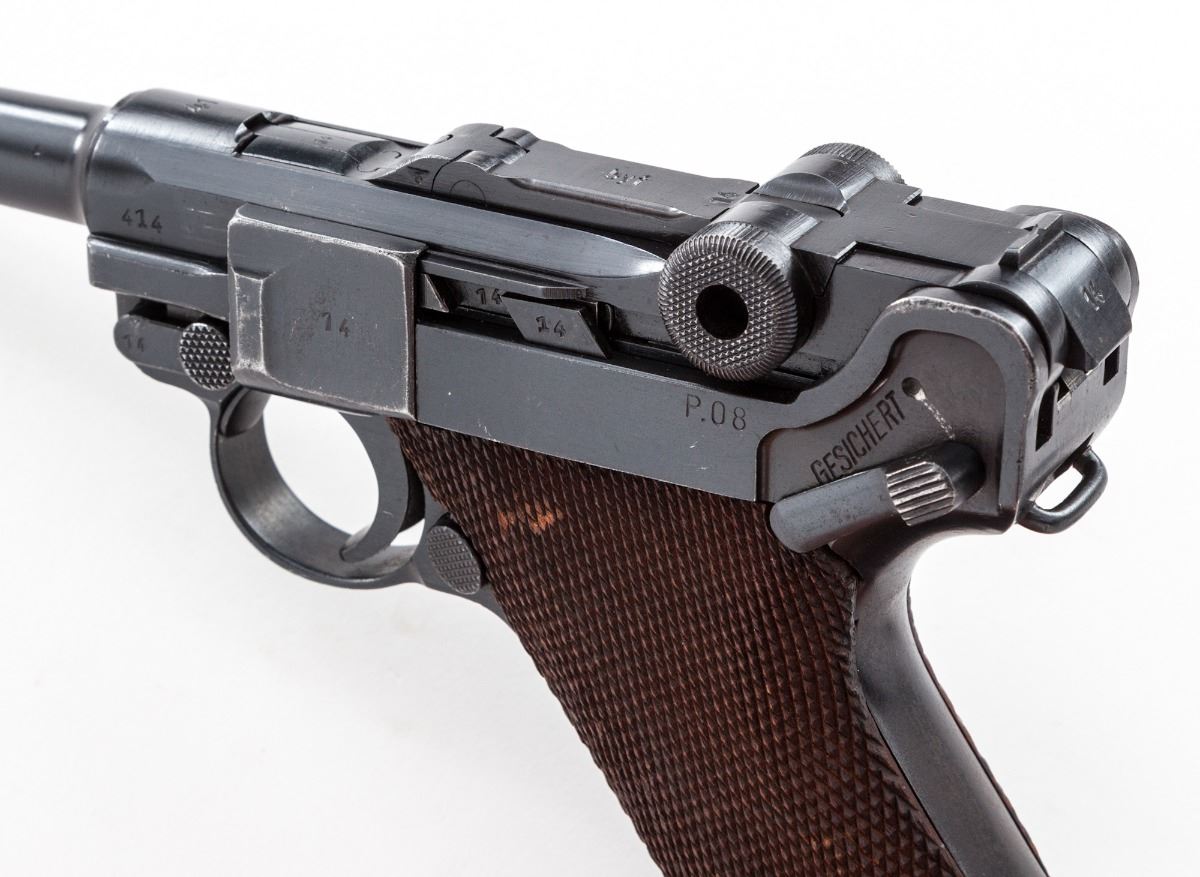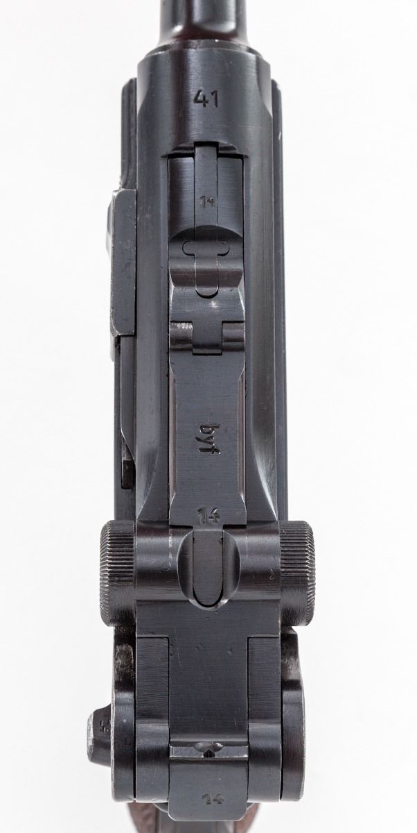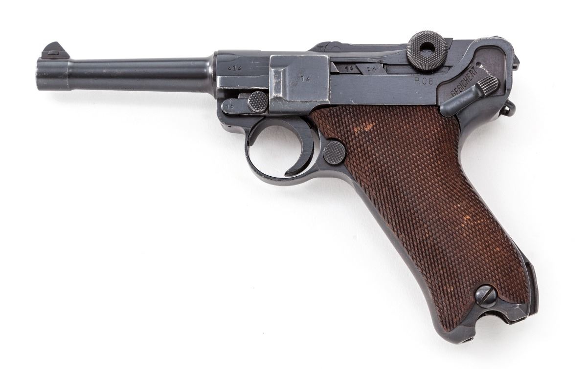 WWII Era P.08 Luger, by Mauser, #414x, 9mm, 4'' barrel, blue finish, factory checkered walnut grips. No mag. Chamber dated 41, toggle link ''''byf''. Condition is fine retaining approx. 94% lightly thinning blue, with strong front and back straps. Grips with mild flattening. Action is crisp, bore is good with mild frosting. Est.: $1,000-$1,500. (C&R)