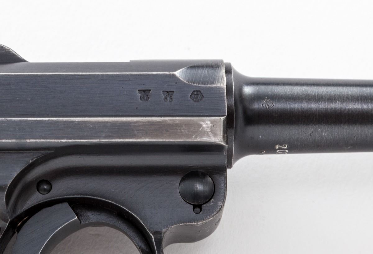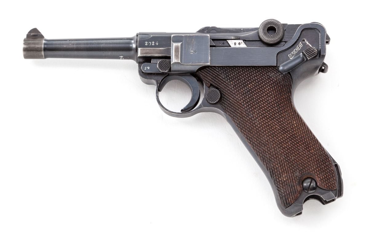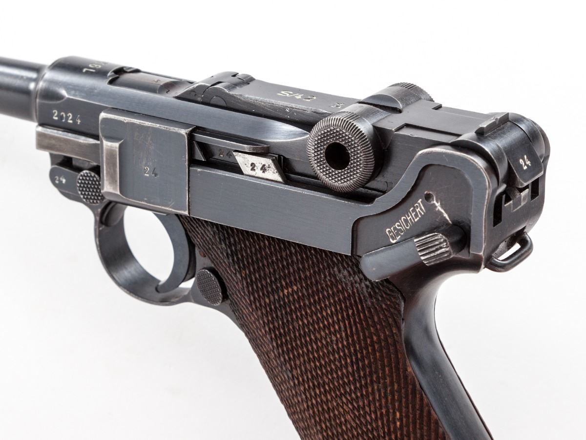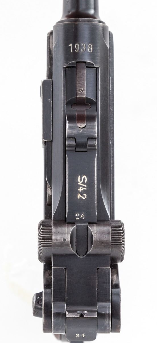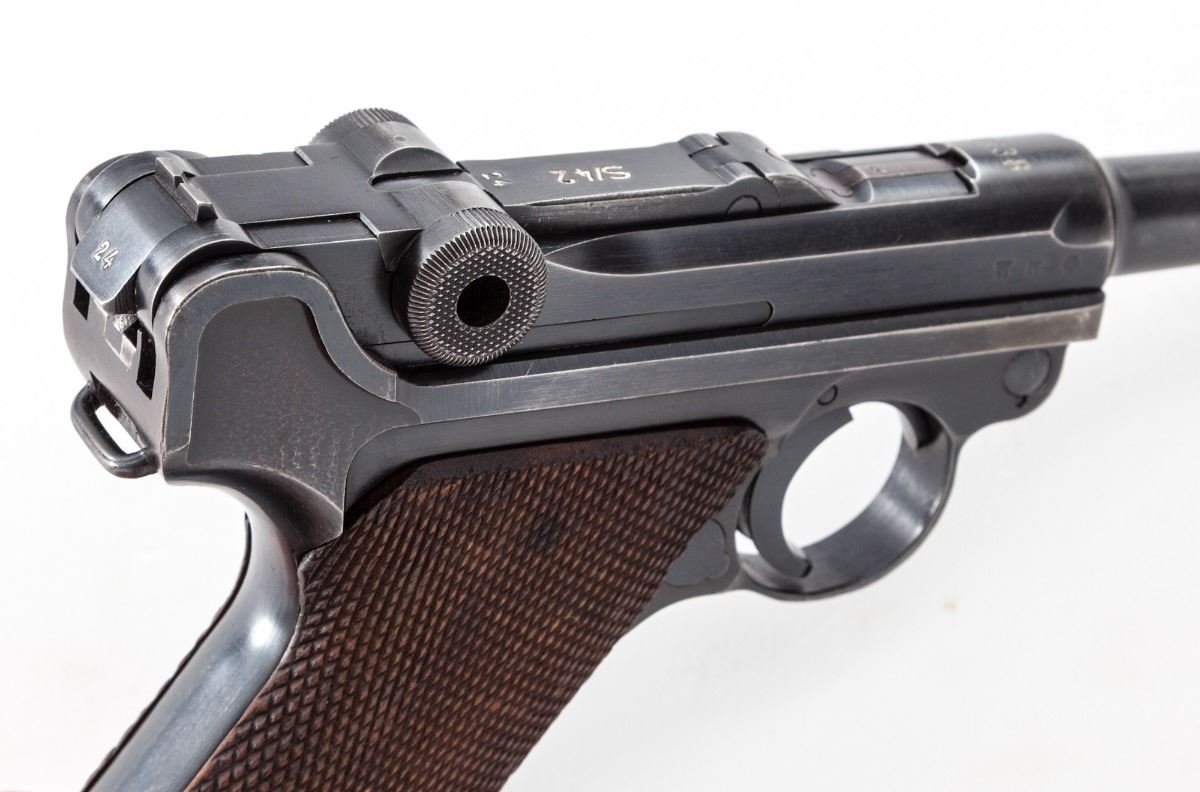 WWII Era P.08 Luger, by Mauser, #2024n, 9mm, 4'' barrel, blue finish, factory checkered walnut grips. No mag. Chamber dated 1938, toggle link ''S/42''. Condition is fine retaining approx. 94% lightly thinning blue, with strong front and back straps. Grips with mild flattening. Action is crisp, bore is bright. Est.: $1,000-$1,500. (C&R)