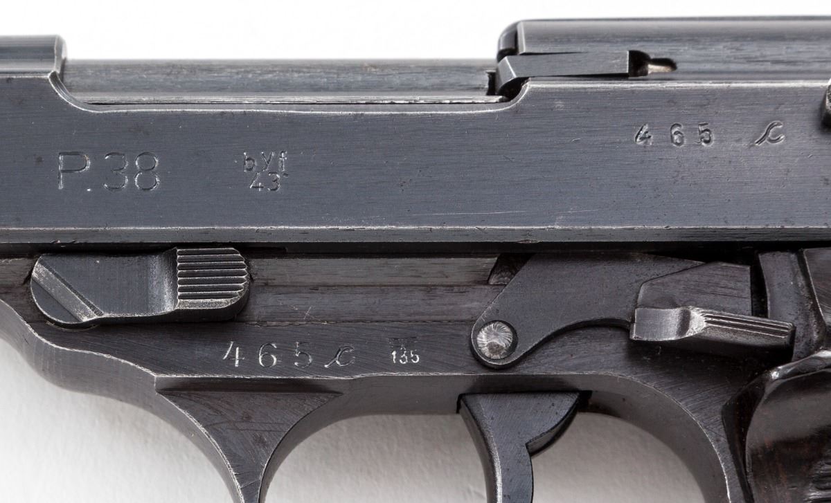Wartime Walther P.38 Semi-Automatic Pistol (ac-43), #465c, 9mm, 4-7/8'' barrel, blue finish, grooved brown resin grips. No mag. Condition is very good to near fine with all visible matching numbers, including lock block. Approx. 92% wartime finish remains with most of the losses as thinning and very light pitting to barrel. Grips show light use. Action is crisp, bore is very good. Est.: $500-$750. (C&R)