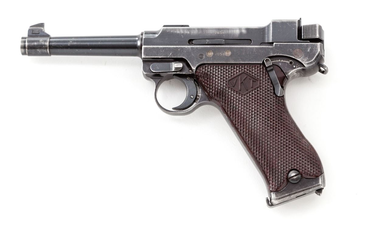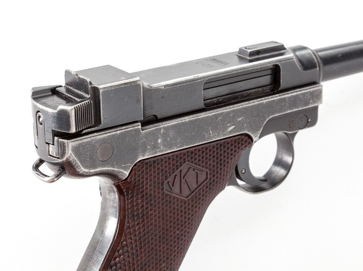 Valmet L-35 Lahti Semi-Automatic Pistol, #7654, 9mm, 4.7'' barrel, blue finish, with brown plastic grips marked ''VKT''. Pistol features loaded chamber indicator and designed to work in extreme cold, with just 5700 mfg'd. Condition is fine with all visible matching numbers, retaining approx. 85%-90% thinning blue. Grips show very mild flattening. Action is good, bore is fine. Est.: $1,000-$1,500. (C&R)