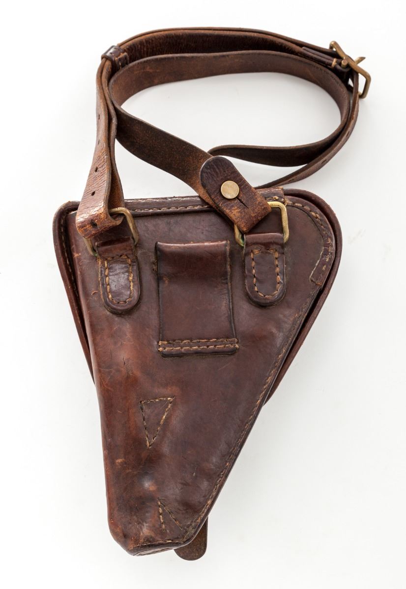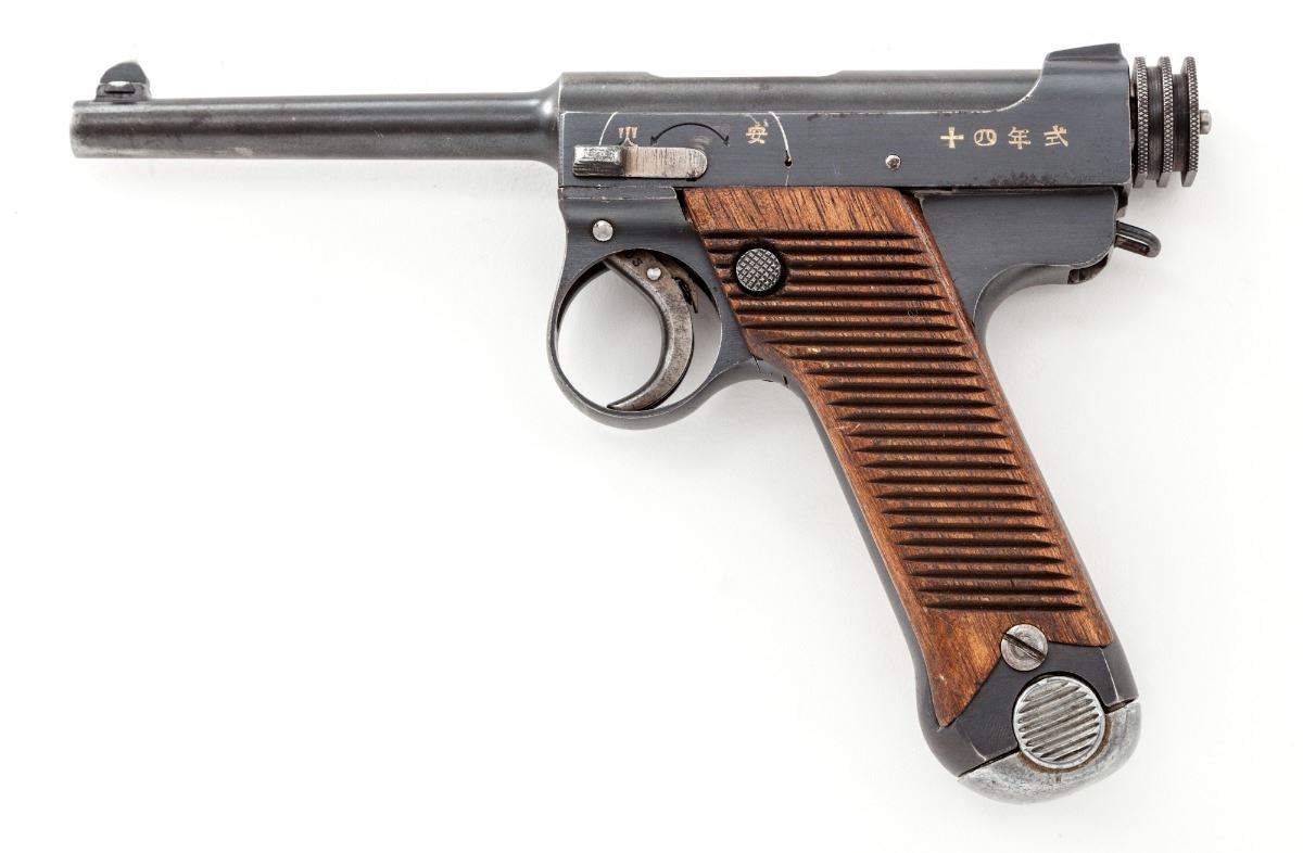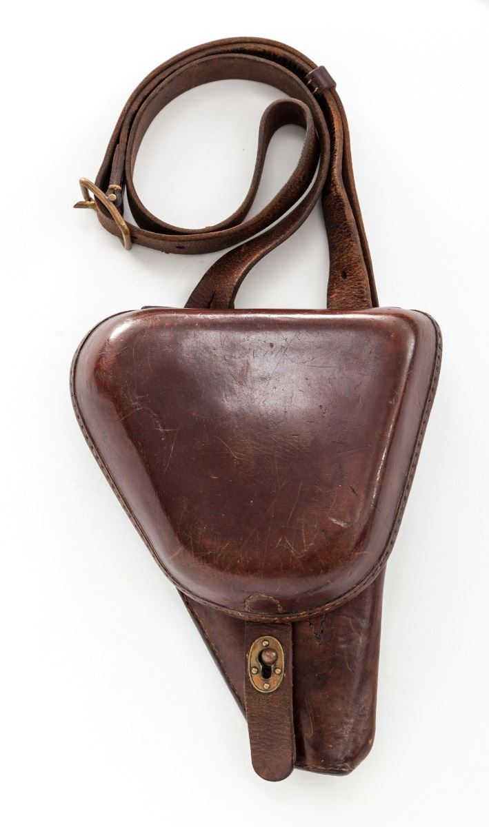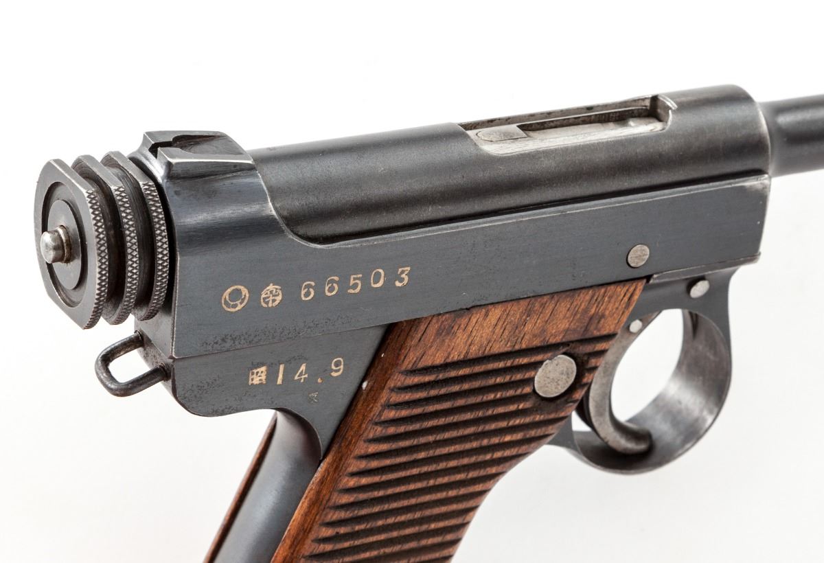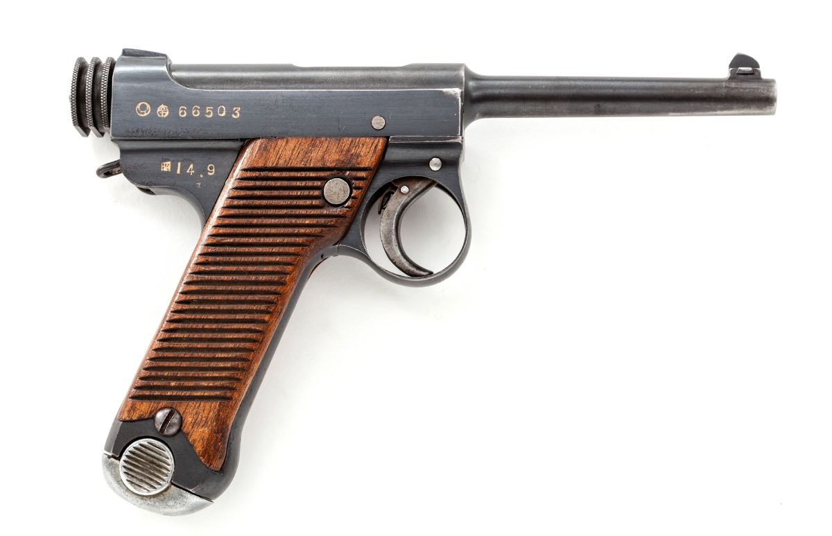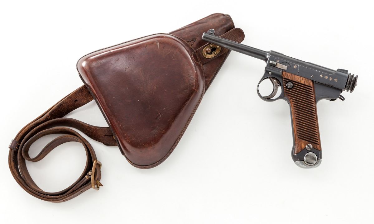 Japanese Type 14 Nambu, by Nagoya, in original holster with cleaning rod and extra firing pin, #66503, 8mm, 4-1/2'' barrel, blue finish, straw colored small parts, grooved mahogany grips, with one matching magazine. Dating from Sept. 1939 (14.9), making this one of the last several hundred small triggerguard examples produced. Condition is about fine retaining approx. 90%-92% original finish, having light general thinning to finish, with strong front and back strap. Grips show mild impressions. Action is good, bore is bright. Leather shell holster with shoulder strap retains tight stitching and minor soiling. Est.: $1,000-$1,500. (C&R/PPT)