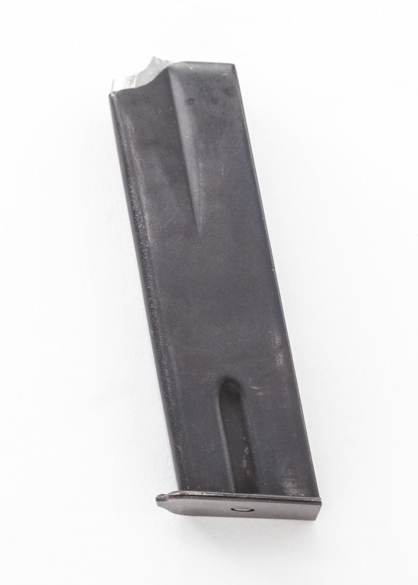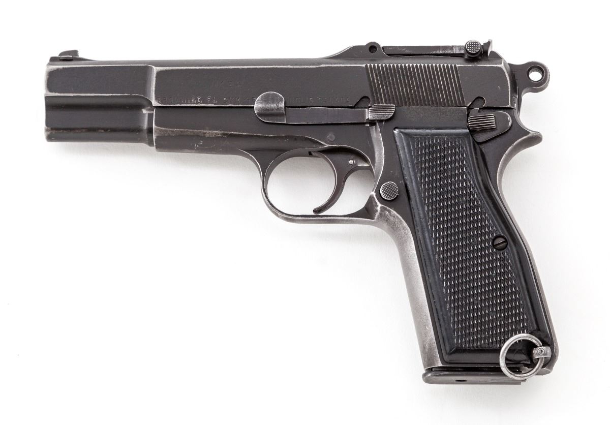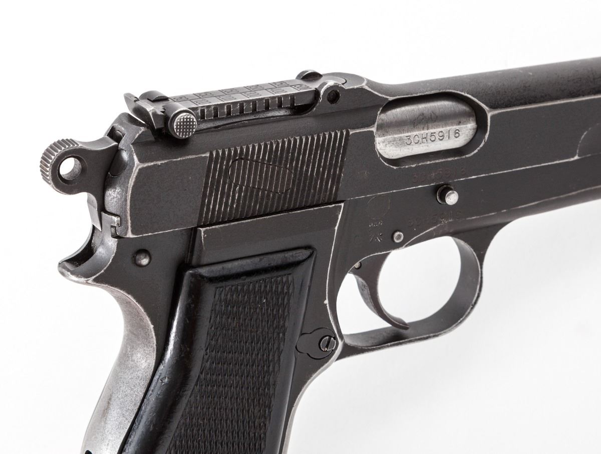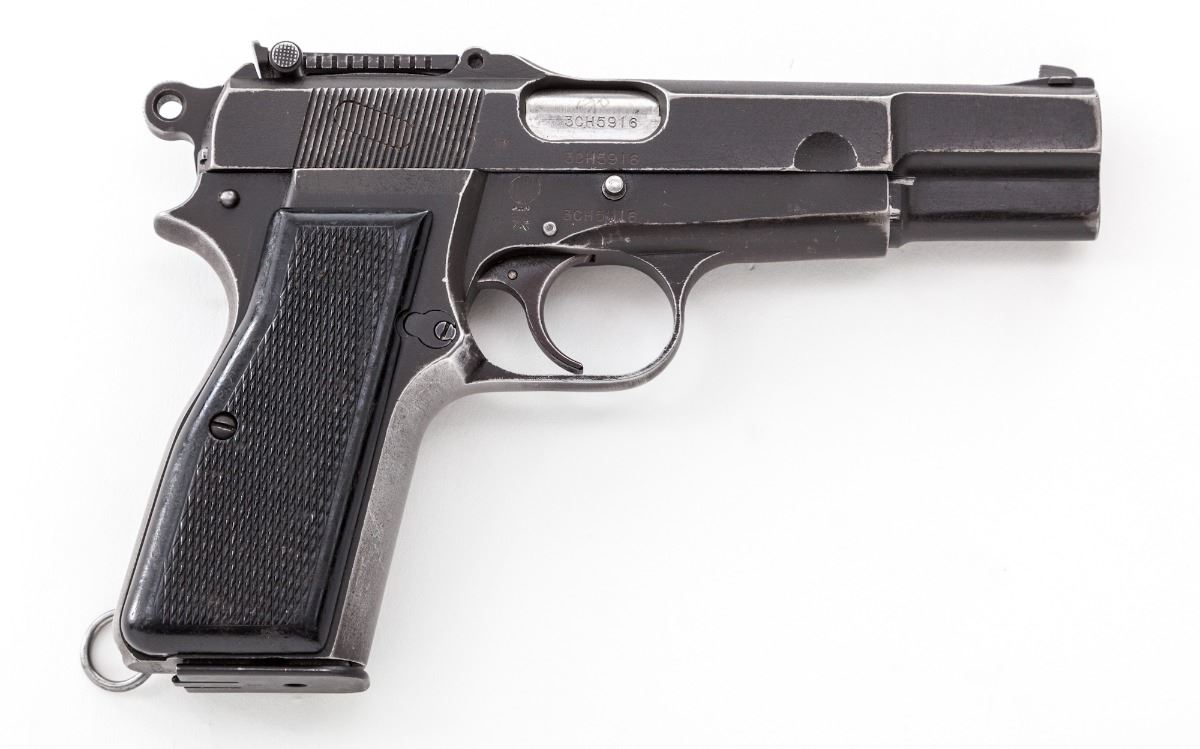 Canadian MK.I* Hi-Power Semi-Automatic Pistol, by Inglis, #3CH5916, 9mm, 4-3/4'' barrel, matte finish, black checkered plastic grips, with one ''JI'' marked magazine, and one additional unmarked magazine. Tangent sight 50-500, cut for shoulder stock, with lanyard loop at the bottom of left grip panel. Condition is about fine retaining approx. 85% thinning finish, with most of the losses to front and backstrap. High edges show bright. Grips with moderate use. Lightly import marked at butt. Action is crisp, bore is very good. Est.: $1,000-$1,500. (C&R)(High cap mags not available to Calif. residents.)