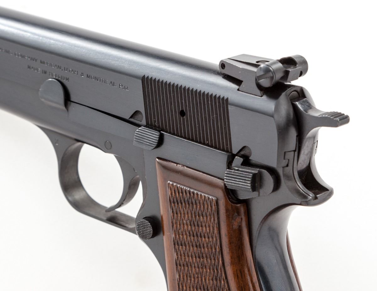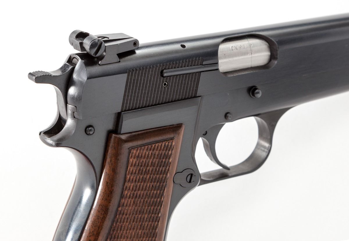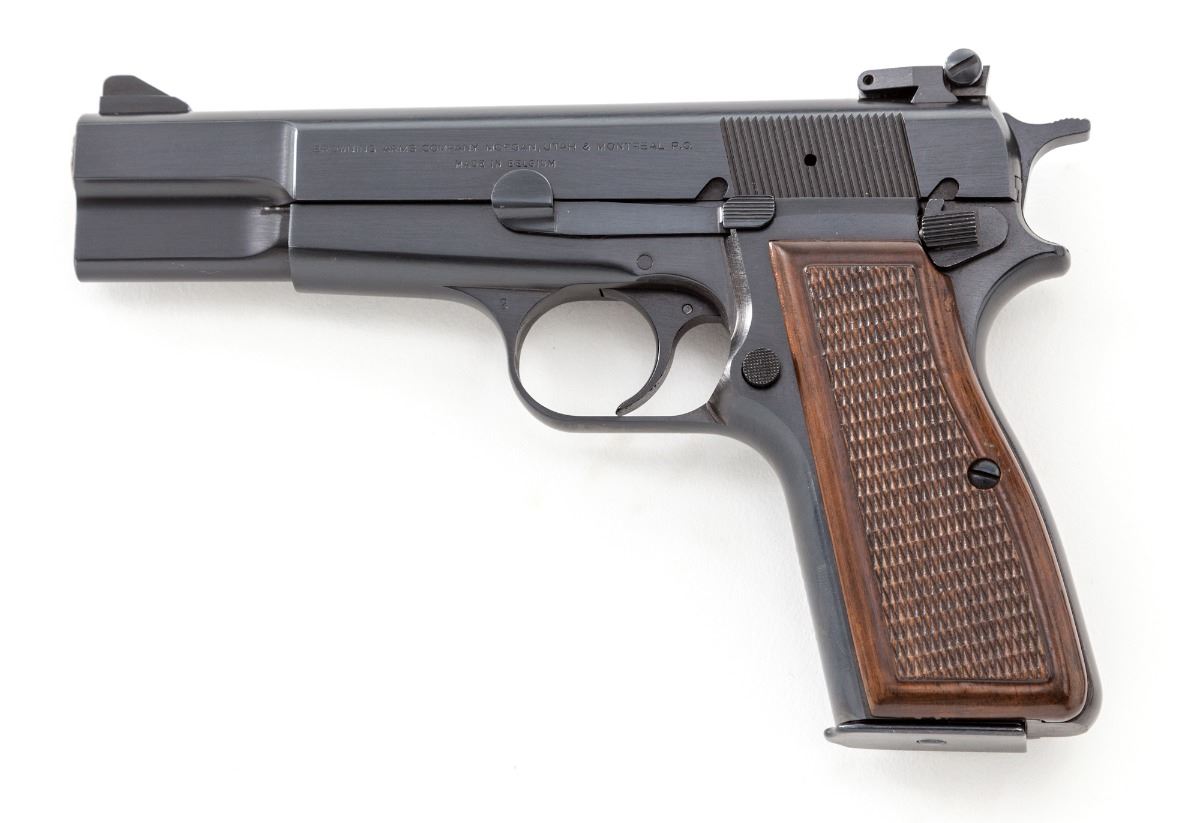 Browning High Power Semi-Automatic Pistol, #73C71005, 9mm, 4-3/4'' barrel, blue finish, checkered walnut grips, with one magazine and factory adjustable sights. Mfg'd 1973. Condition is excellent retaining approx. 96% factory blue. Grips and action are crisp, bore is mirror bright. Est.: $600-$800. (Modern/PPT) (High cap mags not available to Calif. residents.)
