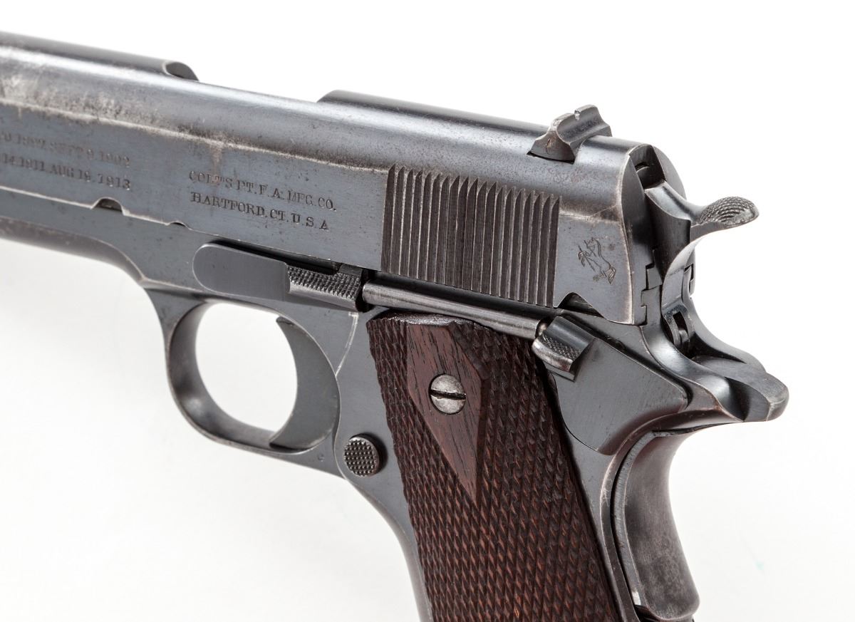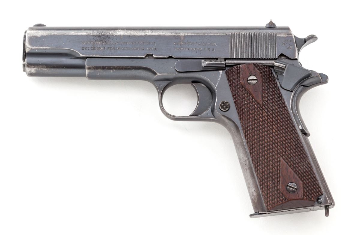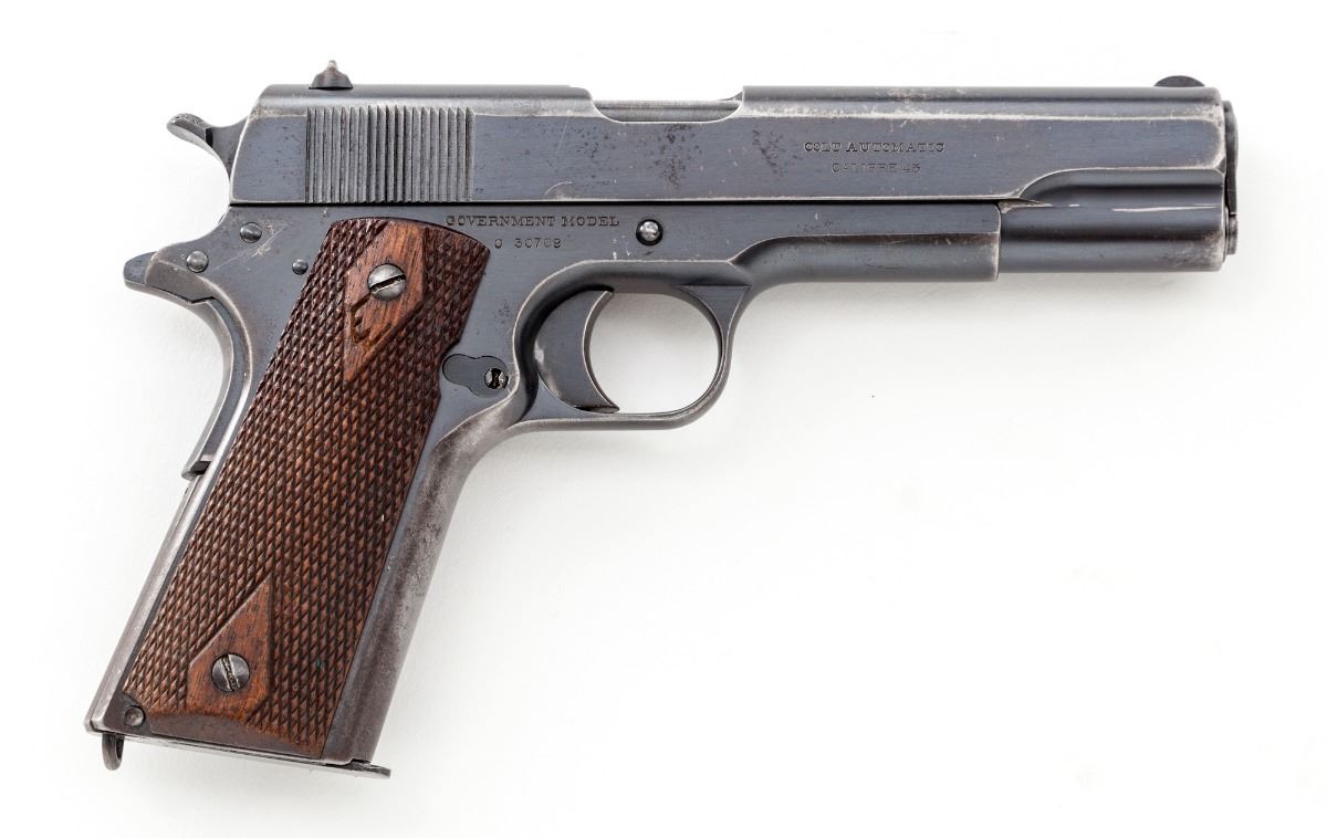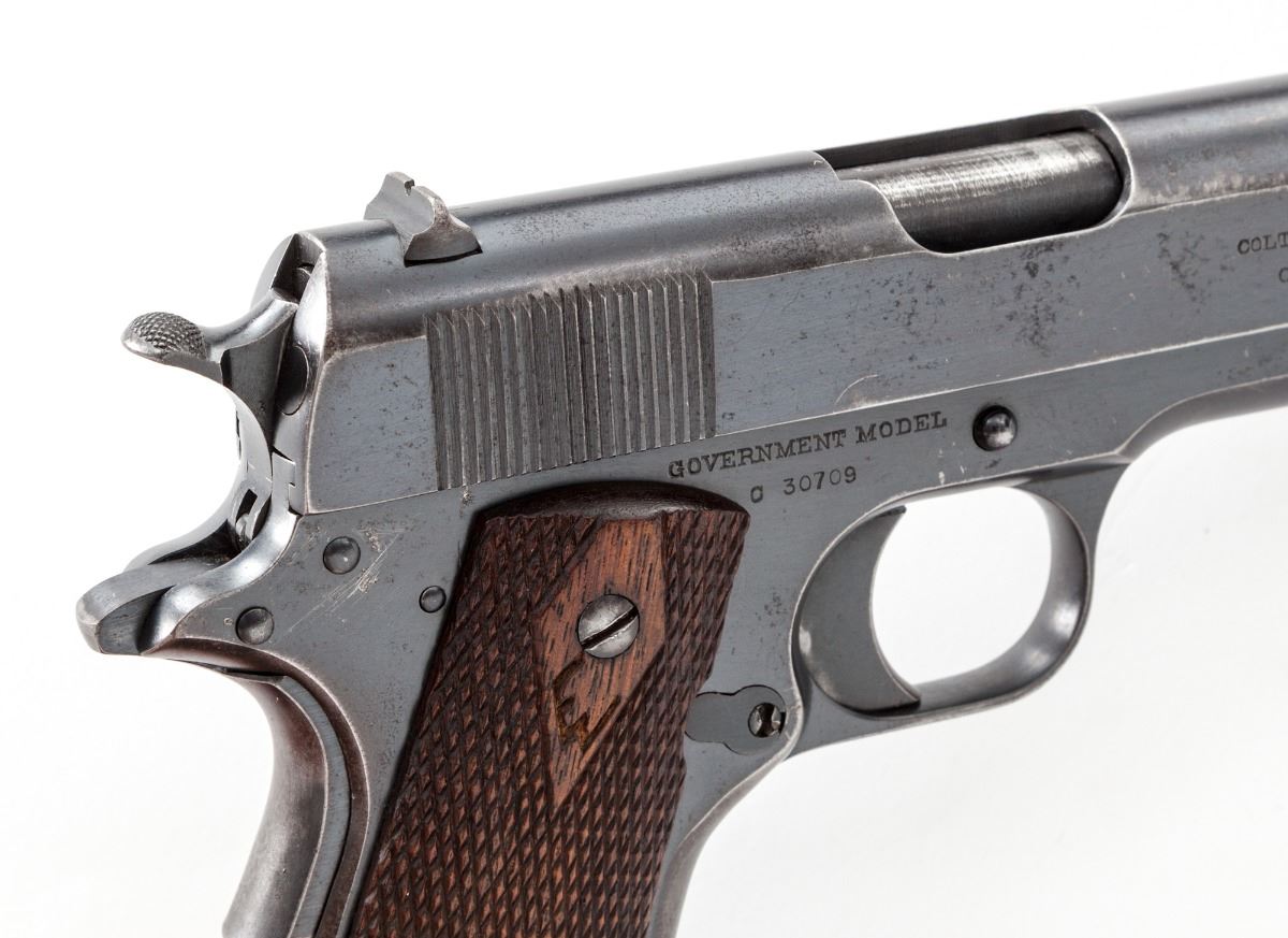WWI Era Colt Government Model Semi-Automatic Pistol, #C30709, .45 ACP cal., 5'' barrel, blue finish, diamond checkered walnut grips, with one two-tone magazine. Mfg'd Spring 1916. Condition is about fine retaining approx. 85% factory blue with even wear. Front strap and mainspring housing have thinned to approx. 20%. Grips with mild flattening, with monogram style engraving to upper right diamond. Light burrs to grip screws, somewhat more pronounced to magazine release screw. Original barrel has been replaced with WWI era P/H barrel. Action is good, bore with some frosting. Est.: $1,800-$2,400. (C&R)