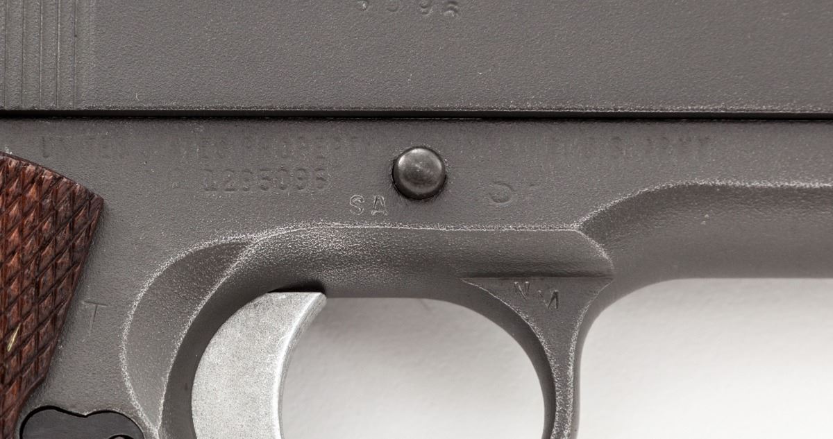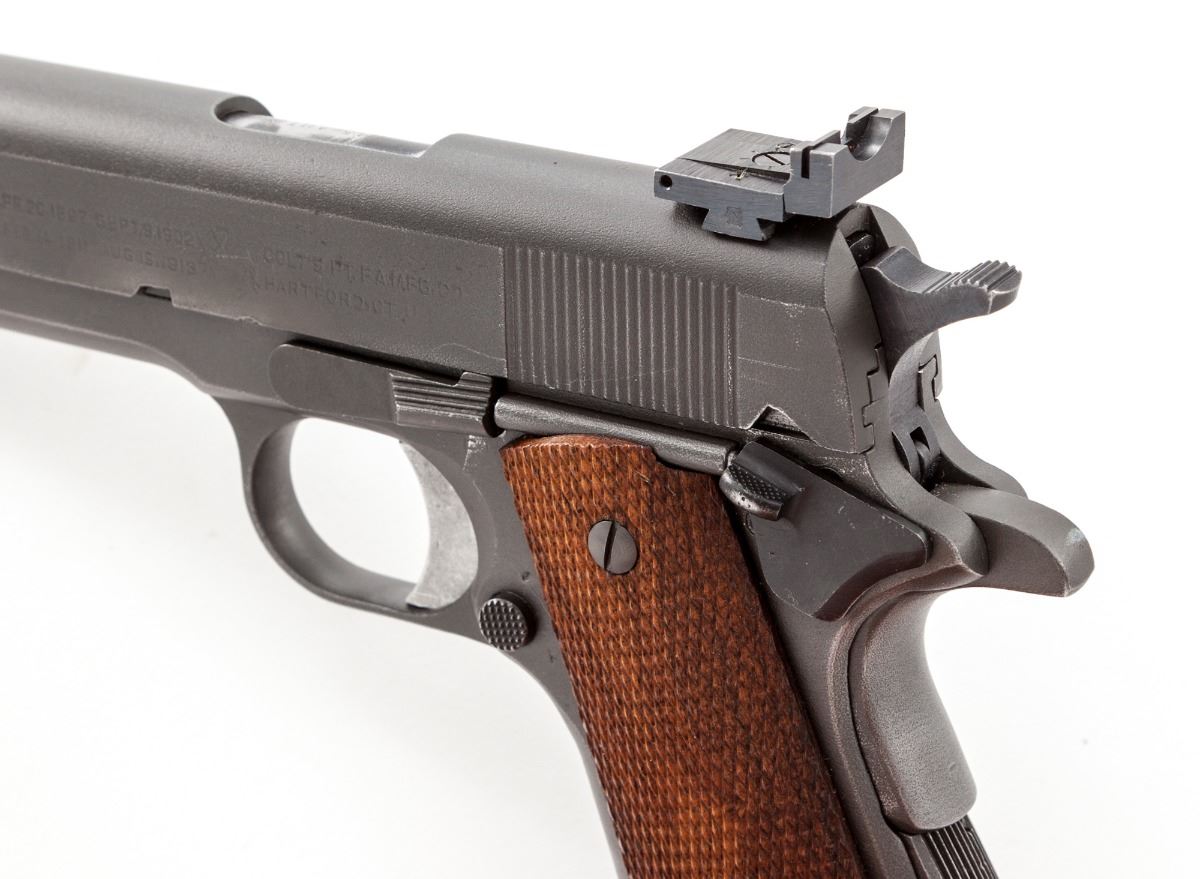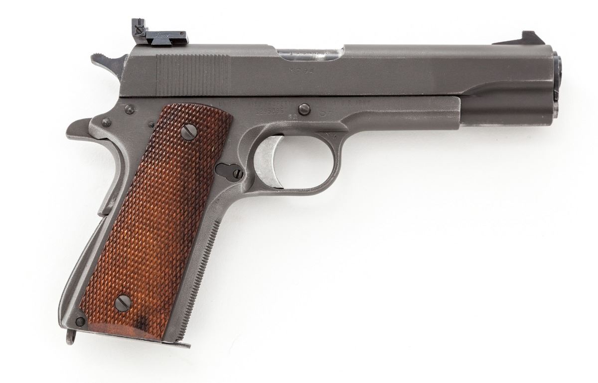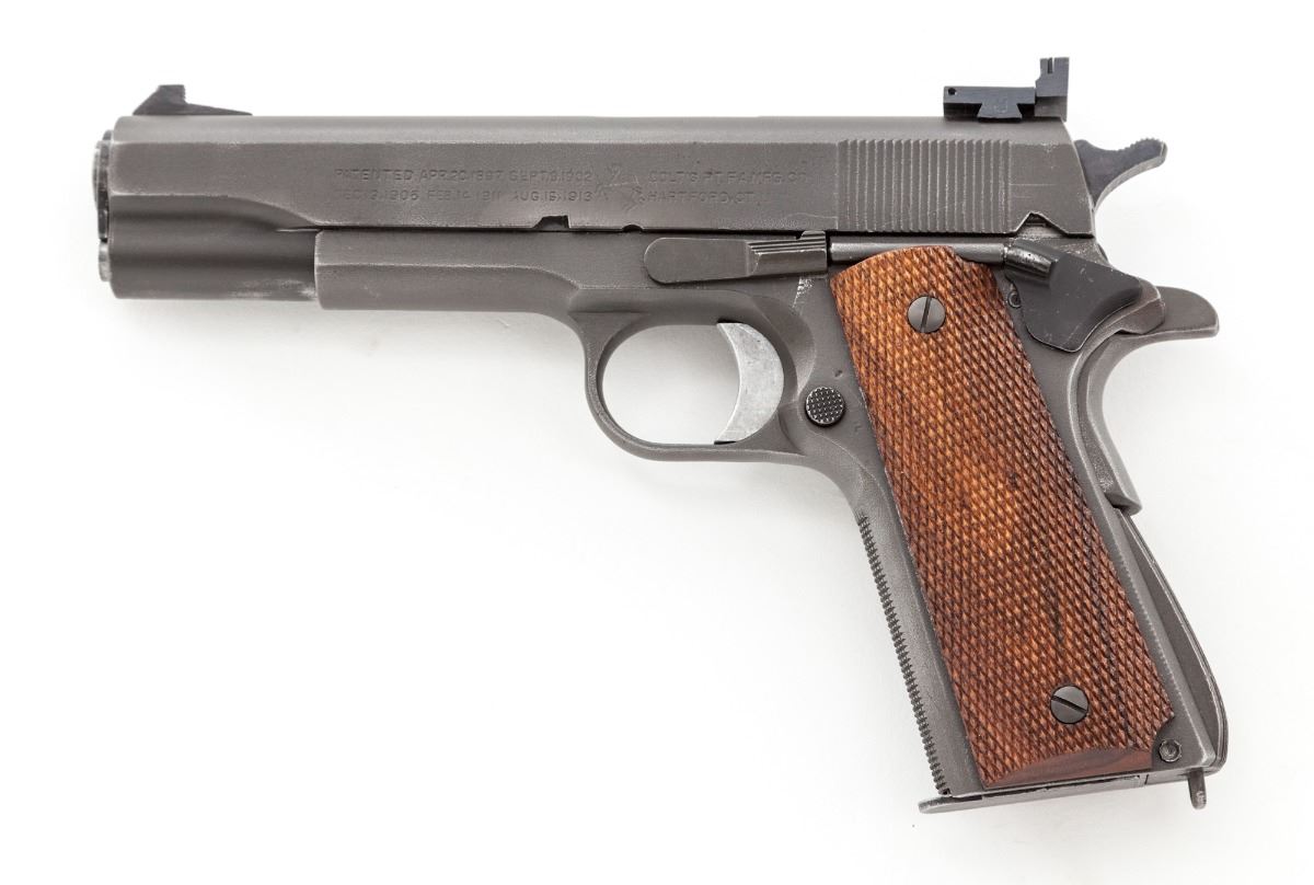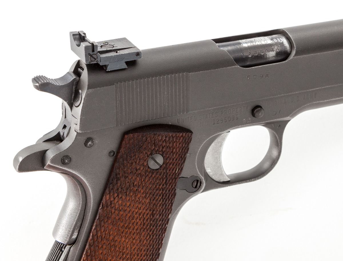 Colt 1962 National Match M1911-A1 Semi-Automatic Pistol, #1295096, .45 ACP cal., 5'' matching numbered Match barrel, parkerized finish, Micro adjustable rear sight, special front sight, checkered front strap, checkered walnut grips. These pistols were modified from existing stock at the Springfield Armory for competition in the National Match Pistol Program. Includes one mag. Condition is excellent as modified and accurized, retaining approx. 95% parkerized finish. Grips are crisp, action is finely tuned, bore is mirror bright. Est.: $1,200-$1,800. (C&R)