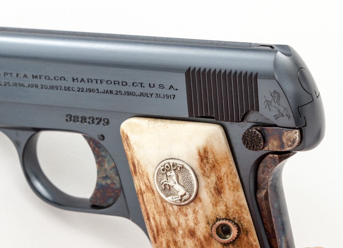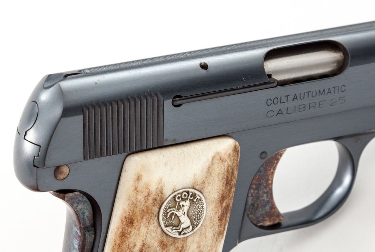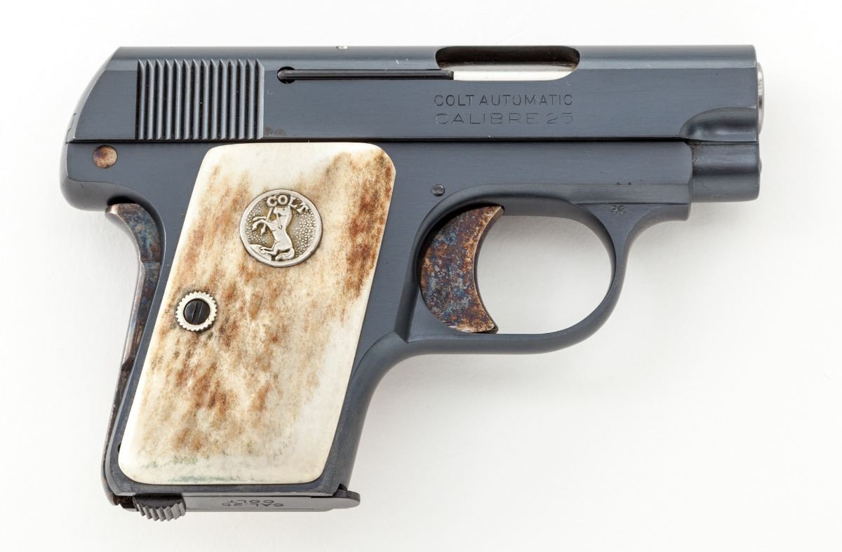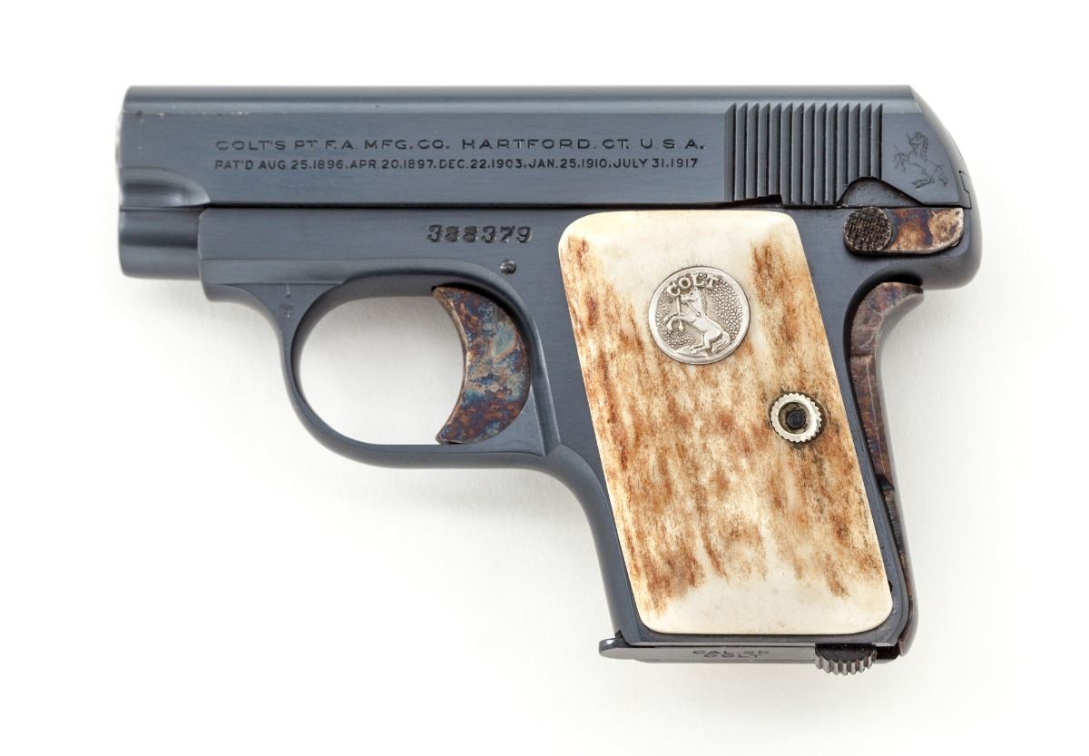 Colt Model 1908 Vest Pocket Hammerless Semi-Automatic Pistol, #388379, .25 Auto cal., 2'' barrel, blue finish, medallion stag grips, with one correct factory magazine. Mfg'd 1930. Condition is excellent with only the lightest traces of wear near muzzle. Extremely vibrant case hardened components. Est.: $1,000-$1,500. (C&R/PPT)