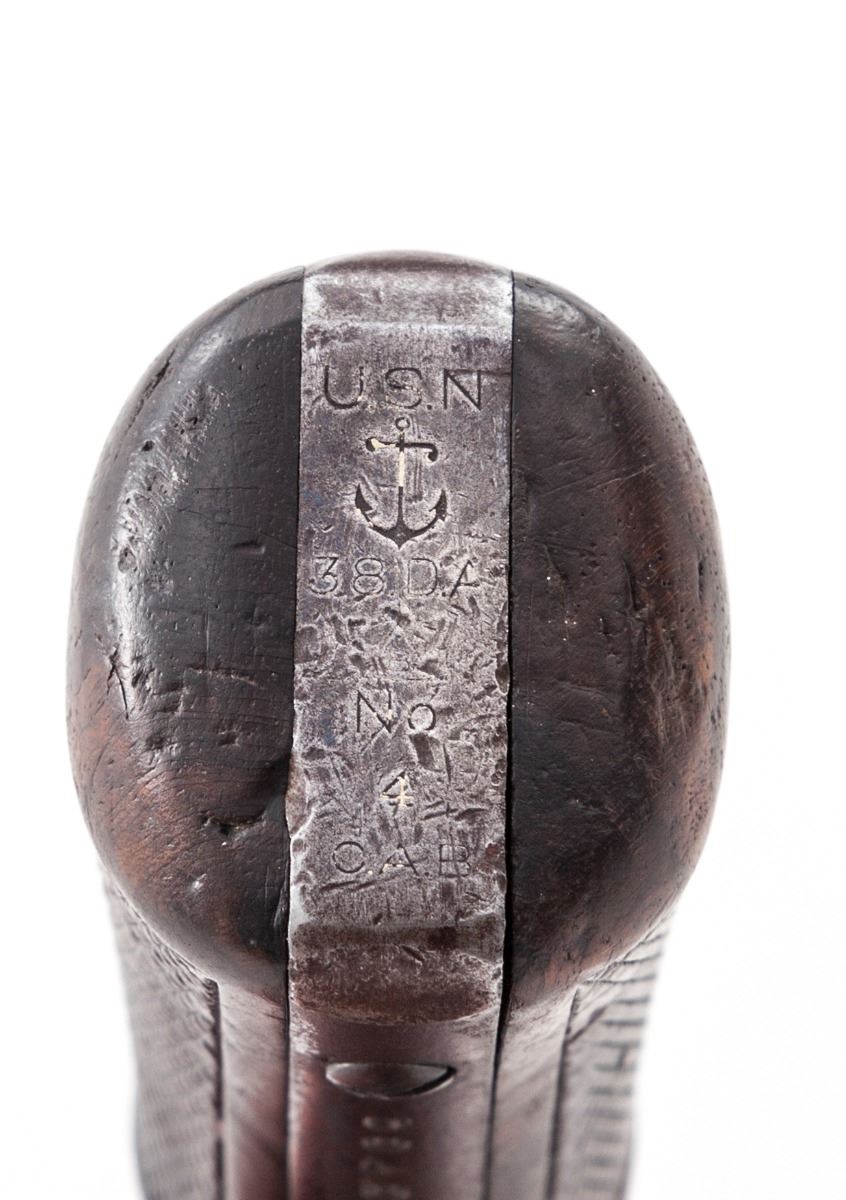 U.S. Navy Model 1899 Smith & Wesson Double Action Revolver, #5040, .38 S&W Spec. cal., 6'' barrel, blue finish, factory checkered diamond walnut grips. Butt area marked ''USN/(anchor)''. U.S. Navy serial number is difficult to discern but may be the number ''4'' over ''OAB'' inspector's markings. Condition is near fine retaining approx. 80%-85% thinning and lightly toning blue. Grips show moderate flattening. Action is crisp, bore is fine. Est.: $800-$1,200. (C&R/PPT)