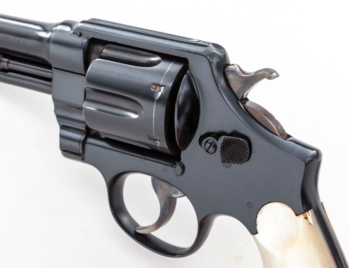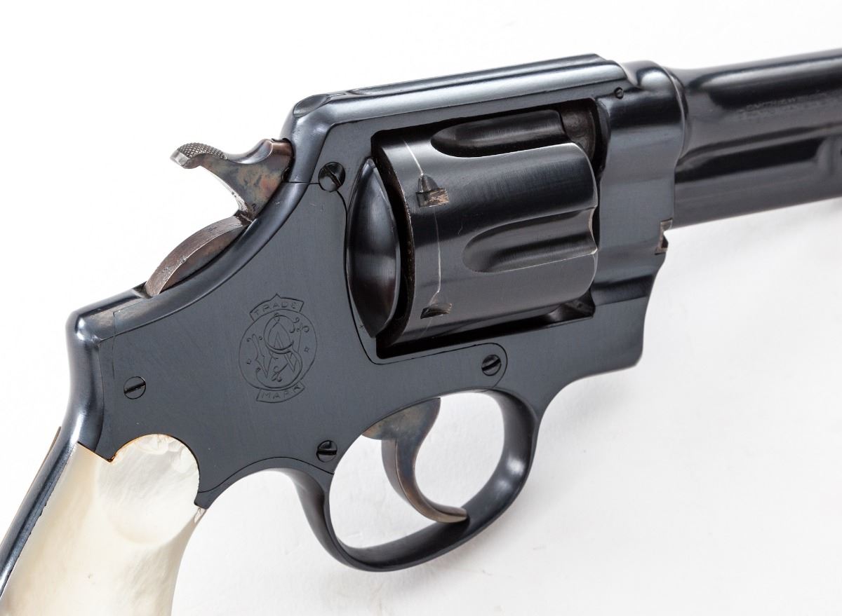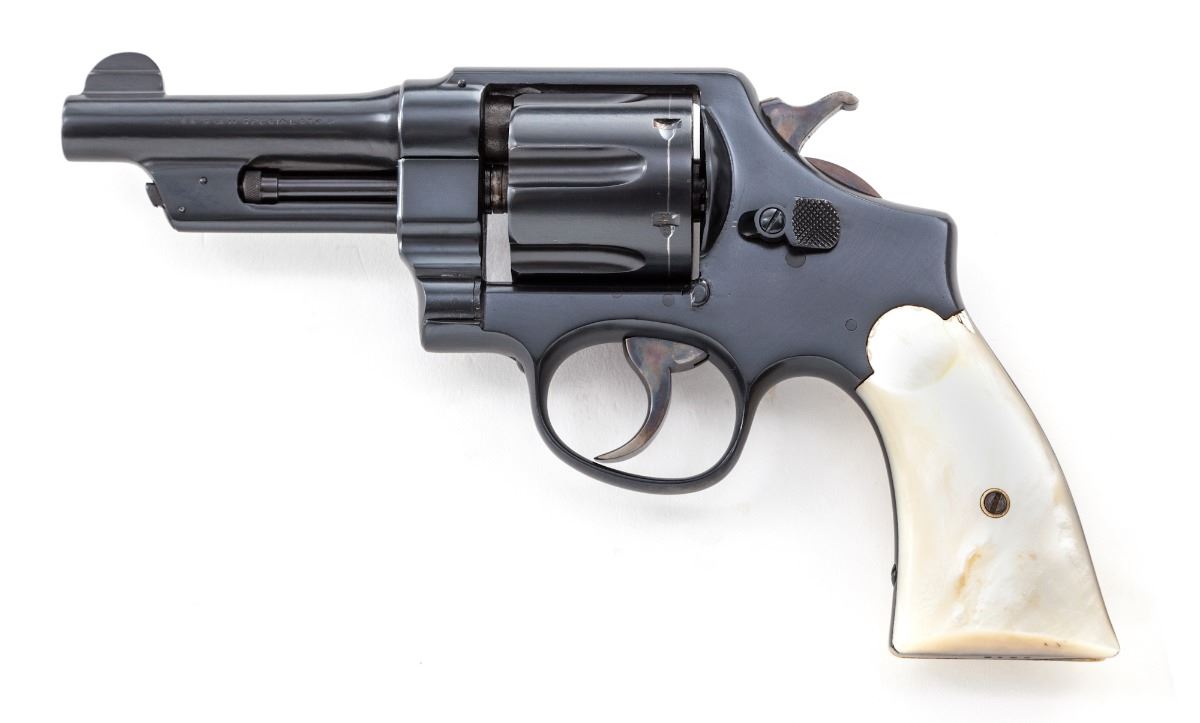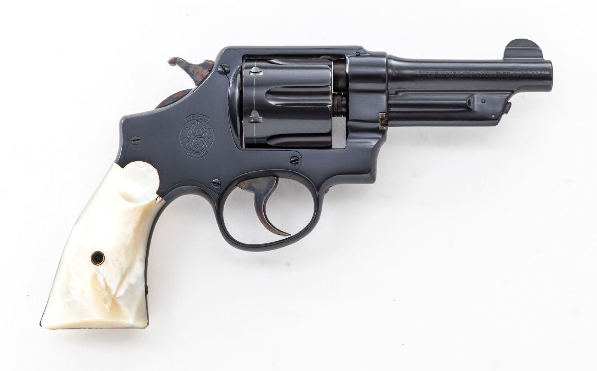 Smith & Wesson 1st Model Triplelock Double Action Revolver, #2318, .44 Spec. cal., 4'' barrel, later blue/black finish, pearl grips. Shipped May 17, 1911, to Cullum Boren Co., Dallas, TX, with factory letter verifying these features. Condition is excellent with well-executed non-factory blue finish, of which approx. 98% is retained. Grips show several very small chips along top edge. Action is crisp, bore is very good. Est.: $2,000-$3,000. (C&R/PPT)