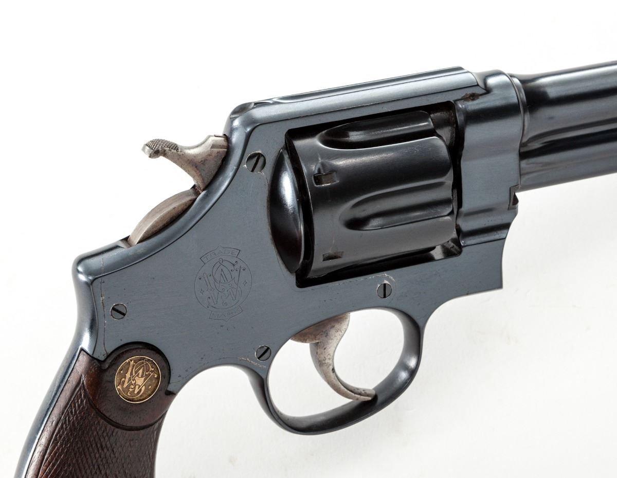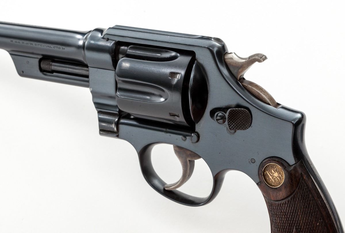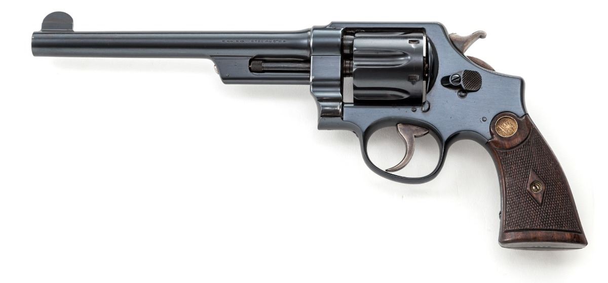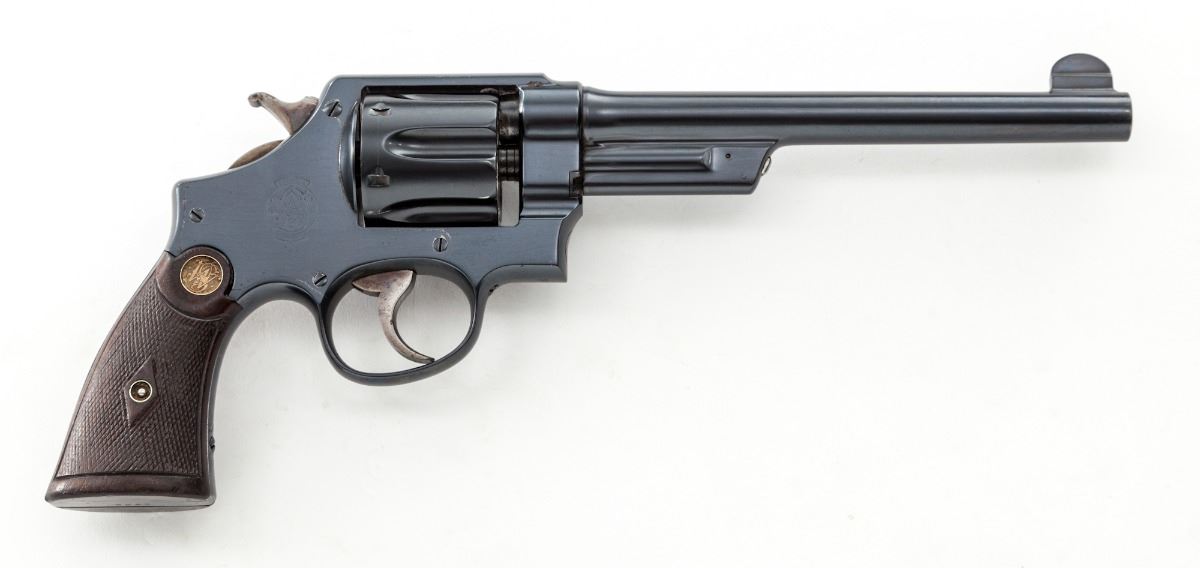 Smith & Wesson 1st Model Triplelock Double Action Revolver, #5097, .44 Spec. cal., 7-1/2'' barrel, later blue/black finish, factory checkered diamond walnut grips with S&W medallions. Shipped June 26, 1911, to Townsend Gun Co., Omaha, NE, with factory letter verifying these features and typo to shipping year. Condition is excellent with well-executed non-factory blue finish, of which approx. 97% is retained, with losses in actioning areas and thinning at high edges. Grips with light to moderate flattening. Action is crisp, bore is fine. Est.: $2,000-$2,500. (C&R/PPT)