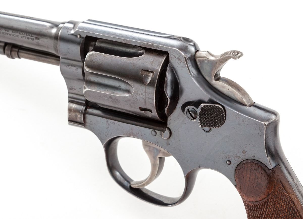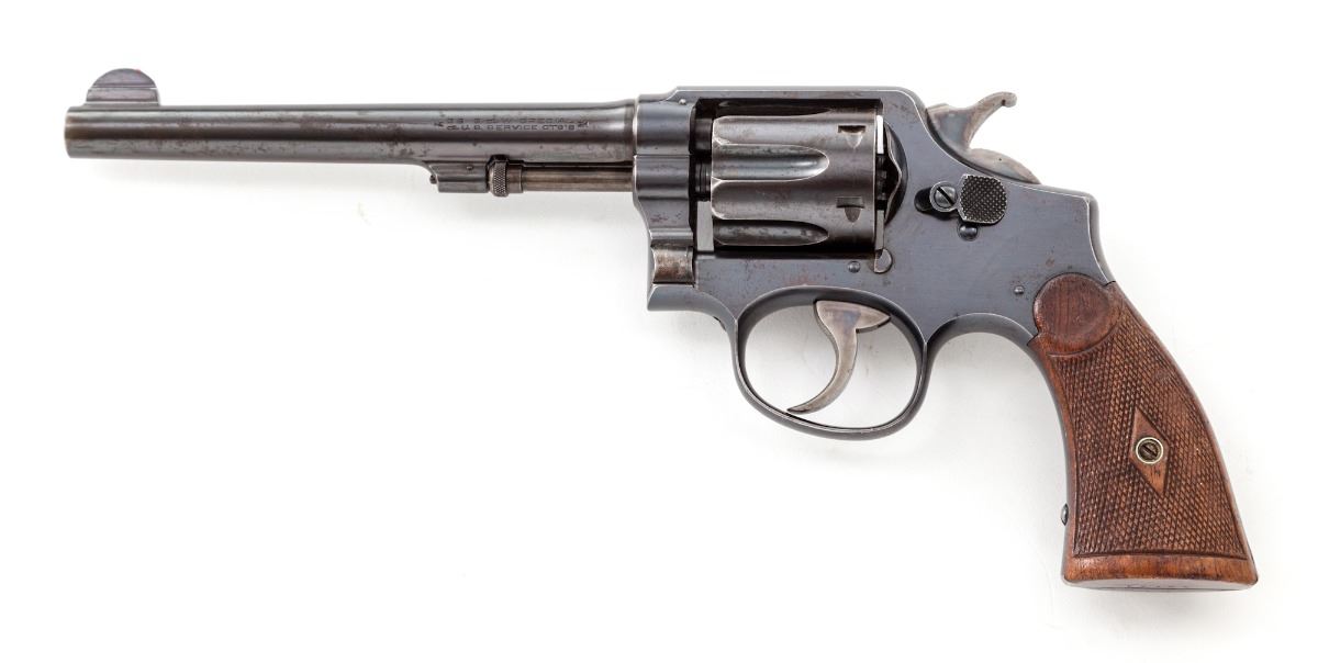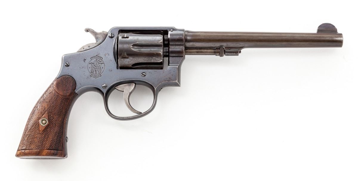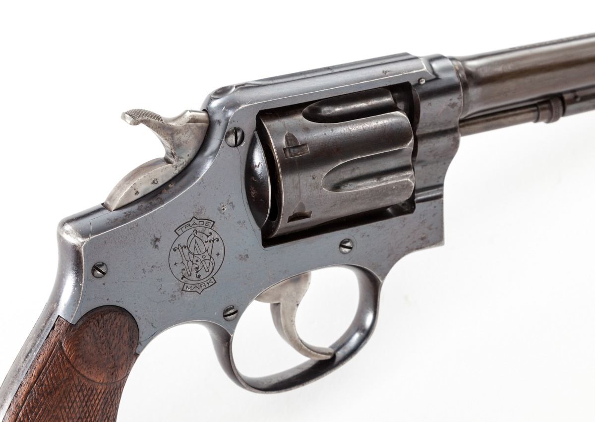 Smith & Wesson Model 1905 Double Action Revolver, #74741, .38 Spec. cal., 6-1/2'' barrel, blue finish, factory checkered walnut grips. Condition is very good retaining approx. 85% blue with most of the losses as thinning and toning to right side of barrel. Grips show mild wear. Action is good, bore is bright. Est.: $450-$650. (C&R/PPT)