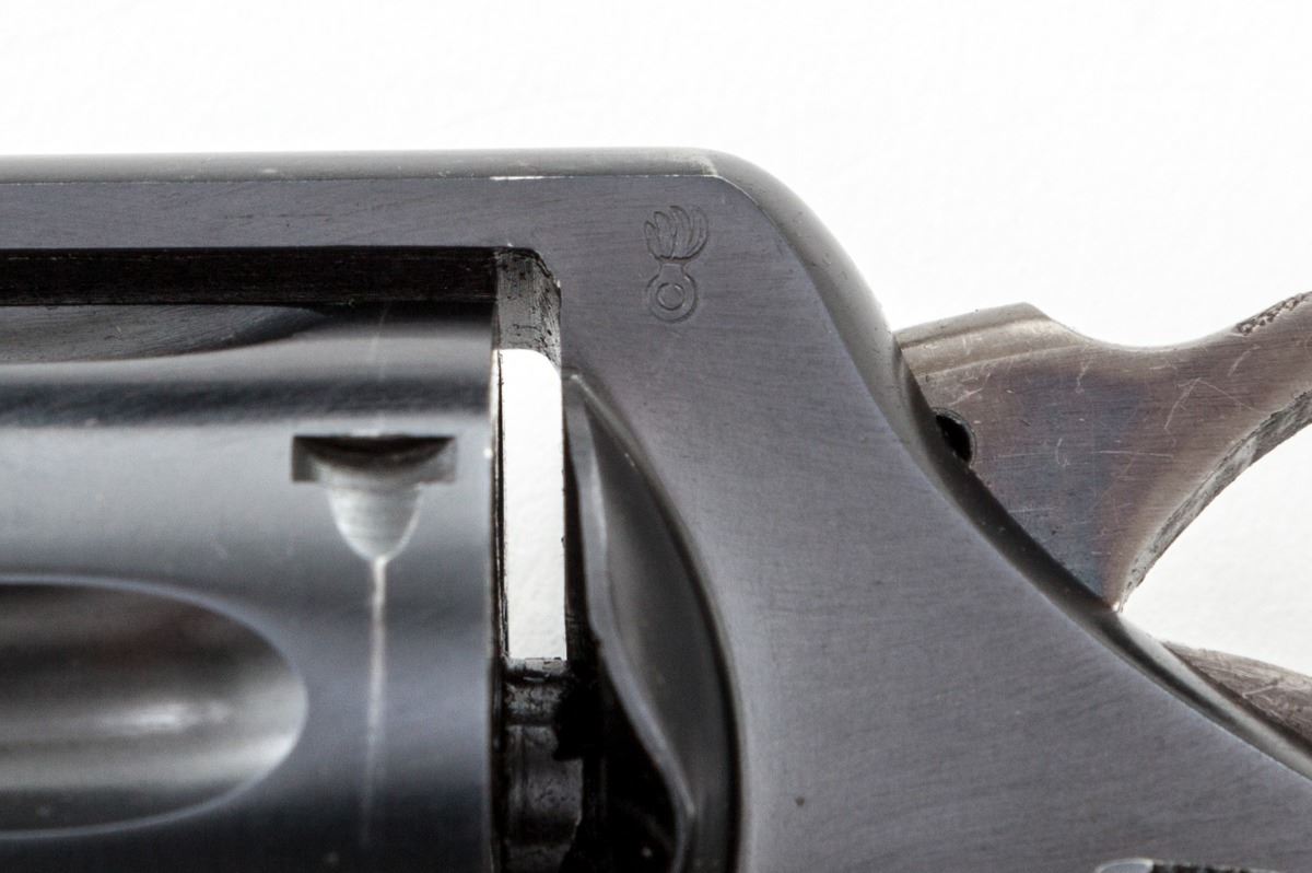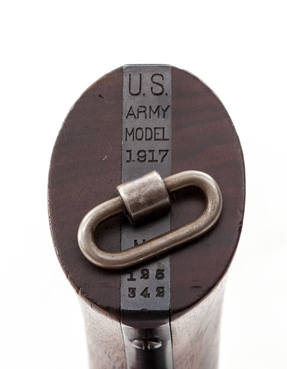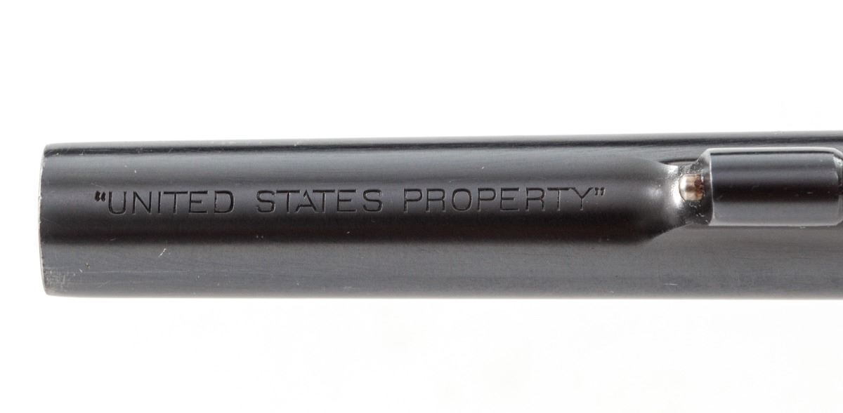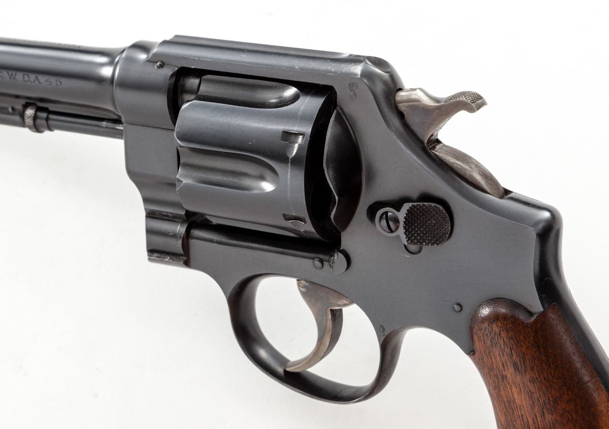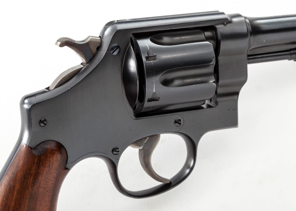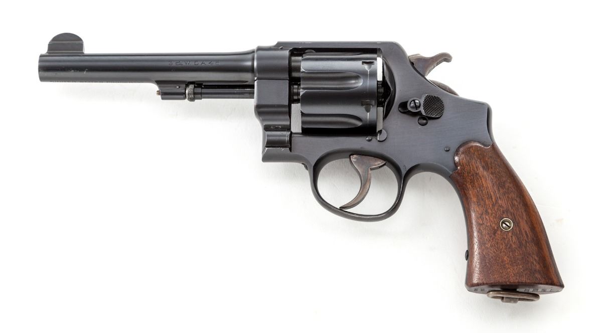Smith & Wesson Model 1917 Double Action Revolver, #125342 on butt, #94415 on crane, .45 ACP cal., 5-1/2'' barrel, blue finish, smooth walnut grips. Mfg'd 1917-1918. Condition is excellent retaining approx. 97% blue, with light micro-scratching and minimal wear to high edges. Grips with very light impressions. Action is crisp, bore is mirror bright. Est.: $1,200-$1,800. (C&R/PPT)