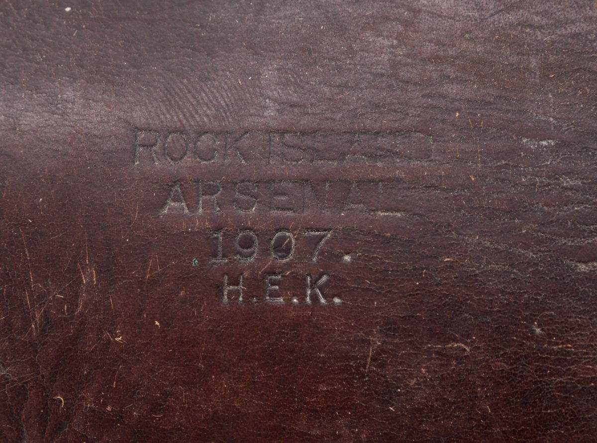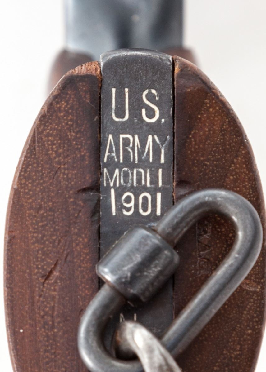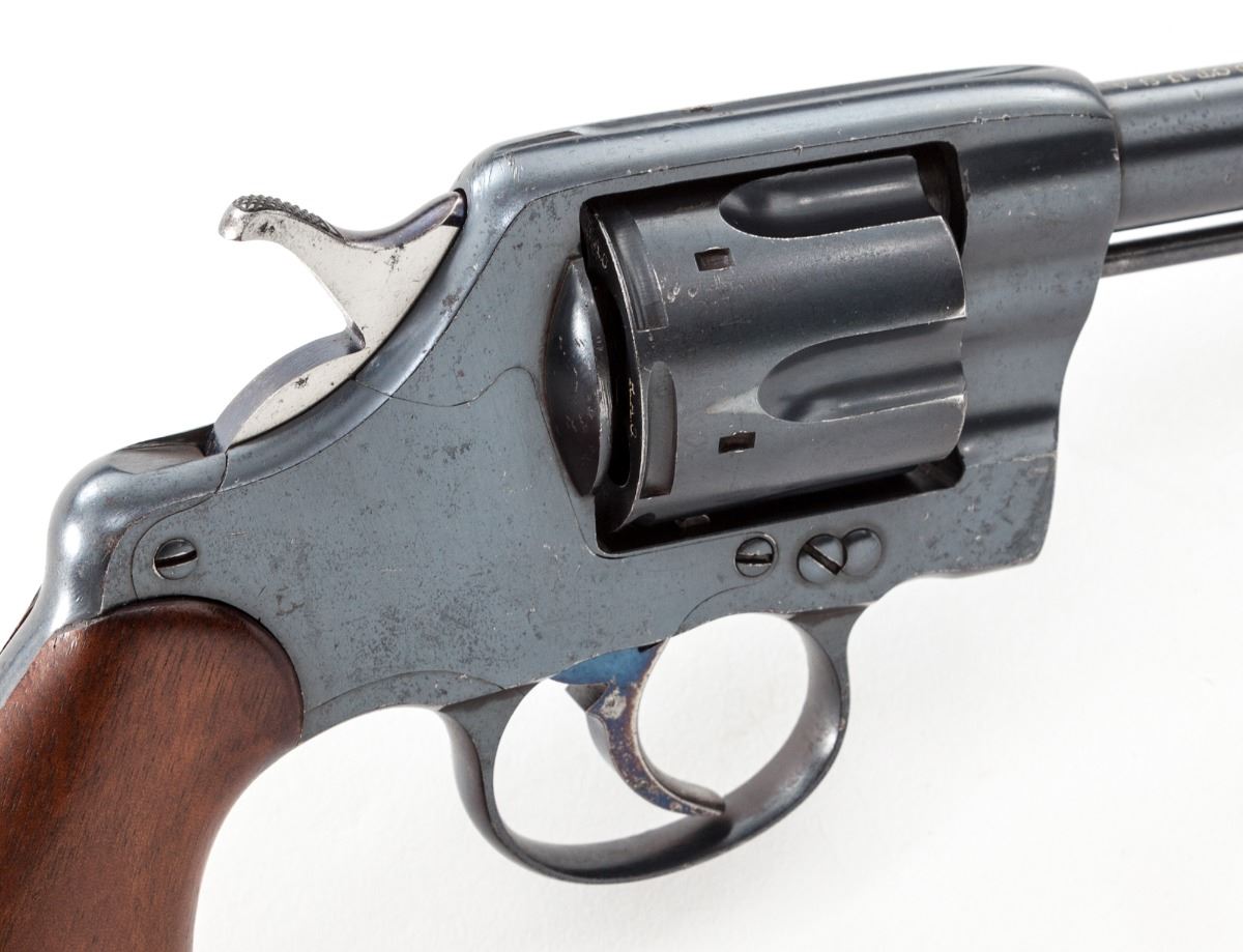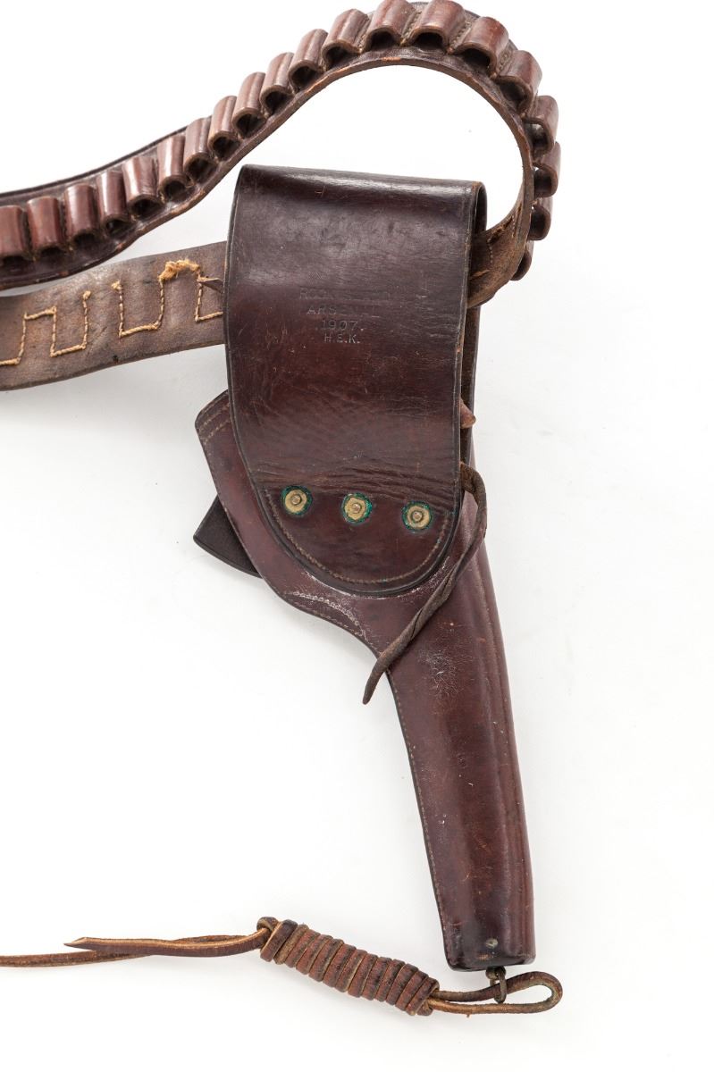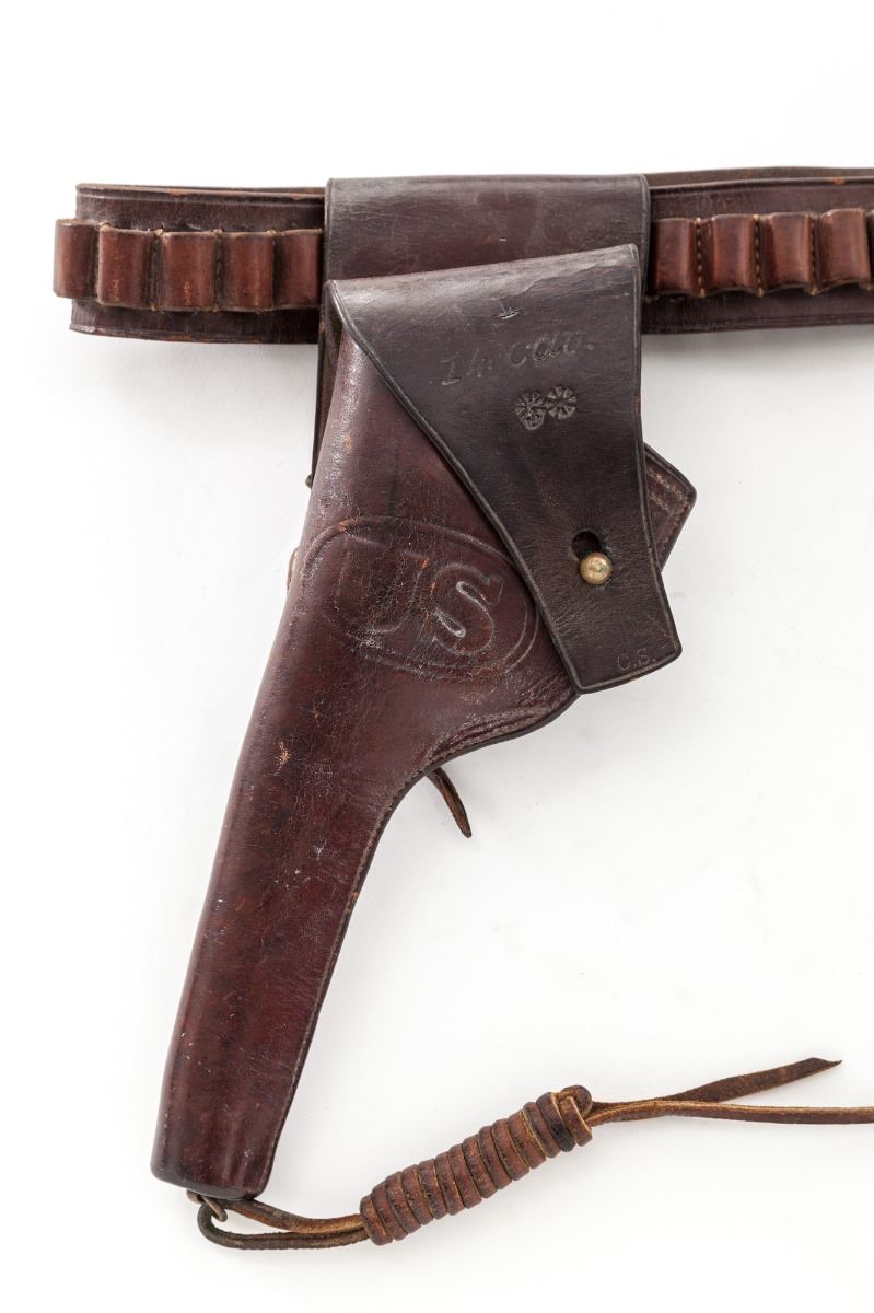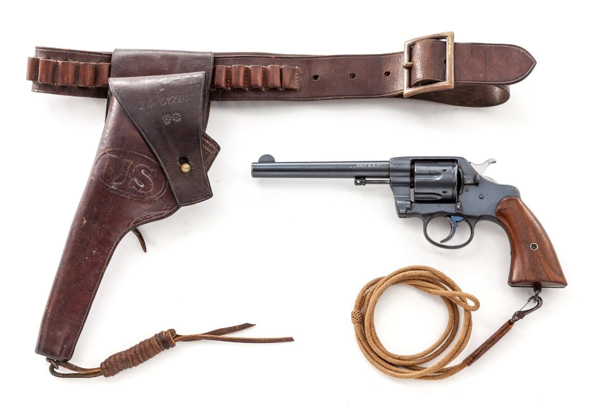 Colt Model 1901 U.S. Army Double Action Revolver, #152239 on butt, #2239 on frame, .38 Colt cal., 6'' barrel, blue finish, smooth walnut grips with RAC inspector marks, in 1907 dated Rock Island holster with 14 Cav. markings to flap, early matching leather belt with brass buckle, and 1905 dated Rock Island marked lanyard. Condition is excellent retaining approx. 97% lightly thinning arsenal blue. Spine of hammer and trigger show 80% vivid niter-blue hues. Grips with only light marks from handling and clear cartouche to butt of left panel. Action remains crisp with tight lockup, bore is bright. Belt shows some soiling; holster with moderate crazing to body. Est.: $2,500-$3,500. (C&R)