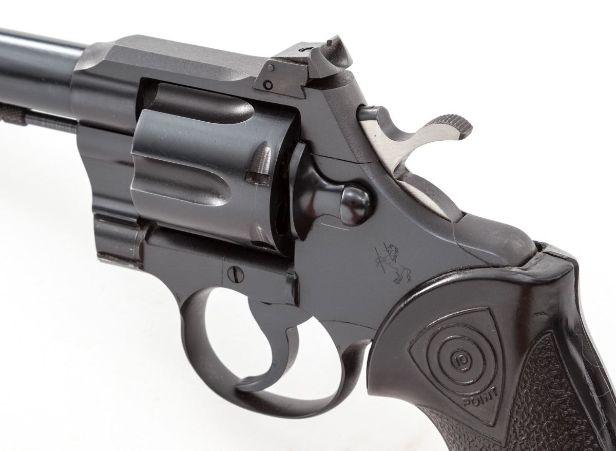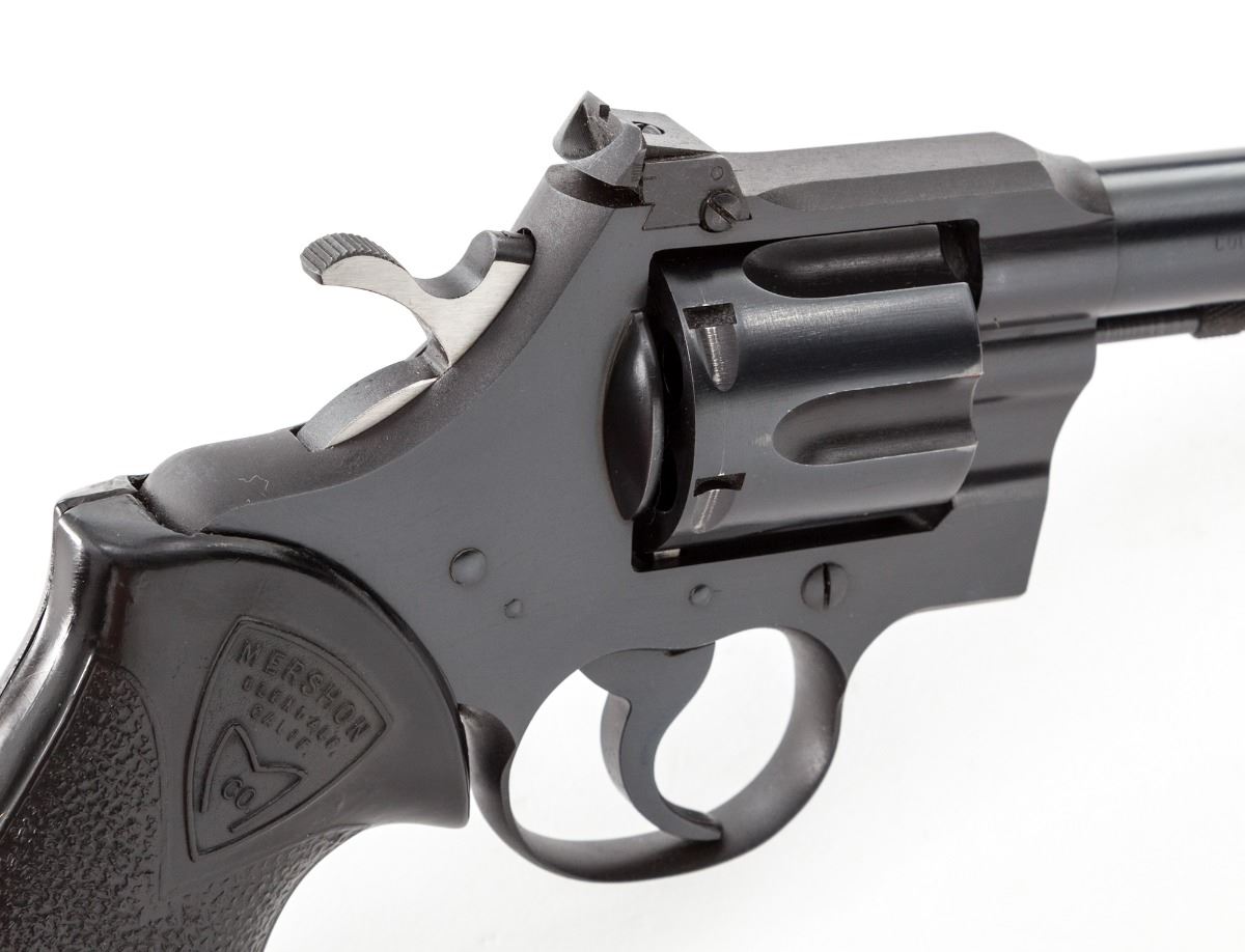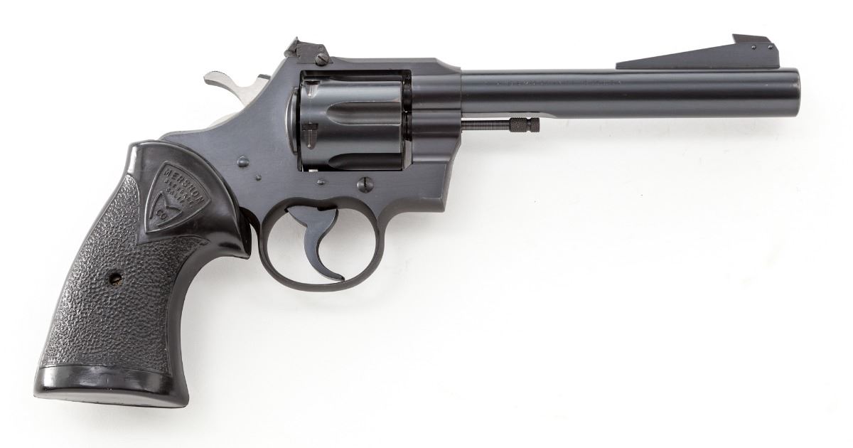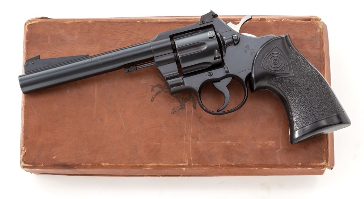 Colt Officer's Model Special Double Action Revolver, #787006, .38 Spec. cal., 6'' heavy barrel, blue finish, Mershon's 10-point black plastic target grips, in original Colt box. Mfg'd approx. 1950. Condition is excellent showing light wear with some discoloration to bright crown area at muzzle. Cylinder with very faint index mark. Grips and action are good, bore is bright. Box with some discoloration to lid and label. Est.: $600-$800. (C&R/PPT)