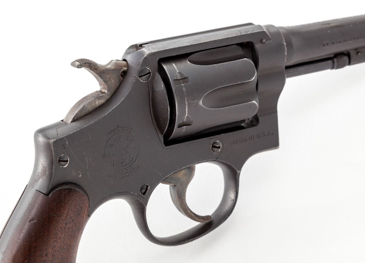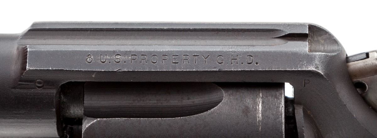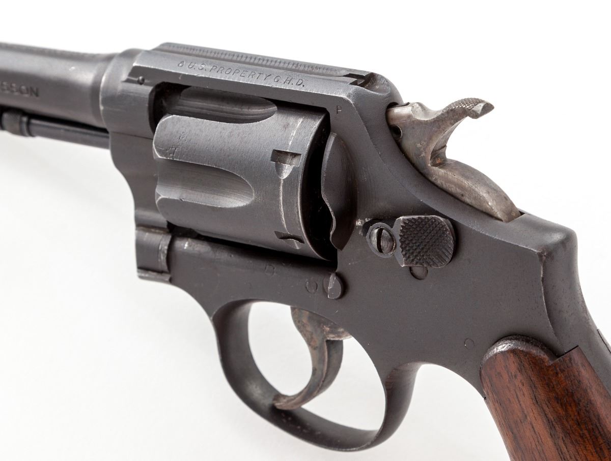 Smith & Wesson Victory Model Double Action Revolver, #SV324302, .38 Spec. cal., 4'' barrel, dulite finish, smooth walnut grips, with lanyard loop in butt. Shipped to the U.S. Navy, Norfolk, VA, on May 28, 1943. Factory letter states it had a midnight black finish. Top strap is marked U.S. Property GHD''. Condition is near excellent retaining approx. 95% finish with light thinning and high edgewear. Grips with oil darkening and minor scuff. Action is good, bore is bright. Est.: $750-$1,000. (C&R/PPT)