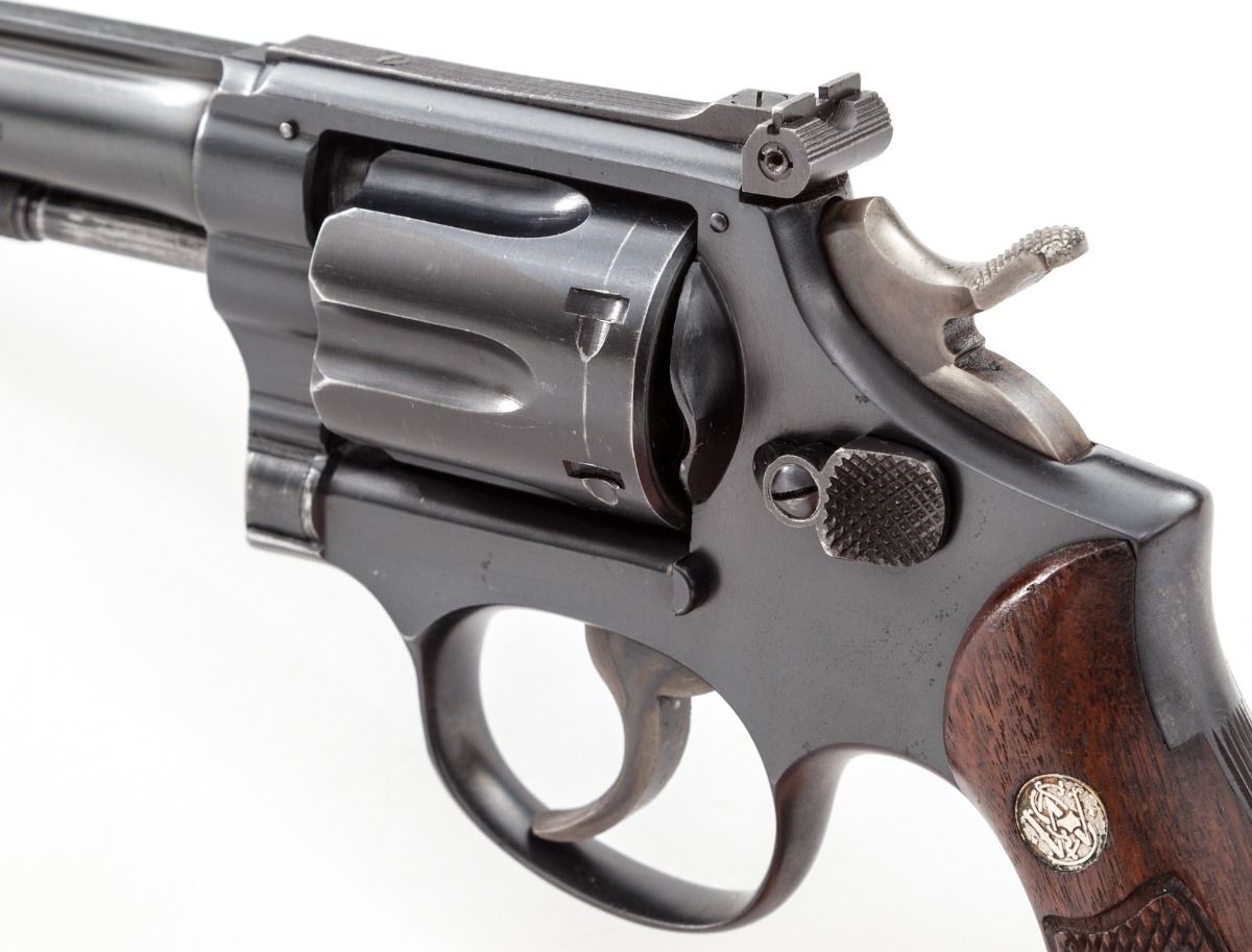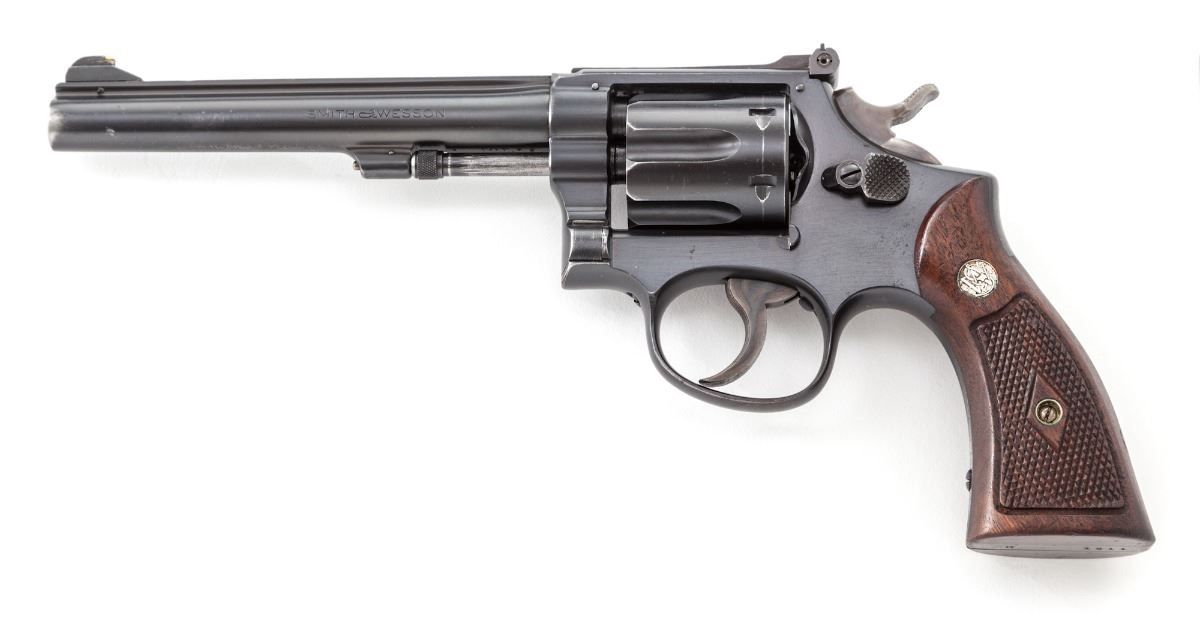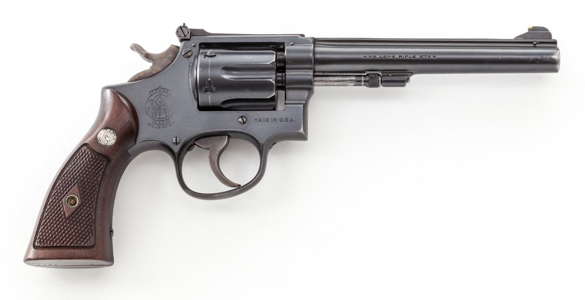 Post-War Smith & Wesson K22 Double Action Revolver, #K1611, .22 LR cal., 6'' barrel, blue finish, factory checkered diamond walnut grips with S&W medallions. White bead Patridge front sight with click-adjustable rear sight. Pistol with transitional features including large ejector knob, and ''Made in USA'' markings. Mfg'd approx. 1946. Condition is near excellent retaining approx. 95% blue, with wear at muzzle, forward edges of cylinder, and in actioning areas. Grips with light wear. Action is crisp, bore is bright. Est.: $1,500-$2,000. (C&R/PPT)