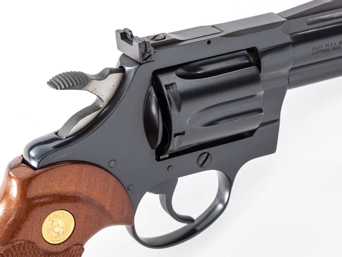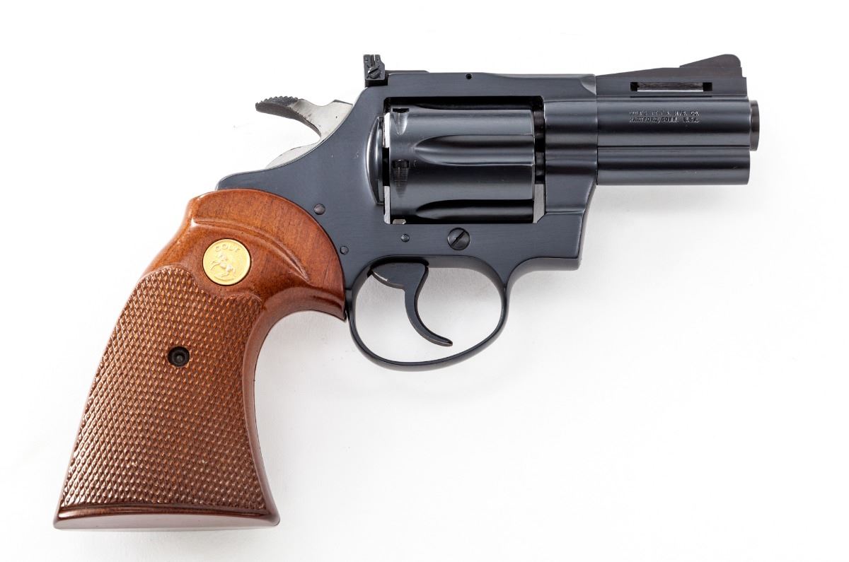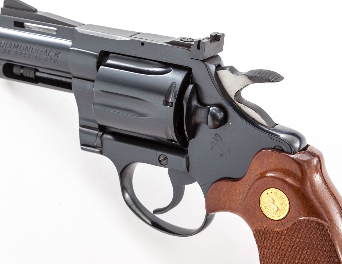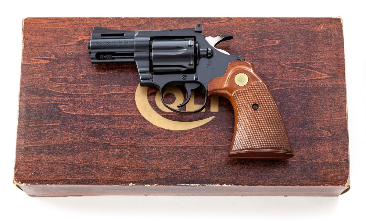 Colt Diamondback Double Action Revolver, #D79262, .38 Spec. cal., 2-1/2'' vent rib barrel, blue finish, factory checkered two-piece walnut grips with gold-inlaid Colt medallions. Mfg'd 1976. Previously owned by Andy Anderson, of the famous Gunfighter's Western Fast-Draw Belts and Holster Shop, who made holster rigs for Clint Eastwood, John Wayne and Steve McQueen. Includes one of his original business cards and sales receipt. Condition is excellent, appearing as new, with only the faintest trace of an index mark to rear portion of cylinder. Grips with crisp checkering and very minor marks. Action is crisp, bore is bright with the exception of moderate scratches near cylinder end. In original factory woodgrian box with matching end label and associated paperwork. Est.: $2,000-$2,500. (Modern/PPT)