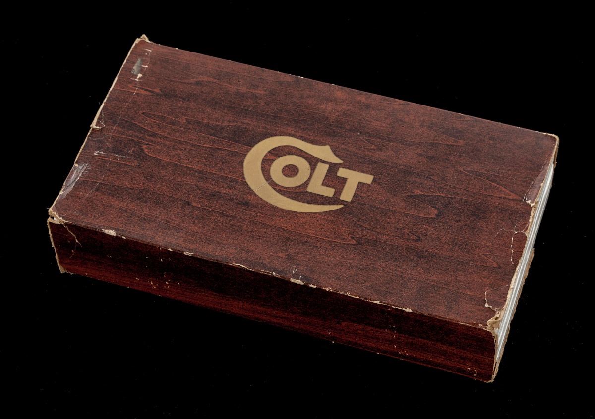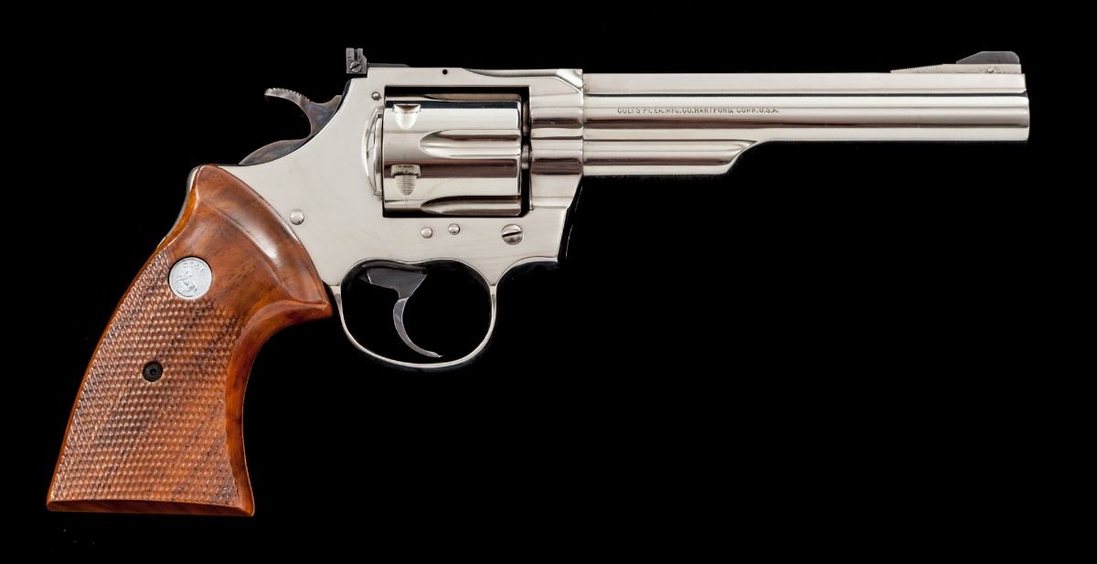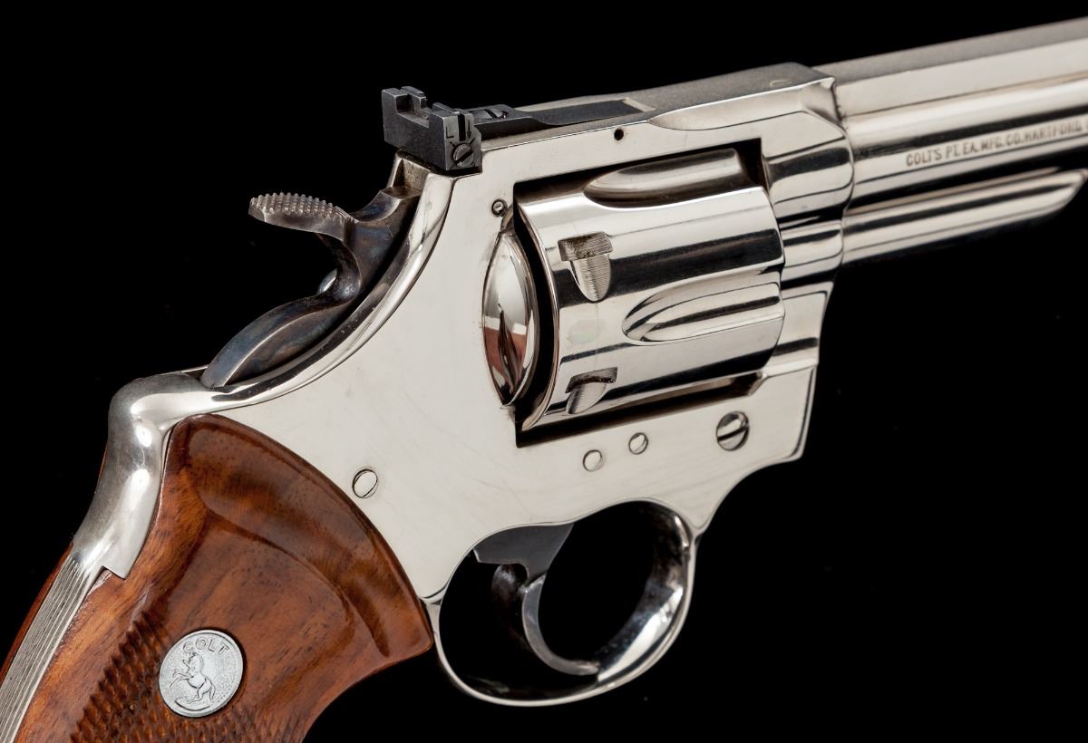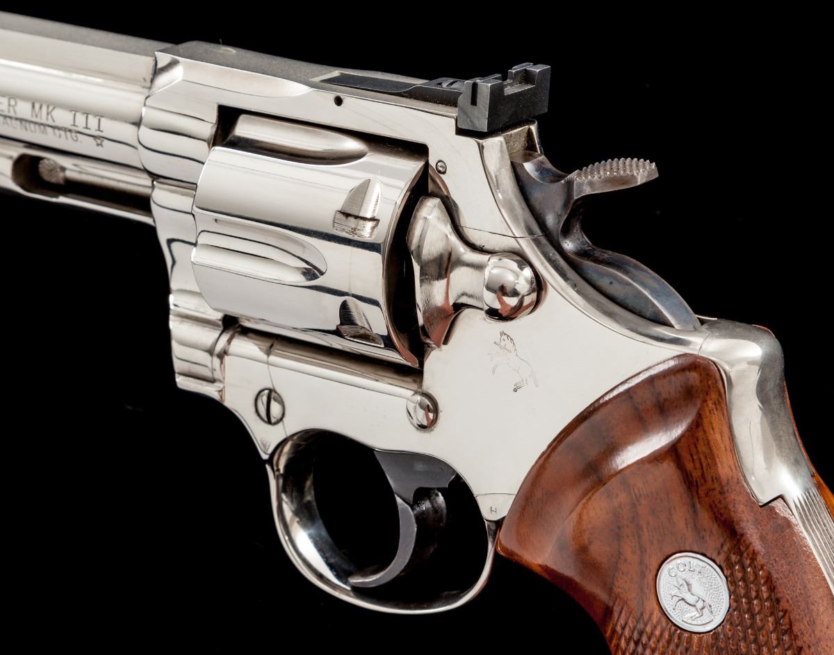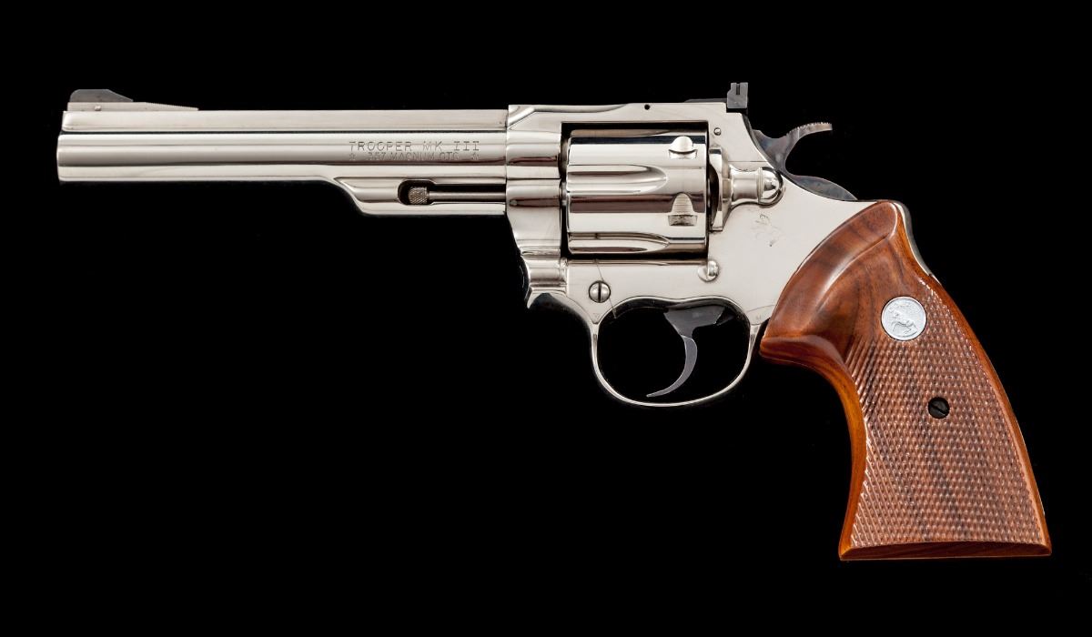 Colt Trooper MK III Double Action Revolver, #L8243, .357 mag. cal., 6'' barrel, nickel finish, factory checkered walnut grips with Colt medallions, in original box with hang tag. Mfg'd 1977. Condition is excellent, appearing as new and unfired, with only light micro-scratching to bright metal surfaces. Box missing end flaps. Est.: $750-$1,000. (Modern/PPT)