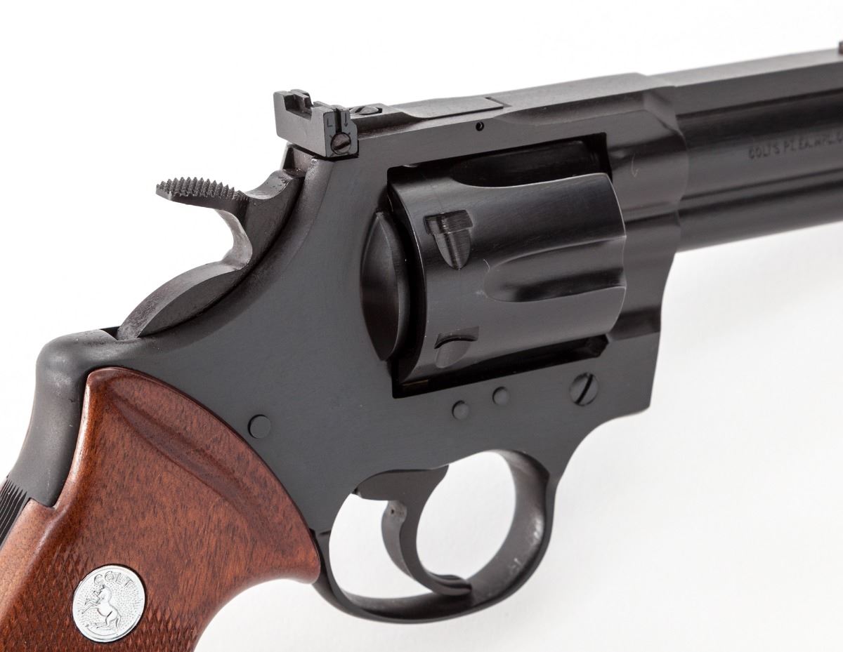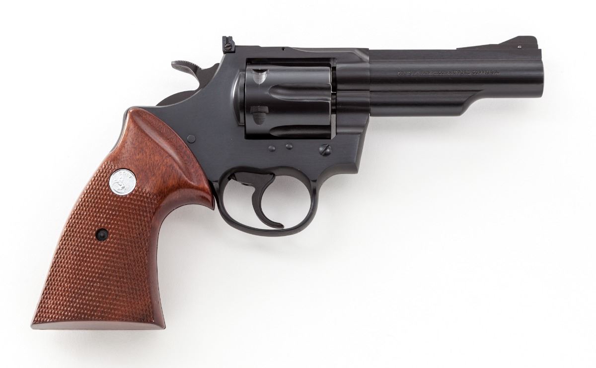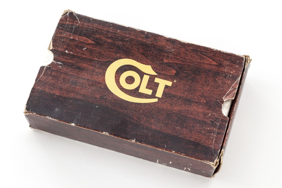 Colt Border Patrol Double Action Revolver, #J71321, .357 mag. cal., 4'' barrel, blue finish, factory checkered hardwood grips with bright Colt medallions. Mfg'd in limited numbers from 1970 to 1975. Condition is excellent, appearing as new, with small nick just below Rampant Colt logo on sideplate, possibly a factory error, as spot remains completely blued. In original box with some losses to Styrofoam; missing paperwork and one end flap to box. Est.: $1,000-$1,500. (Modern/PPT)