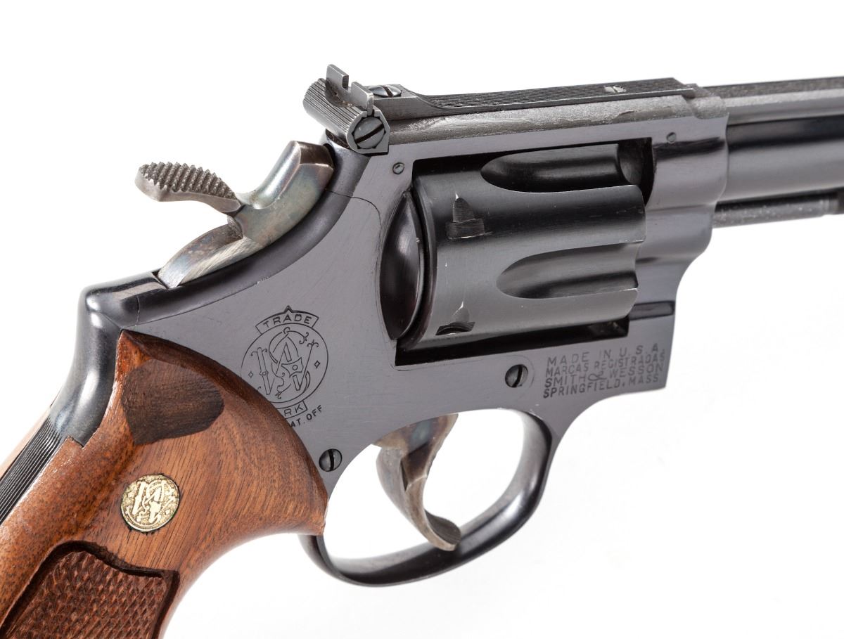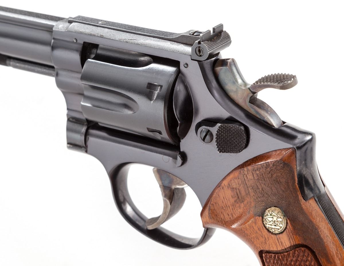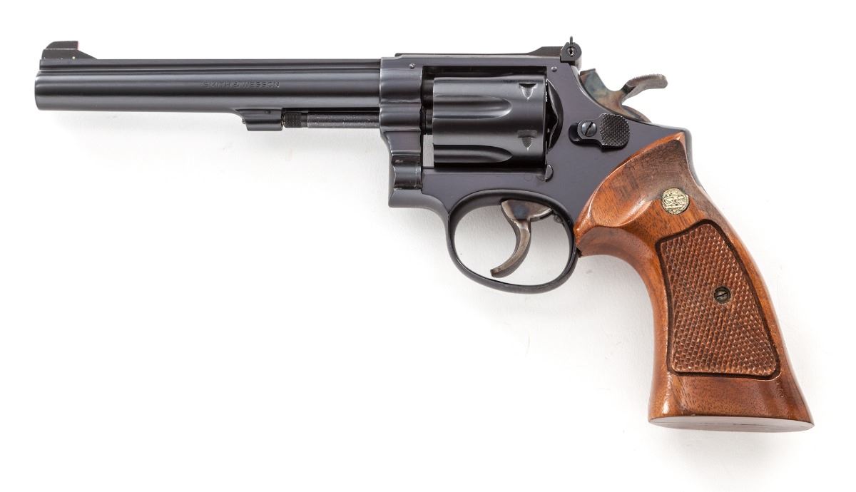 Smith & Wesson Model 17-2 Combat Masterpiece Double Action Revolver, #K555897, .22 LR cal., 6'' barrel, blue finish, factory checkered walnut grips with S&W medallions, with standard adjustable rear sight, Patridge front sight, and pre-1981 pinned barrel. Condition is excellent. Metal surfaces retain approx. 97% blue. Left grip panel has been modified in thumb area. Action is crisp, bore is bright. Est.: $750-$1,000. (Modern)(Not available to Calif. residents.)