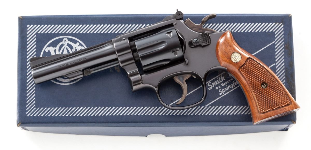 Smith & Wesson Model 18-3 Combat Masterpiece Double Action Revolver, #11K0679, .22 LR cal., 4'' barrel, blue finish, factory checkered walnut grips with medallions, with standard adjustable rear sight and ramp front sight. Condition is excellent showing little use, in original box. Est.: $650-$800. (Modern)(Not available to Calif. residents.)