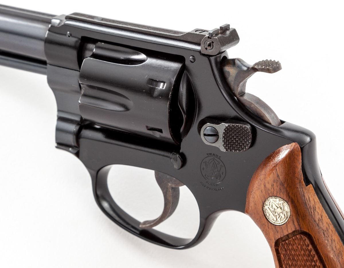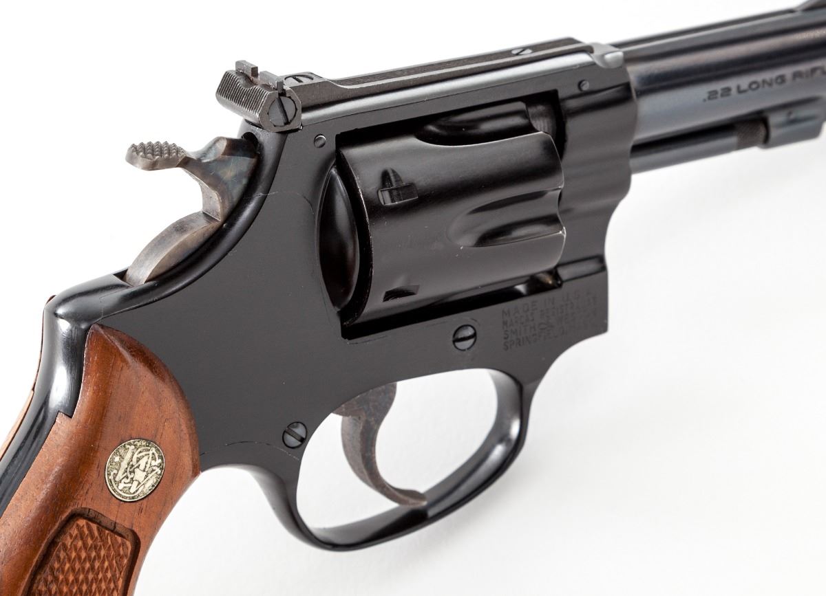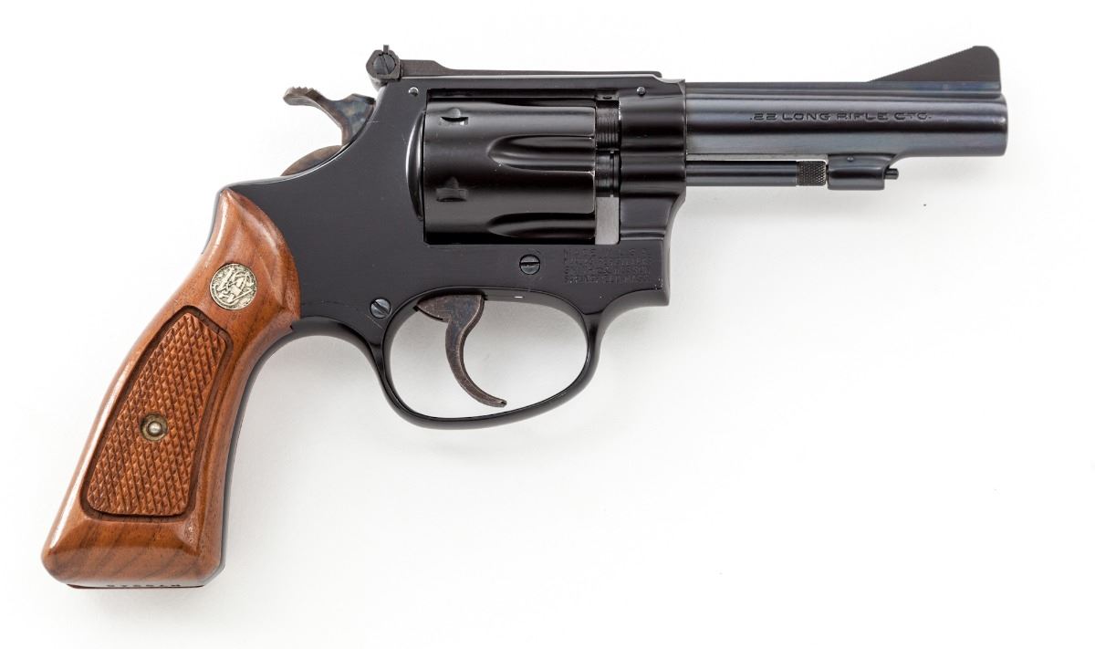 Smith & Wesson Model 43 Lightweight Double Action Revolver, #M79246, .22 LR cal., 3-1/2'' barrel, blue finish, checkered walnut grips, pre-1981 pinned barrel, with standard adjustable rear sight and ramp front sight. Condition is excellent, remaining as new, in original box. Est.: $500-$750. (Modern)(Not available to Calif. residents.)