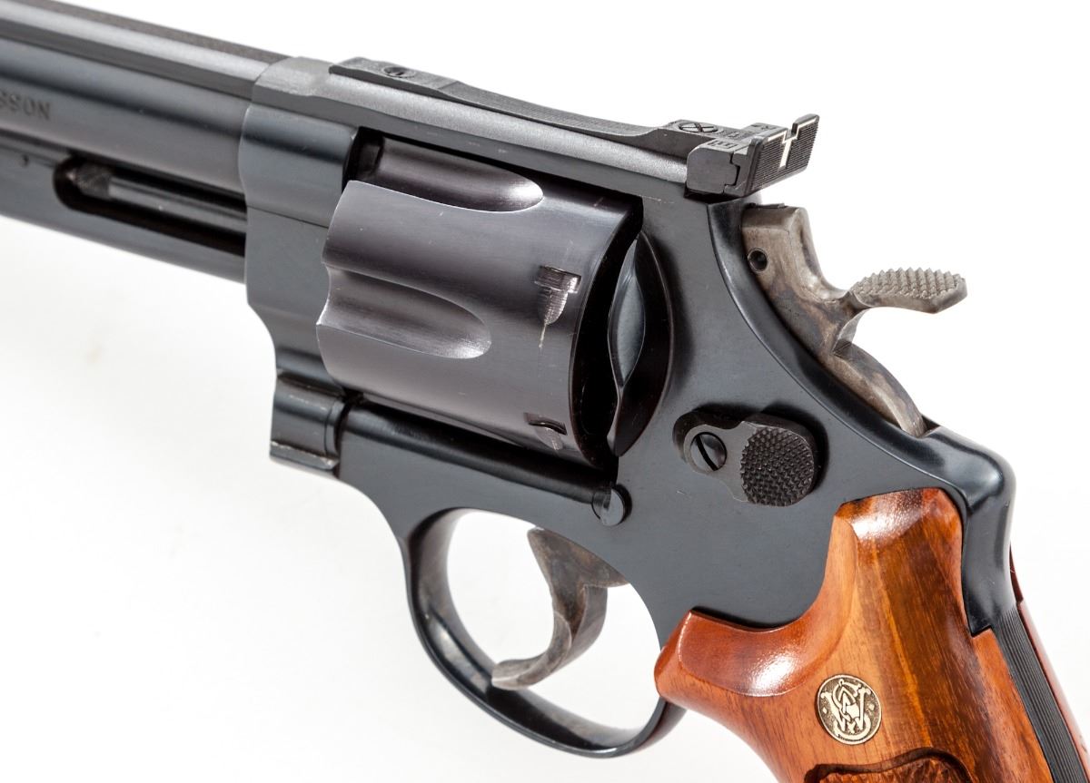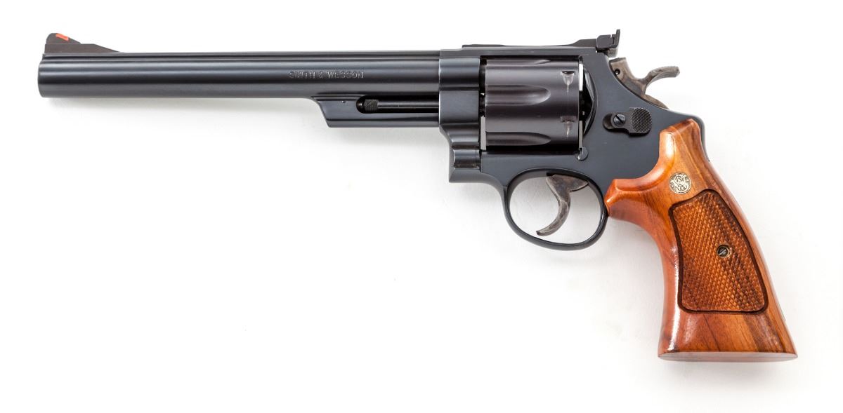 Smith & Wesson Model 29-3 Double Action Revolver, #AZA3614, .44 mag. cal., 8-3/8'' barrel, blue finish, factory checkered medallion hardwood target grips, with red ramp front and Millett rear sight. Condition is excellent showing light index mark to cylinder. Crisp grips and action, mirror bright bore. Est.: $750-$1,000. (Modern/PPT)