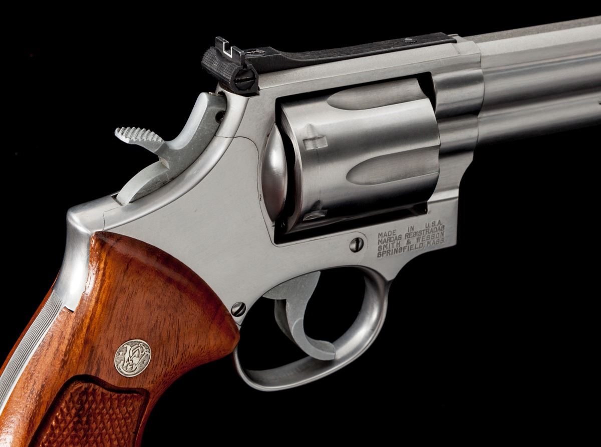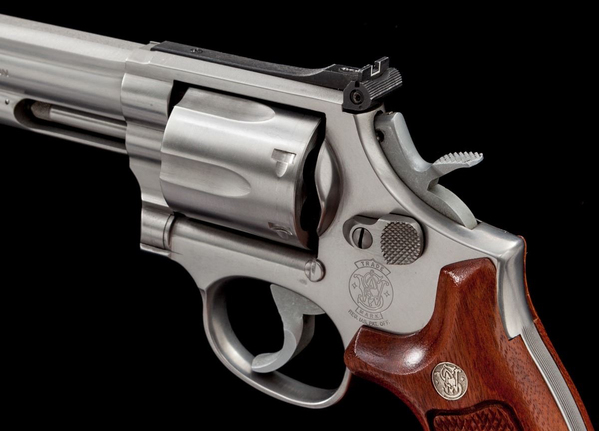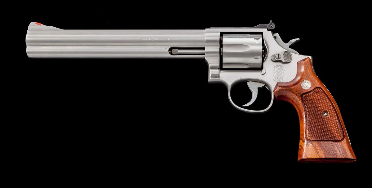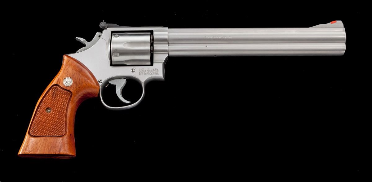 Smith & Wesson Model 686 Double Action Revolver, #AJV0588, .357 mag. cal., 8-3/8'' barrel, stainless steel, factory checkered target medallion hardwood grips, with red ramp and white outline sights, in original box. Mfg'd in the 1980s. Condition is excellent showing only the lightest marks from handling. Grips are very crisp, action is tight, bore is mirror bright. Est.: $500-$750. (Modern/PPT)