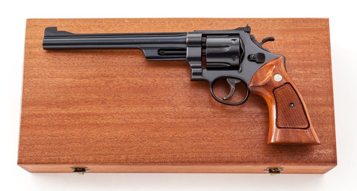 Smith & Wesson Model 27-2 Double Action Revolver, #N375817, .357 mag. cal., 8-3/8'' barrel, blue finish, factory checkered walnut target grips with medallions, with Patridge front and standard rear sights; target hammer, target trigger, pre-1981 pinned barrel, in blue lined mahogany presentation case, with screwdriver, cleaning rod, and accessories. Instructions and associated paperwork are beneath lining panel. Condition is excellent showing only the lightest index mark to cylinder. Grips and action are crisp, bore is bright. Revolver may be unfired. Est.: $1,000-$1,500. (Modern/PPT)