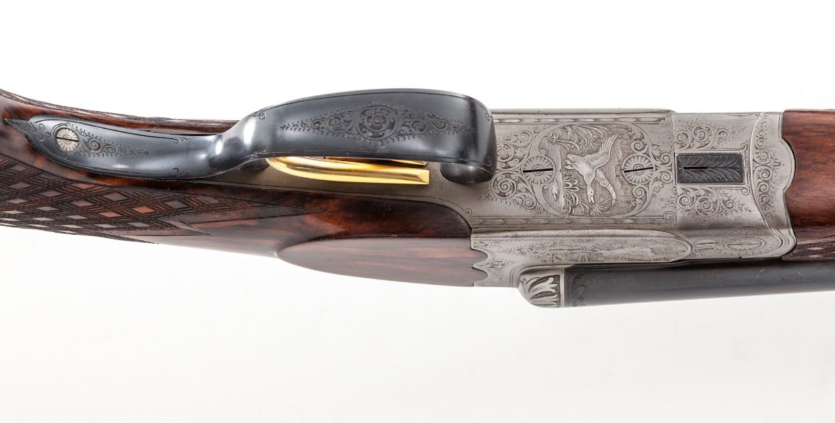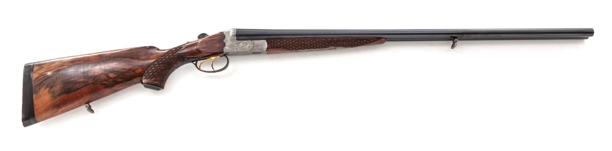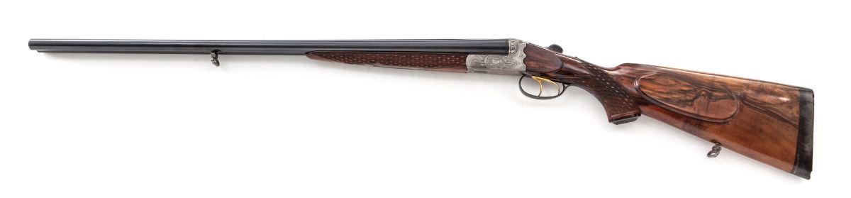 Ludwig Borovnik Scalloped Frame Side-by-Side Boxlock Shotgun, for Waffen Dschulnigg-Salzburg, #40.2592, 20 ga., 2-3/4'' chs., 27-3/4'' blue barrels with tapering 3/8'' concave matted rib, original front steel bead and later middle brass bead; chokes are Mod./IM., with gold-plated double triggers, ejectors and automatic top tang safety. The single crossbolt coin-finished frame features three forest game scene panels with scroll engraved borders and deep foliate engraving on the fences; barrels and frame have 1966 date stamps with Ferlach nitro proofs. The pistol-grip stock and splinter forend are darkly streaked Circassian walnut, having a small hunting cheekpiece and horn pistol-grip cap, with recessed-border skipline checkering. Length of pull is 14-3/4'' over a 1'' horn buttplate; sling swivels are 3/4'', weight is 6-1/4 lbs. Mechanical condition is excellent with indications of light use. Blue and coin finish are 98% with faint oxidation and staining on frame; stock and forend have scattered small handling marks with two areas of chipping on the buttplate and oxidation on the screw heads. Bores are bright. Est.: $1,800-2,400. (C&R)