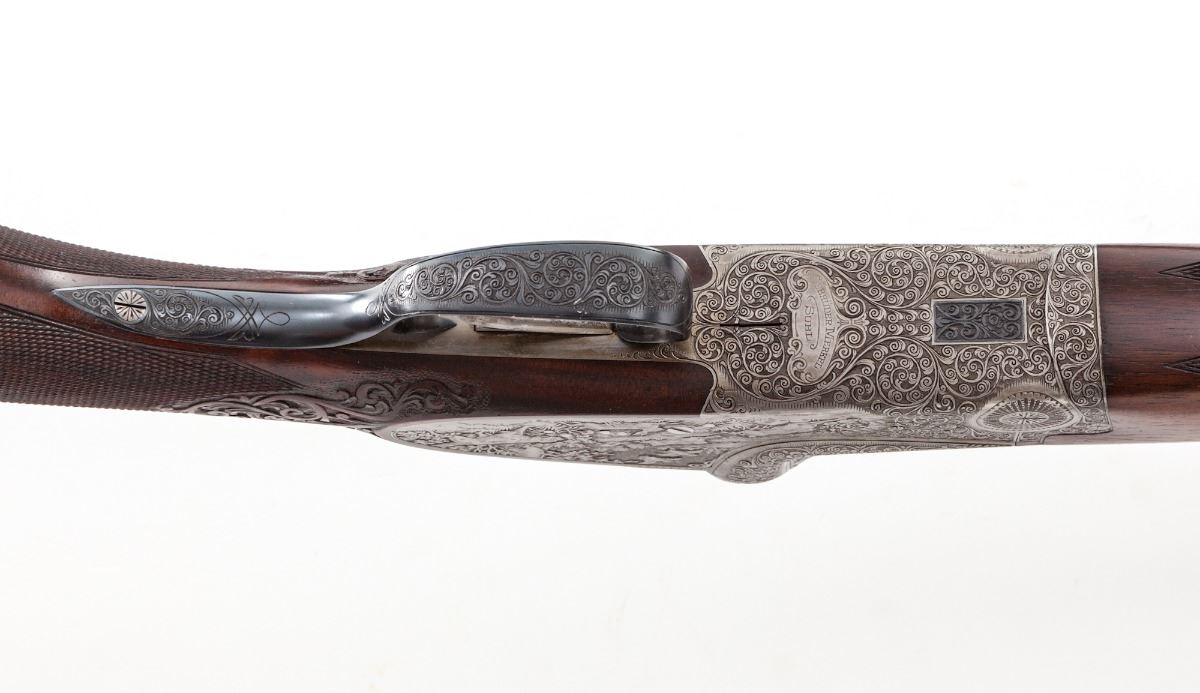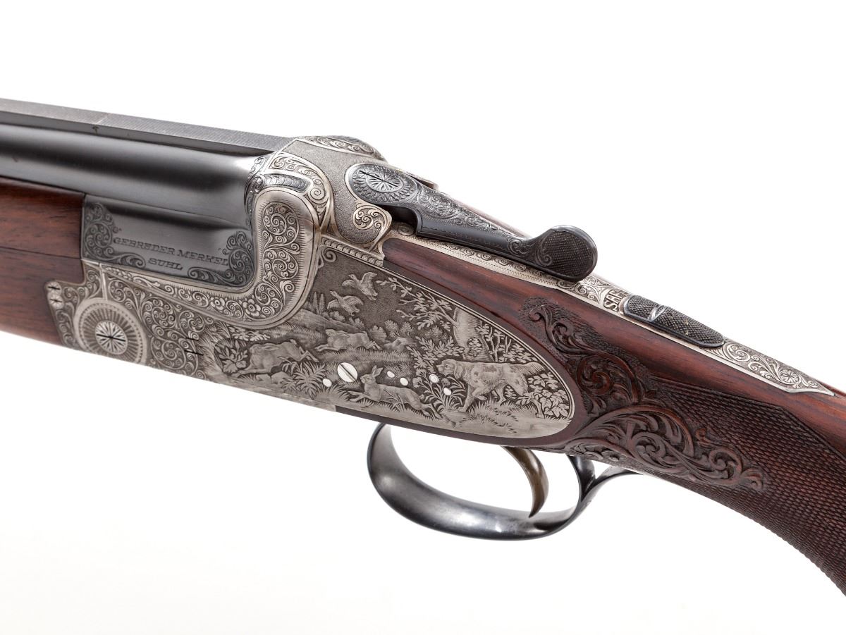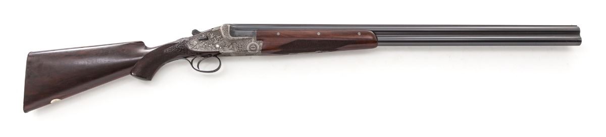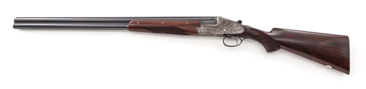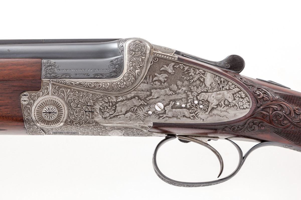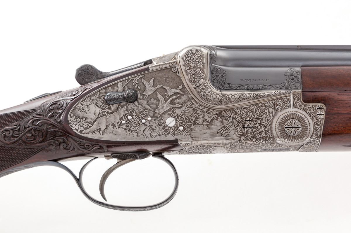Exceptional Gebruder Merkel, Suhl, Model 203-E Over/Under Detachable Sidelock Shotgun, #36444, 12 ga., 2-3/4'' chs., 28'' satin blue finish barrels with 3/8'' tapering matted rib, 1/8'' front white bead, chokes measuring .050'' and .035'', double Kersten crossbolts and ejectors. Action is coin-finished, having a blued top lever and triggerguard, with a single mechanical trigger and blued barrel selecting slide on the right side of the trigger plate and a blued automatic top-tang sliding safety; lockplates have brightly polished cocking indicators and screw pins, with a blued detaching lever on the right lockplate. Action has finely detailed, high-relief, classic Germanic game scenes that are chisel, burin and punch-dot engraved with hares and geese pursued by a pointer on the left lockplate and a fox stalking ducks by a marsh on the right lockplate, the engraving technique creating a lustrous three-dimensional effect; the balance of the frame, levers and forend iron are scroll engraved with background shading and rosettes on the bolsters; underlugs are dated 11/1952, with a first quality mark. Figured French walnut pistol-grip stock and three-piece field forend have a semi-gloss oil finish with 26 line-per-inch checkering and finely carved vines on sides of upper wrist; pistol grip cap and ribbed buttplate are black composition and the toe line has a silver oval engraved ''H.C.'' in block letters. Length of pull is 14-1/8'', drop at comb is 1-1/2'' and drop at heel is 2-3/4''; weight is 7-1/4 lbs. The gun remains in excellent, near original condition, having been well maintained, with the appearance of occasional light use. Breeches and action face have faint oxidation. Trigger plating is slightly mottled. Removable forend has a hairline interior separation and the stock has a 1/2'' impression on the heel. Bores are bright with light residue, action is tight, trigger is crisp, ejectors are strong. Est.: $8,000-$12,000. (C&R)