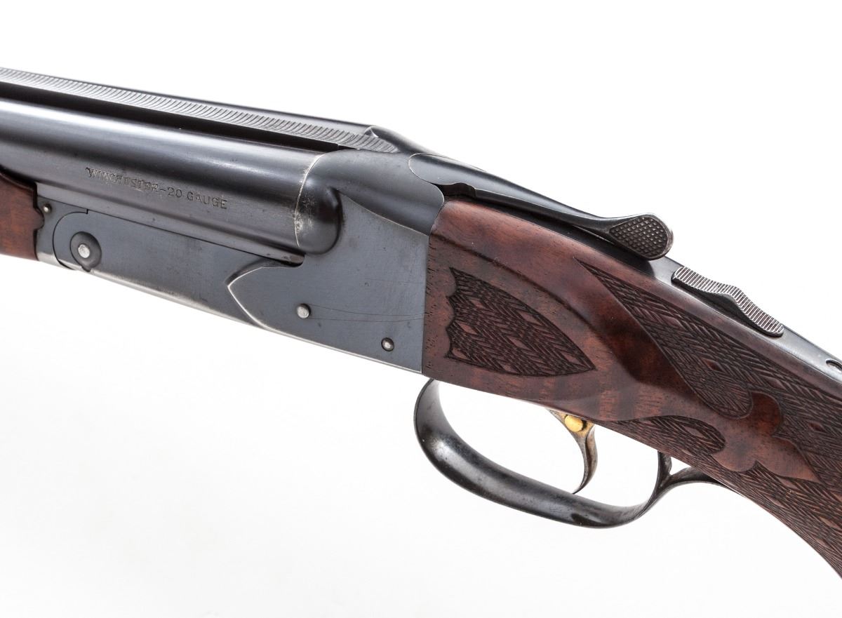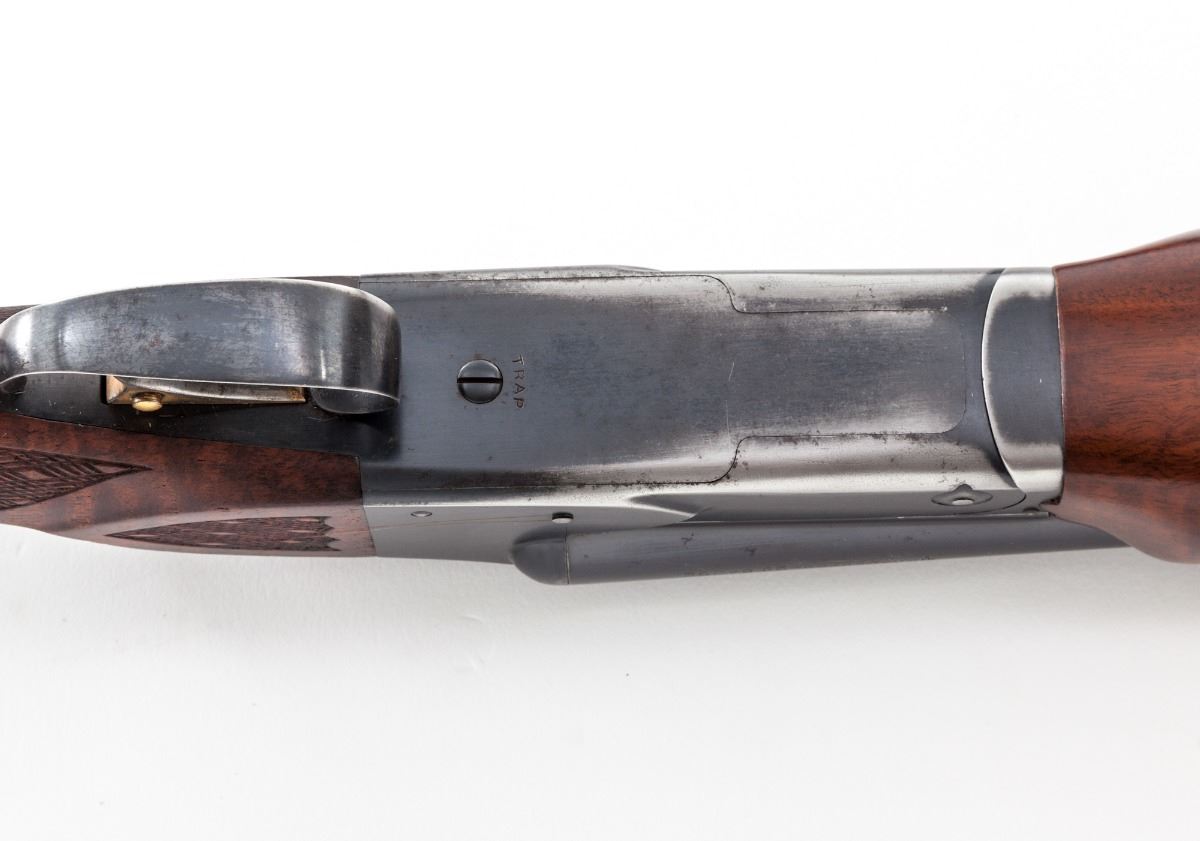 Custom Stocked Winchester Model 21 Trap Grade Side-by-Side Shotgun, #9755, 20 ga., 2-3/4'' chs., blue finish, 26'' barrels with 3/8'' matted concave rib, Bradley red bead front sight and steel middle bead, both chokes WS-1, gold -plated single selective mechanical trigger with ejectors and manual top-tang safety; semi-gloss finished custom pistol-grip stock and oversized beavertail forend are figured walnut with fleurs-de-lis bordered skipline checkering and checkered side panels; pistol grip has a sculptured ebony cap with vacant gold inlaid initial diamond. Length of pull is 14-1/8'' to a steel skeleton buttplate; weight is 6-5/8 lbs. Mfg'd ca. 1935. Overall condition is fair to good. Left barrel has a small bulge 3'' from the muzzle. Action face has wear with ejector scuffing; chambers and bores have oxidation with rust patches at the muzzles. Blue finish is 90% with losses on the floorplate, lower tang and under the forend; frame has freckling and light corrosion. Buttplate has oxidation and rusting around the screws; gold plating on trigger has worn. Wood has a few handling marks and fading of the gloss. Est.: $2,000-$3,000. (C&R)