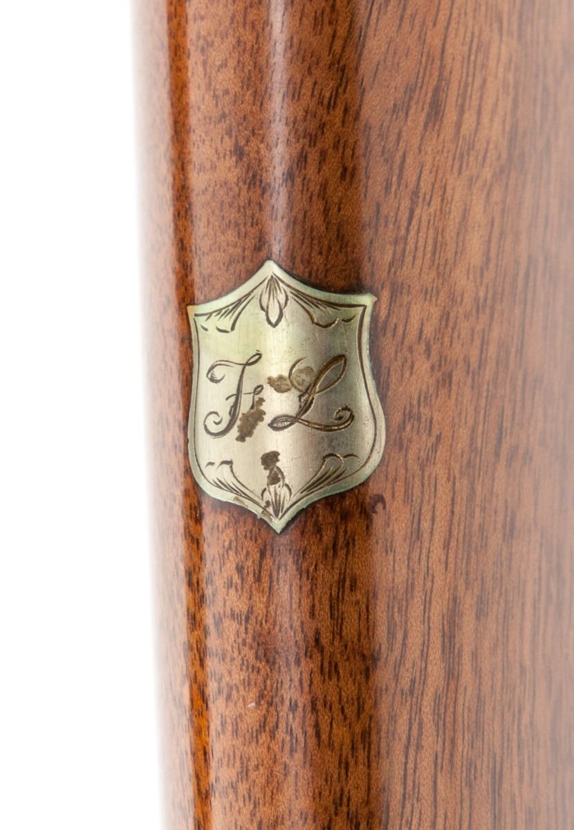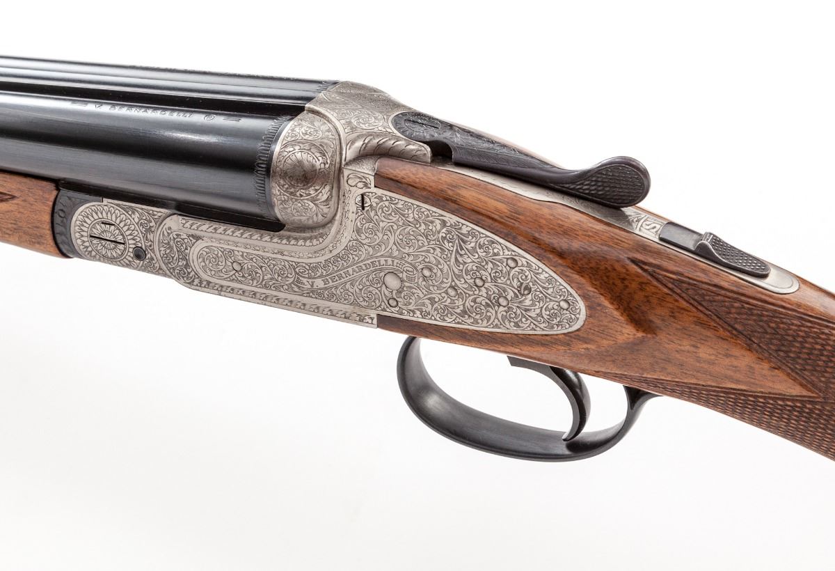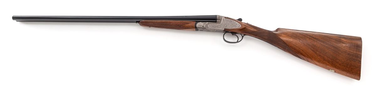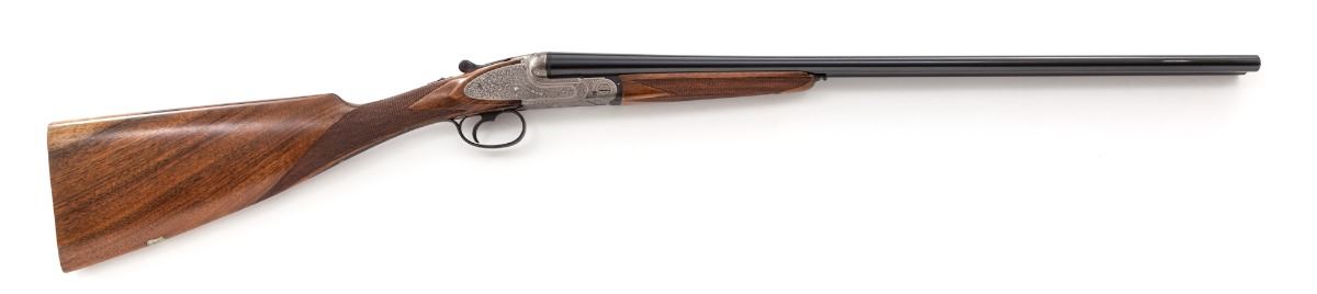 Special Order Vincenzo Bernardelli ''Roma 6EM'' Side-by-Side Sideplated Boxlock Shotgun, #200306, 28 ga., 2-3/4'' chs., 25-5/8'' polished blue finish barrels with 3/8'' tapered concave rib and front brass bead; chokes are marked IM./IC., with ejectors and a third fastener. Action has a silver-matte finish with full coverage etched scroll patterns and game scene cameo on floorplate, non-selective mechanical trigger and automatic top-tang safety; action mating surfaces are engine-turned. European swan-neck stock and Anson release splinter forend are straight-grain walnut with 20 line-per-inch checkering and checkered butt; toe line has a silver shield with the initials ''FL'', wood finish is a light semi-gloss varnish, stock dimensions are 15'' length of pull, 1-1/2'' drop at comb and 2-3/4''drop at heel; weight is 6-3/8 lbs. Italian date code is 1985. In key-lock tan leatherette Italian luggage case with cleaning accessories, no keys are present. Condition is near new with just a few handling marks on the barrels and a little edgewear on the wood; sideplate and floorplate screws are slightly turned out. Est.: $1,800-$2,400. (Modern)