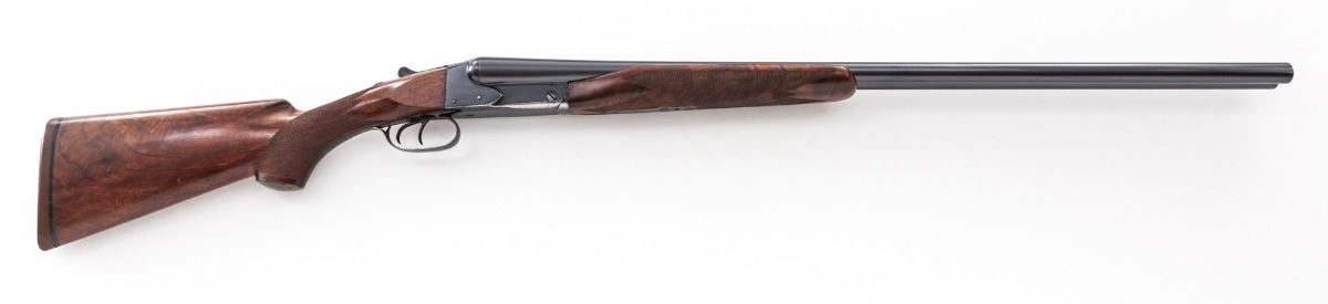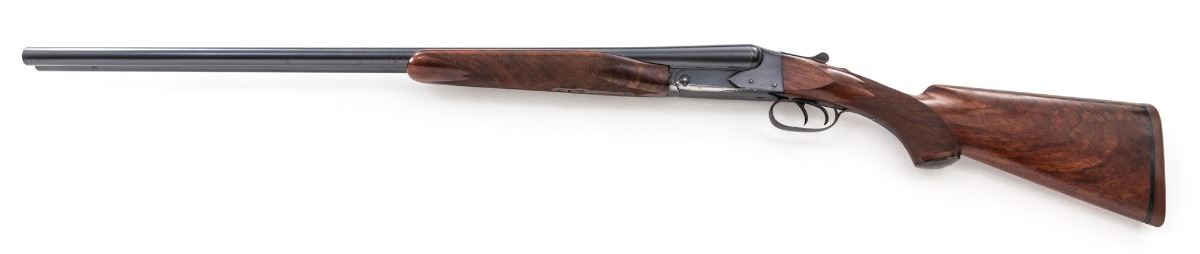 Custom Stocked Winchester Model 21 Standard Grade Side-by-Side Shotgun, #11541, 12 ga., 2-3/4'' chs., blue finish, 30'' barrels with 3/8'' concave matted rib, front and middle white beads, Full/Mod. chokes, double triggers with ejectors and automatic top-tang safety. Custom pistol-grip stock and beavertail forend are flame figure walnut with a semi-gloss finish, 24 line-per-inch checkering and horn pistol grip cap. Length of pull is 14'' over a red 3/4'' Pachmayr Old English recoil pad; weight is 7-3/4 lbs. Mfg'd ca. 1936. Overall condition is good. Action face has oxidation with wear and scuffing from the ejectors. Breeches, muzzles and lug recess have light corrosion. Blue finish is 95% with edgewear and light corrosion on the frame behind the hinge pin and around the triggers and forend latch. Barrels have patchy oxidation. Lower rib is slightly misaligned and reattached at muzzle. Wood finish is 98% with scattered handling marks. Action is tight, triggers are crisp, bores are bright. Est.: $2,500-$3,500. (C&R)