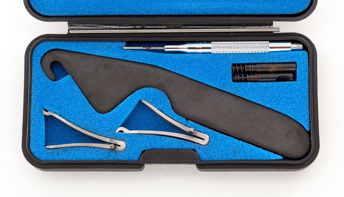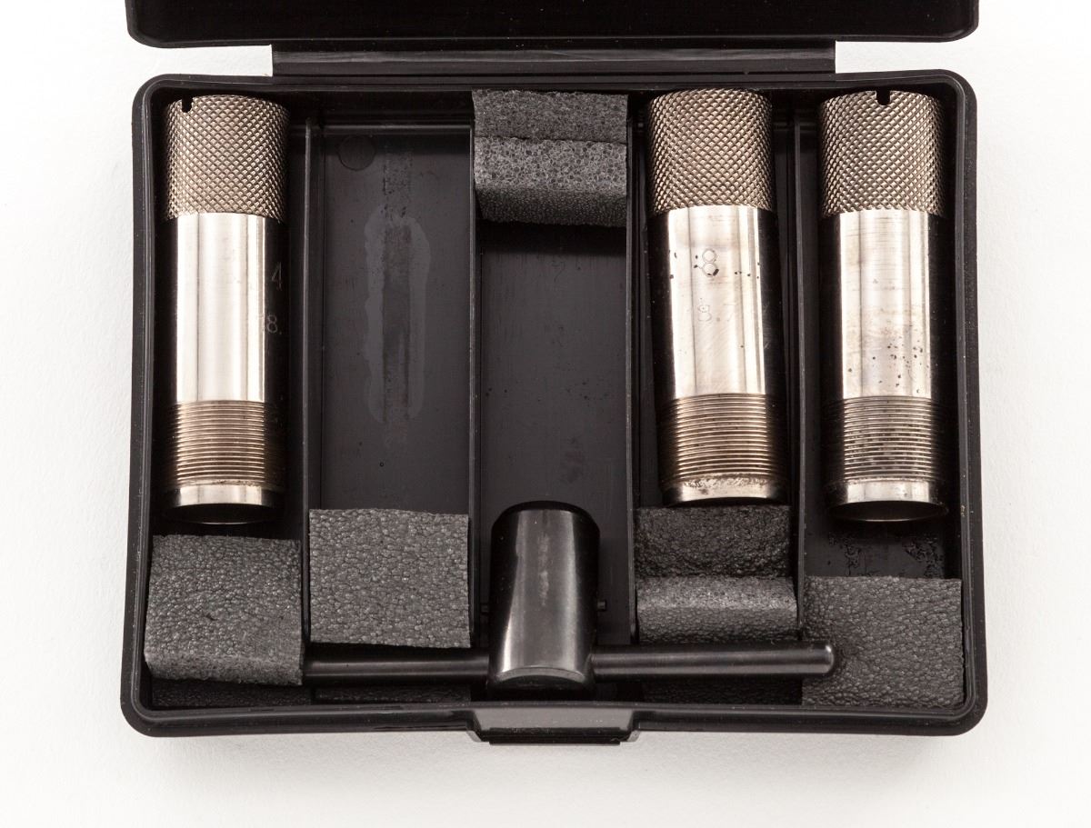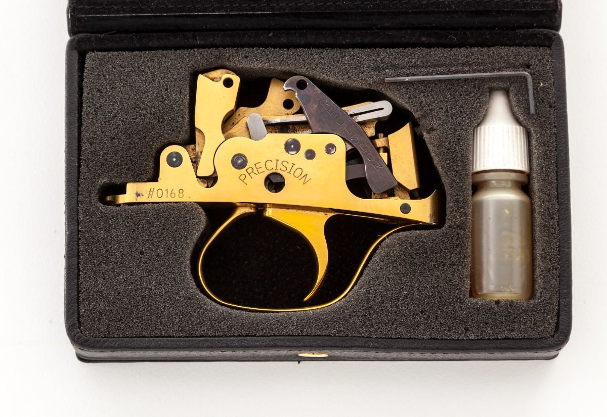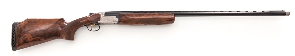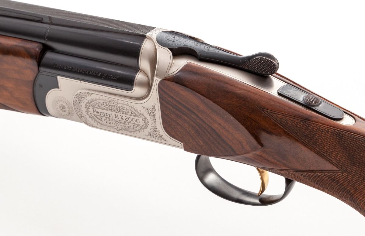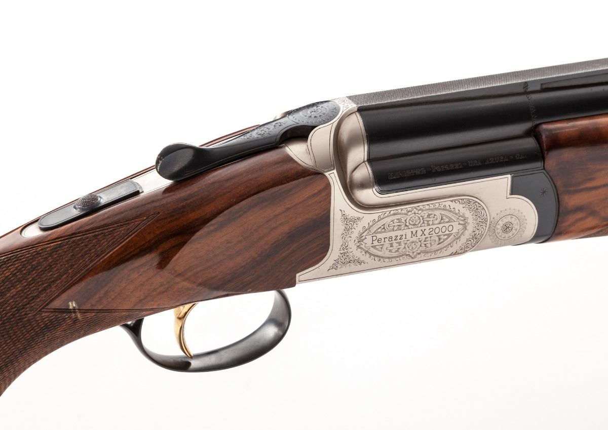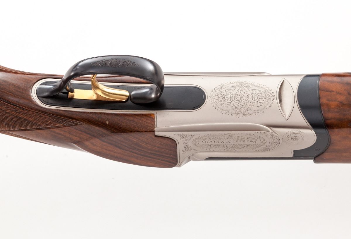 Perazzi Model MX-2000/8-SB Top-Single American Trap Shotgun, #130332, 12 ga., 3'' ch., 34'' blue finish barrel with 7/16'' tapering ventilated rib; ejector and Perazzi extended interchangeable chokes nos. 4,6,8,10 with wrench in their original case. Chamber is importer marked ''Perazzi-USA AZUSA-CA.'', barrel is serial numbered to the frame and marked with a 2004 date code, 1.640 KG weight and 18.7 bore. The bright nickel-plated frame has a manual top tang safety and is hand engraved by Bottega C. Giovanelli Engravers, with fine scroll and border patterns which carry to the top lever and triggerguard. The removable leaf spring trigger group has a gold-plated trigger and is serial numbered to the frame; an accessory Precision Gold removable leaf spring trigger group #0168 in its original case is included. (The accessory trigger is a Release type.) The contrasting marble figure pistol-grip walnut stock and target forend have a high-gloss finish with 24 line-per-inch checkering and length of pull of 14-1/2'' over a 1'' black Perazzi ventilated recoil pad; drop at comb is 1-3/8'', drop at MC is 1-1/2'', drop at heel is 2-3/8'', weight is 8-3/4 lbs. In Perazzi hard case by Negrini with combination locks, an unused Perazzi trigger group service kit, and a Perazzi stock wrench. Overall condition is excellent with 98% blue and wood finish, bright bore and tight action with moderate wear on the face. Frame interior and barrel breech have scattered assembly marks with oxidation and light pitting from powder residue. Case has interior loosening of fabric and filler with exterior staining. Est.: $4,000-$6,000. (Modern)
