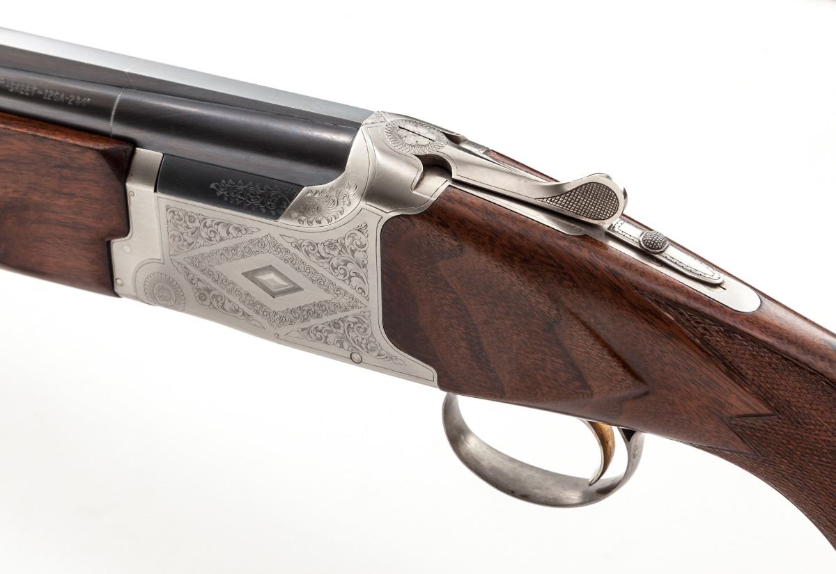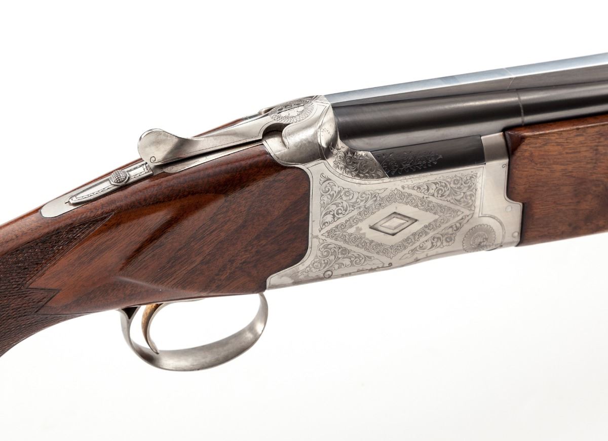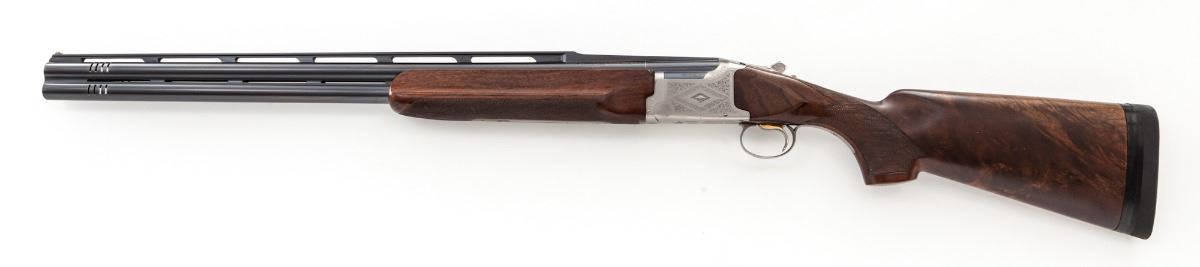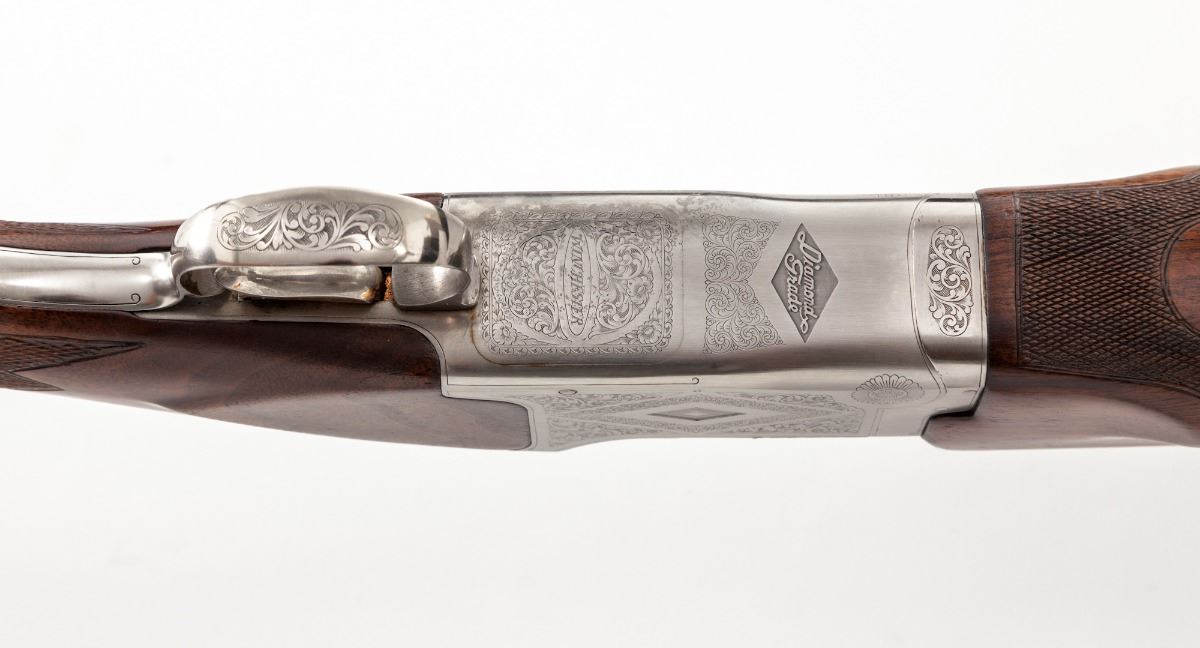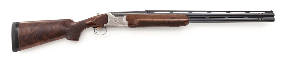 Winchester Model 101 Diamond Grade Skeet Over/Under Shotgun, with Briley Small-Gauge Inserts, #DG496010E, 12 ga., 2-3/4'' chs., 27-1/2'' blue finish ported barrels with matted 7/16'' ventilated top and center rib, front and middle white beads, both barrels marked Skeet, with ejectors; silver nitride finished frame has full coverage floral scroll engraving in a diamond pattern, with gold-plated mechanical trigger and combination top-tang safety and barrel selector. Checkered pistol-grip stock and target forearm are deluxe swirl-figure walnut with a satin finish and black diamonds inset in the upper wrist and pistol grip base. Length of pull is 14-1/2'' over a black 1-1/2'' Decelerator recoil pad. Drop at comb is 1-1/2'', drop at heel is 2-3/8'', weight is 8-3/4 lbs. Included are Briley small-gauge inserts in 20 and 28 gauge and .410 bore, with four (4) Briley chokes for each barrel set ranging approx. from Full to IC. Complete in an SKB black plastic key-lock case with Winchester paperwork, insert tools, choke wrenches and keys. Current overall condition is 95% as modified. Bores have been opened approx .005'' to remove the original chokes and accommodate the small gauge inserts. Combination top-tang safety and barrel selector slide is deactivated and locked to fire the lower barrel first. Frame has scattered oxidation and lifting of the finish; barrels have assembly and handling marks and light scratches; center rib and lower barrel are slightly bulged 1/2'' ahead of the forearm tip; gold trigger plating is worn. Stock has light handling marks and scratches with slightly uneven wear to the finish. Est.: $1,400-$1,800. (Modern)