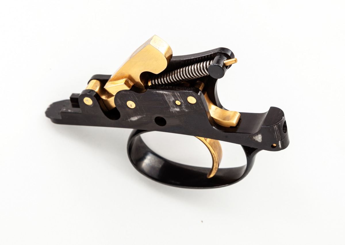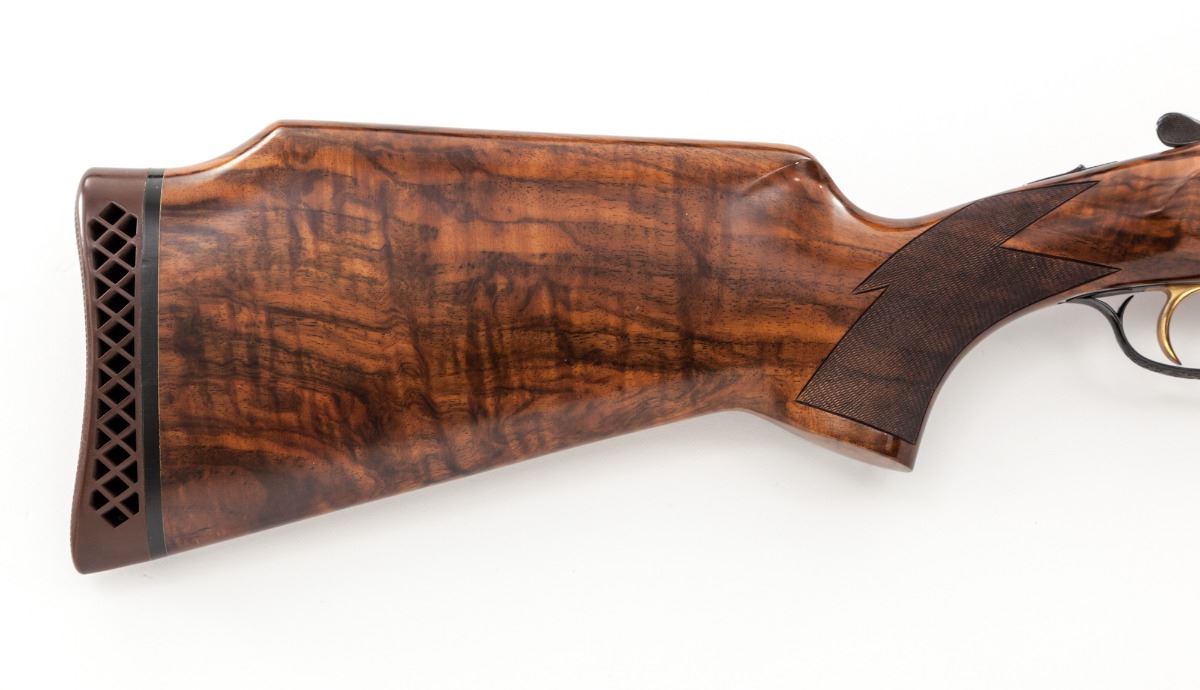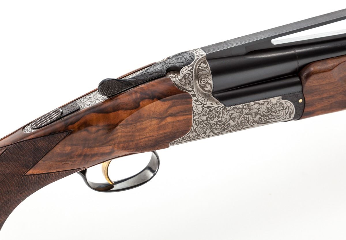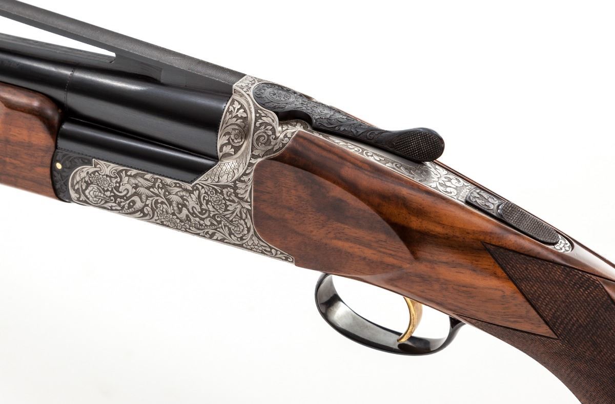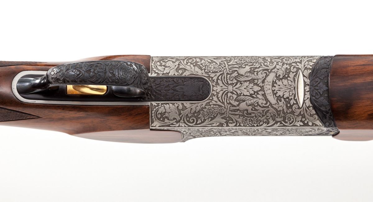 Classic Perazzi Gothic Mythology Engraved TMX/SO Single Barrel Trap Shotgun, #8559, 12 ga., 2-3/4'' ch., 33-1/2'' barrel with an 18.5mm bore, finished in high-polish blue, with a tall matted 11mm ventilated rib, front white and middle silver beads, with Perazzi second generation interchangeable choke tubes, nos. 4,6,7 and 10.; barrel is serial numbered to the frame and has a 1983 Italian date code, chambers are marked, ''IMPORTER-PERAZZI-USA'', ''ROME-NEW YORK''. Coin-finished fully relief engraved action features winged dragons intertwined among leaf scrolls and rosettes, with an expressive grotesque mask on the trigger plate, highlighted by contrasting darkened punch-dot backgrounds on all three frame sides, Perazzi in-house pattern number 112, which also follows to the blued forend iron, triggerguard, top lever and trigger group release slide. Removable trigger group is numbered to the frame and has a gold-plated trigger, gold-plated components and coil mainspring. Monte Carlo pistol-grip stock and beavertail forend are satin-finished red-toned Turkish walnut with tiger stripe and marble grain, 32 line-per-inch checkering and a 14-3/8'' length of pull over a brown 1'' Perazzi ventilated recoil pad. Drop at comb is 1-3/8'', drop at MC is 1-1/2'' and drop at heel is 2-1/4'', weight is 8-5/8 lbs. Included is a silver-gray Perazzi ABS combination lock case by Negrini and a choke wrench. Condition is excellent, having minimal use, with a few light handling and assembly marks. Bore is bright with traces of residue, breech has faint oxidation, trigger group has thickened storage oil. Stock has small storage marks on right side panel. Est.: $12,500-$19,500. (Modern)
