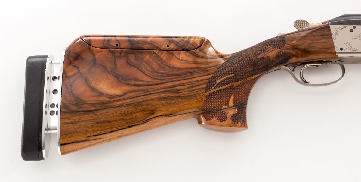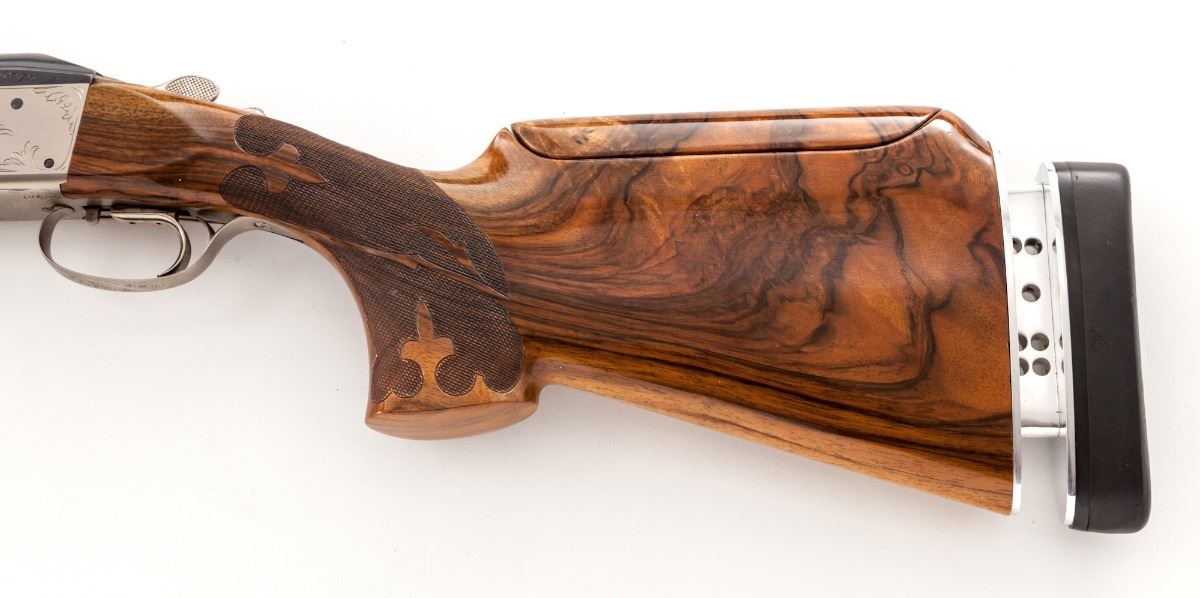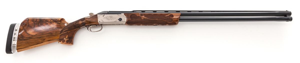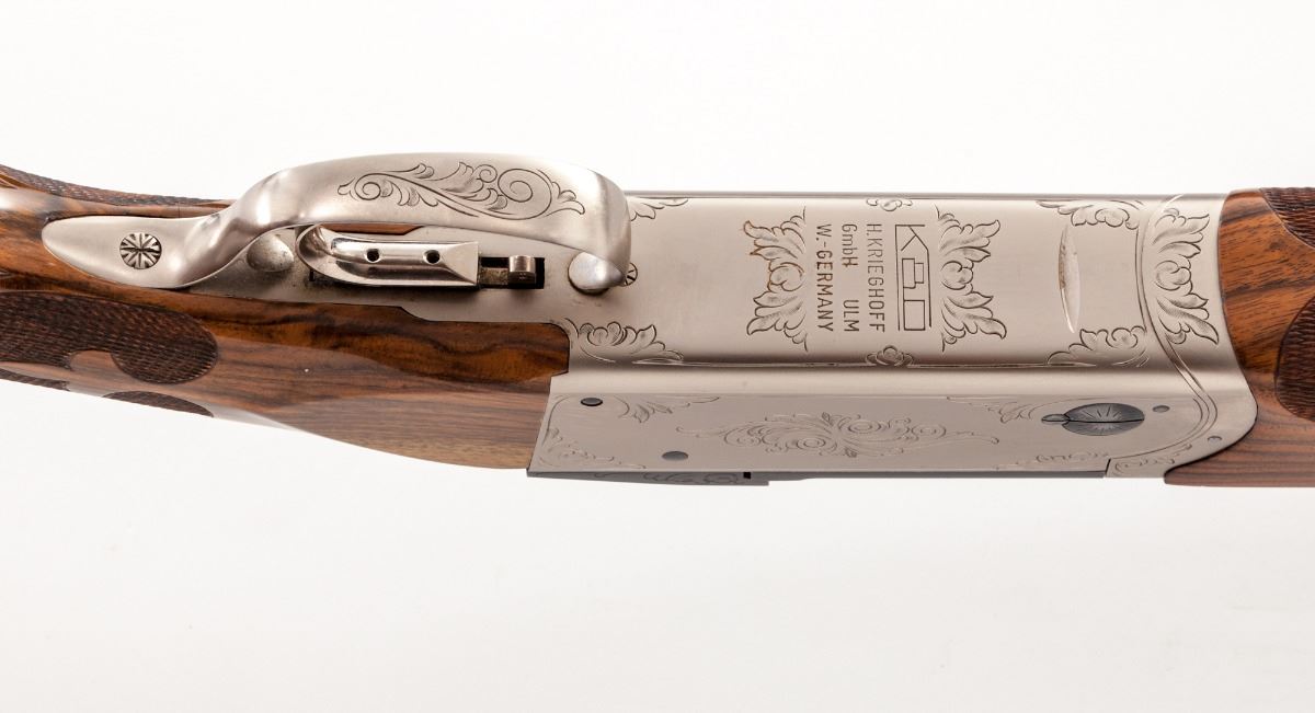 Krieghoff K-80 Standard Model Combination Trap Shotgun Set, #24122, 12 ga., 2-3/4'' chs., with 32'' over/under barrels and 34'' unsingle barrel with point of impact adjustment; both barrel sets are blued with 7/16'' tapering ventilated ribs, front white and middle steel beads, ejectors and a total of five (5) Krieghoff interchangeable chokes nos. 1,1,3,4,4 with a Krieghoff wrench; barrels are serial numbered to the frame and bore diameters are marked 18.6. Satin nickel-plated frame has Standard Model light scroll engraving, adjustable double release trigger with barrel selector, and push-button manual safety with lockout feature. The SoftTouch 4-way adjustable Monte Carlo stock and target forend are contrasting swirl figure walnut with high-gloss finish and fleur-de-lis bordered 24 line-per-inch checkering. Length adjustable buttplate has a 1'' KICK-EEZ rubber recoil pad; weight with over/under barrel set is 10 lbs.; mfg'D ca. 1996. In blue velour lined Krieghoff heavy duty aluminum case with small tools and accessories. Mechanical condition remains very good to excellent, showing moderate use, with tight action and bright bores. Frame plating is 99% with a few scuffs; blue finish is 95% with scattered oxidation and pitting on the ribs; barrels have assembly marks from installing the forend and there are a few scratches near the muzzles; front bead on the over/under barrels is loose. Wood finish is 98% with a few small handling marks. Case has overall scuffing and patchy rust on the handle hardware. Est.: $5,000-$7,000. (Modern)