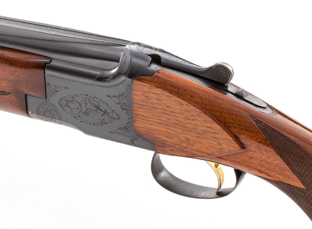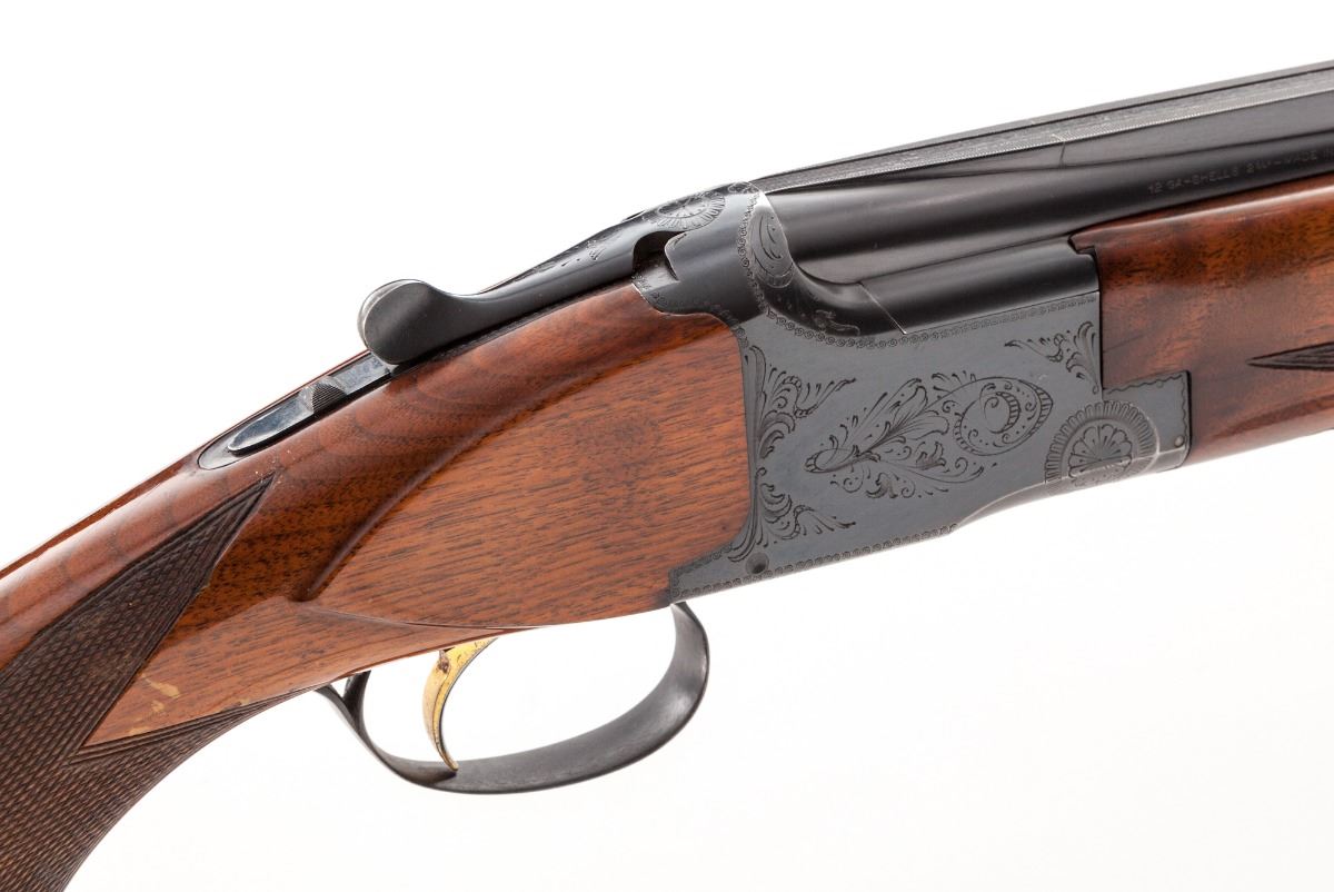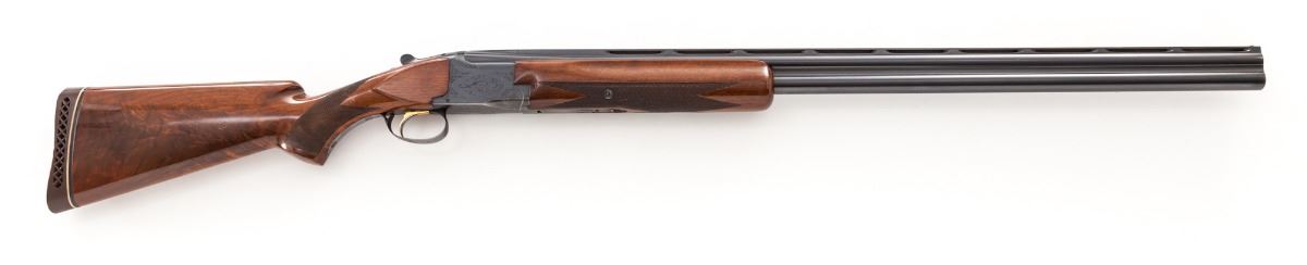 Browning Superposed Grade I Broadway Trap Model Over/Under Shotgun, #48275 S5, 12 ga., 2-3/4'' chs., blue finish, 32'' barrels with ventilated 5/8'' grooved rib, front and middle white beads, Full/Mod. chokes, gold-plated inertia trigger with ejectors and a combination sliding top-tang manual safety and barrel selector; action is engraved with standard period Grade I vines and border patterns. The lightly figured checkered walnut pistol-grip stock and semi-beavertail forearm are finished in high-gloss urethane with a 14-1/2'' length of pull over the original 1'' Browning recoil pad; weight is 8-1/4 lbs. Overall condition remains fair to good with bright bores and moderate use on the face. Action has accumulated grease requiring prodding of the top lever to close, ejectors are good. Barrel blue is 95% with 60% blue on the frame, side ribs are resoldered, and trigger plating is worn. Stock has scattered handling marks and scratches with light chaffing around the inletting. Included with the gun is a Browning Traditional style takedown case with two keys. Est.: $1,200-$1,800. (C&R)