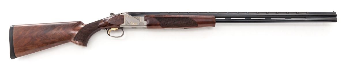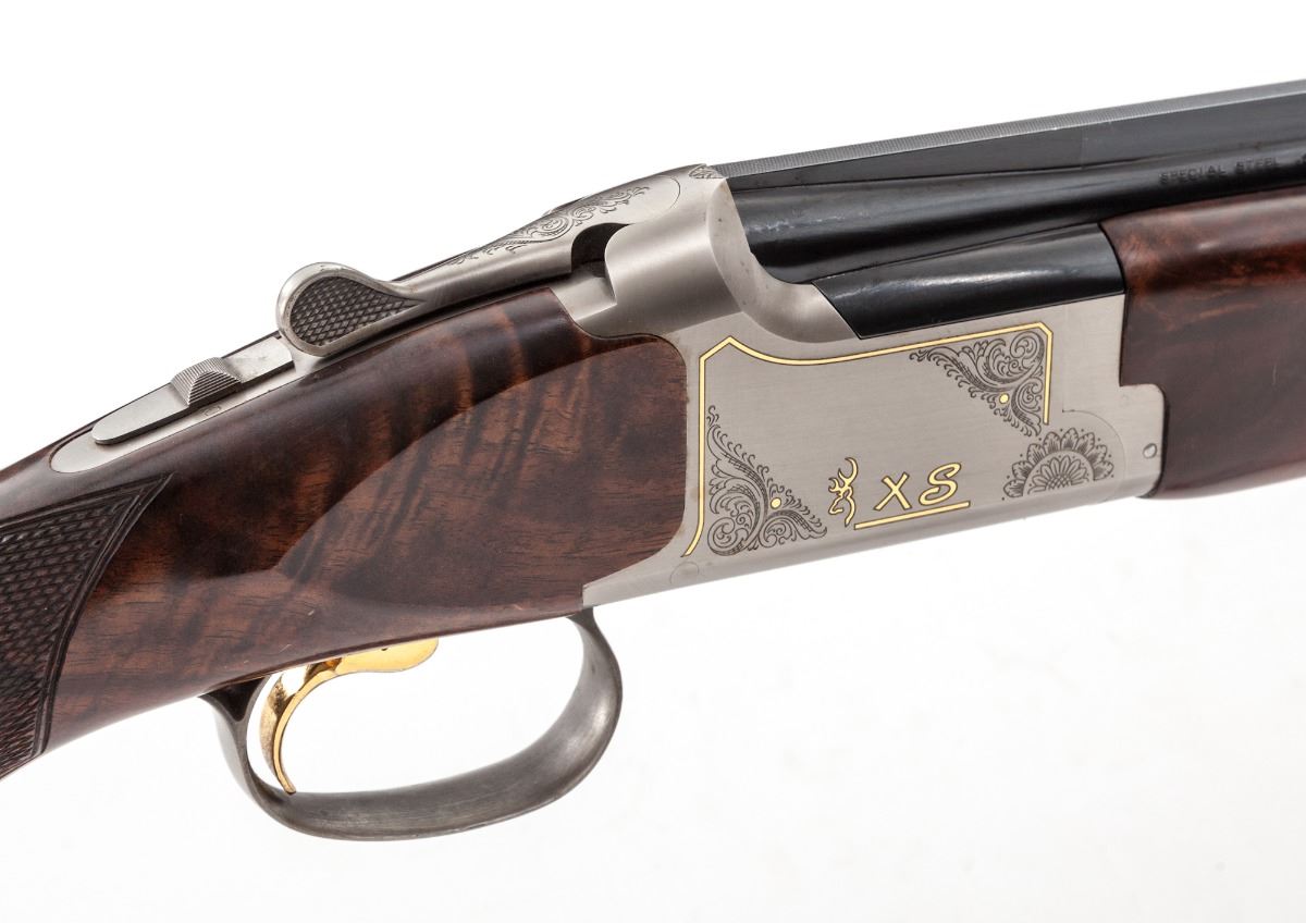 Browning Citori XS Sporting Over/Under Shotgun, #19944MY131, .410 bore, 3'' chs., blue finish 30'' barrels with matted 1/4'' ventilated top and center rib, front and middle white beads, Invector choke tubes both Full, with ejectors; silver nitride finished frame has light engraving with applied gold borders, gold-plated adjustable inertia trigger and combination manual top-tang safety and barrel selector. Checkered pistol-grip stock and Schnabel forend are matte-finished, medium figure walnut with a 1/2'' black rubber recoil pad; weight is 7-3/8 lbs. Mfg'd ca. 2002. Original box and papers are included. Condition is good showing light use. Frame and barrels have scattered storage oxidation with light chipping along the rib. Breech faces and muzzles have corrosion and pitting which has spread to the choke tubes. Stock and recoil pad have handling and storage marks. Est.: $1,200-$1,800. (Modern)