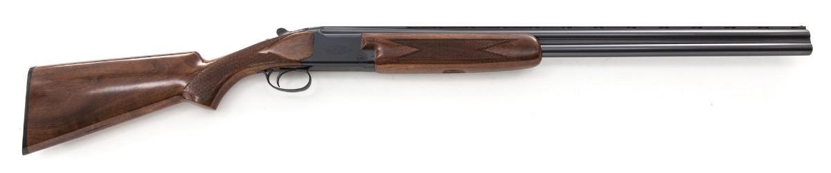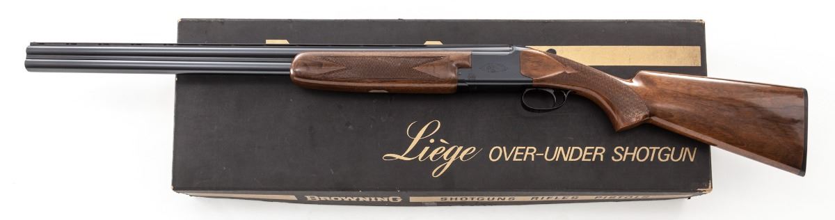 Browning Liege Grade I Over/Under Shotgun, #72J00517, 12 ga., 2-3/4'' chs., blue finish, 28'' barrels with matted 1/4'' ventilated rib, front silver bead, Full/Mod. chokes, ejectors and mechanical trigger with a combination top-tang manual safety and barrel selector; frame has standard Grade I light scroll engraving patterns; checkered pistol-grip stock and forend are straight grain walnut with a high-gloss urethane finish. Length of pull is 14-1/4'' over a black plastic Browning buttplate; weight is 7-1/2 lbs. Overall condition appears near new with a few handling and assembly marks and small oxidation spots in the action; left side rib has a slight flaw near the muzzles. Included with the gun is its original box and paperwork. Est.: $800-$1,200. (Modern)
