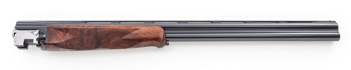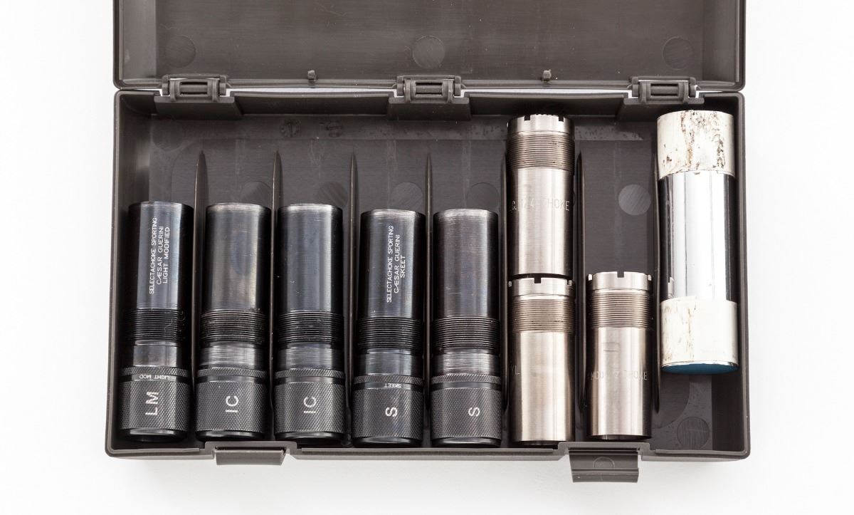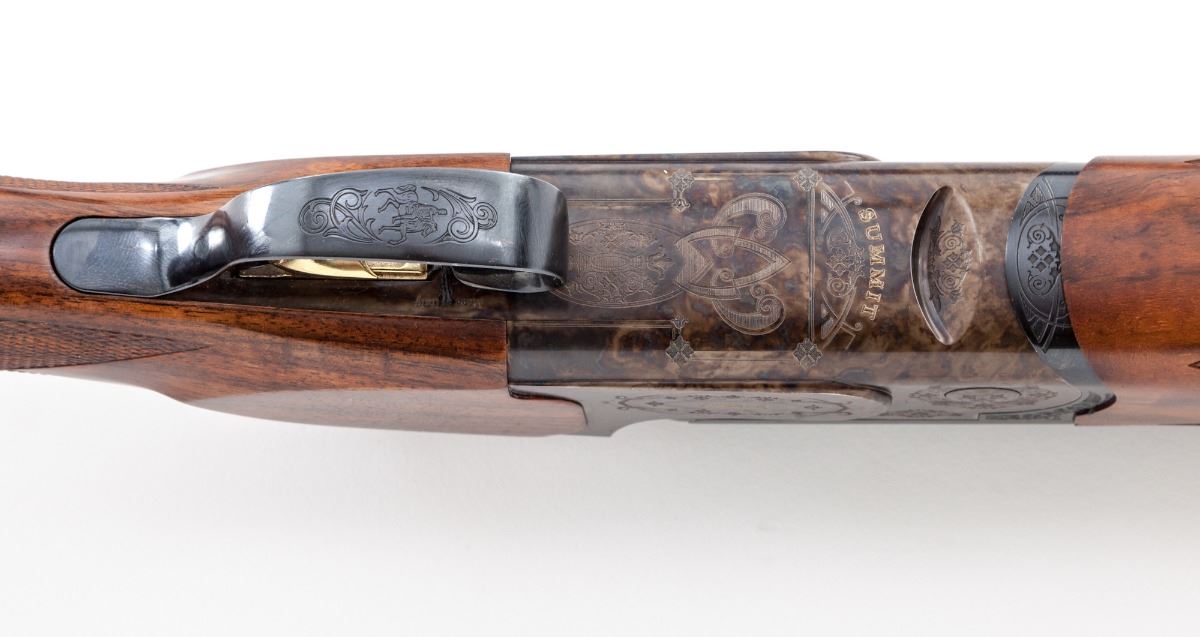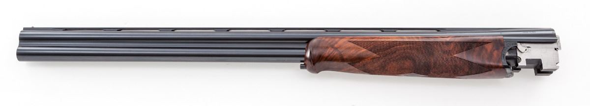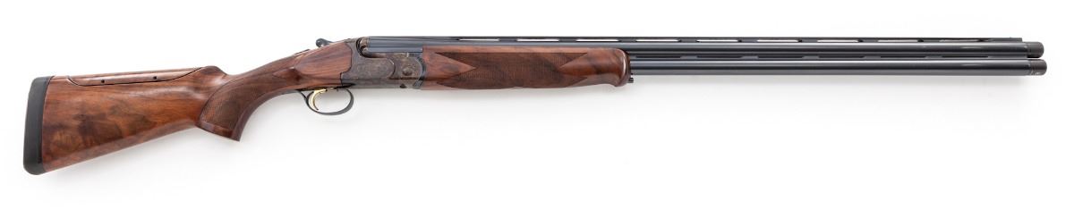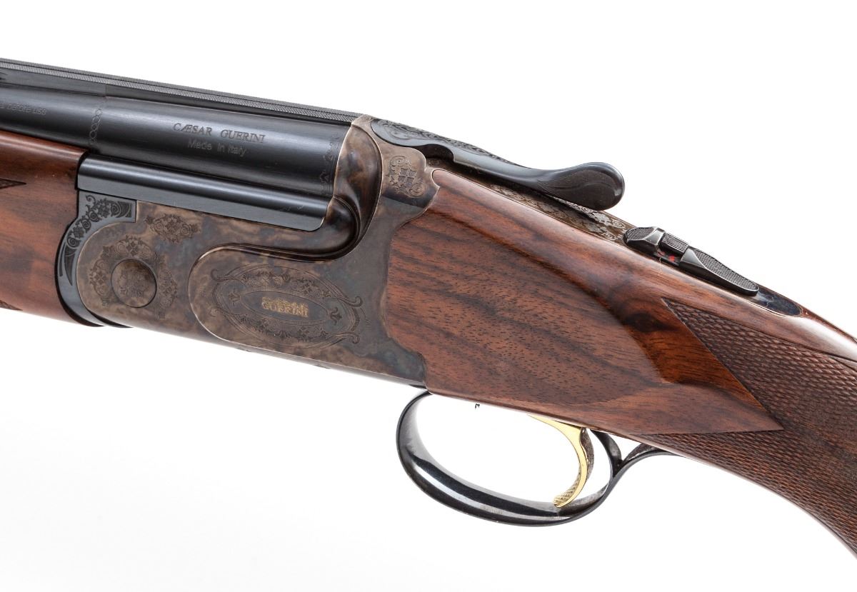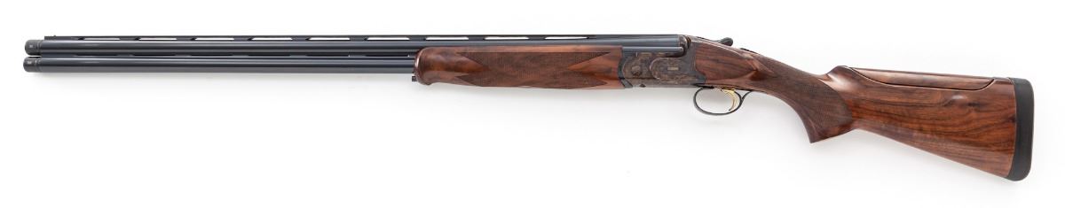 Caesar Guerini Summit Limited Sporting Over/Under Shotgun with Two Barrel Sets, #107658, 12 ga., 2-3/4'' chs., bright blue finish 32'' sporting barrels, serial numbered to the frame, with matted 3/8'' center-groove ventilated top rib and ventilated side ribs, and seven (7) Guerini extended competition chokes ranging from Imp. Mod. to skeet, accompanied by a set of 12 ga., 3'' chs., bright blue finish 28'' field barrels, serial number 10218, having a matted 1/4'' ventilated rib, with five (5) Guerini flush-mount field chokes ranging from Full to Cylinder, both barrel sets with front and middle gold beads and ejectors. Color case-hardened boxlock action has extremely fine geometric patterns and light floral border engraving by Bottega C. Giovanelli Engravers, with an adjustable gold-plated mechanical trigger and combination manual top-tang safety and barrel selector. Checkered pistol-grip stock and Schnabel forends are satin oil-finished, marble-figure Turkish walnut with a four-way adjustable comb and 1'' black Decelerator recoil pad; weight is 7-7/8 lbs. The Italian date code is 2005. Included is a factory Negrini combination lock plastic case with choke wrench, adjustment tools and stock weight. Overall condition is excellent, appearing to have little use, with a few light handling and assembly marks. A very practical and usable multi-purpose set. Est.: $4,000-$6,000. (Modern)