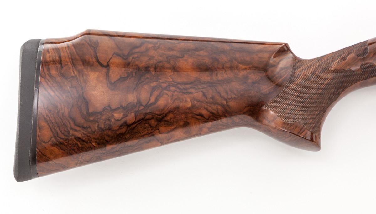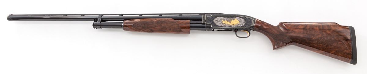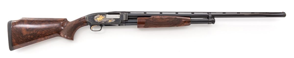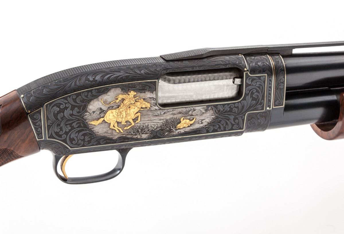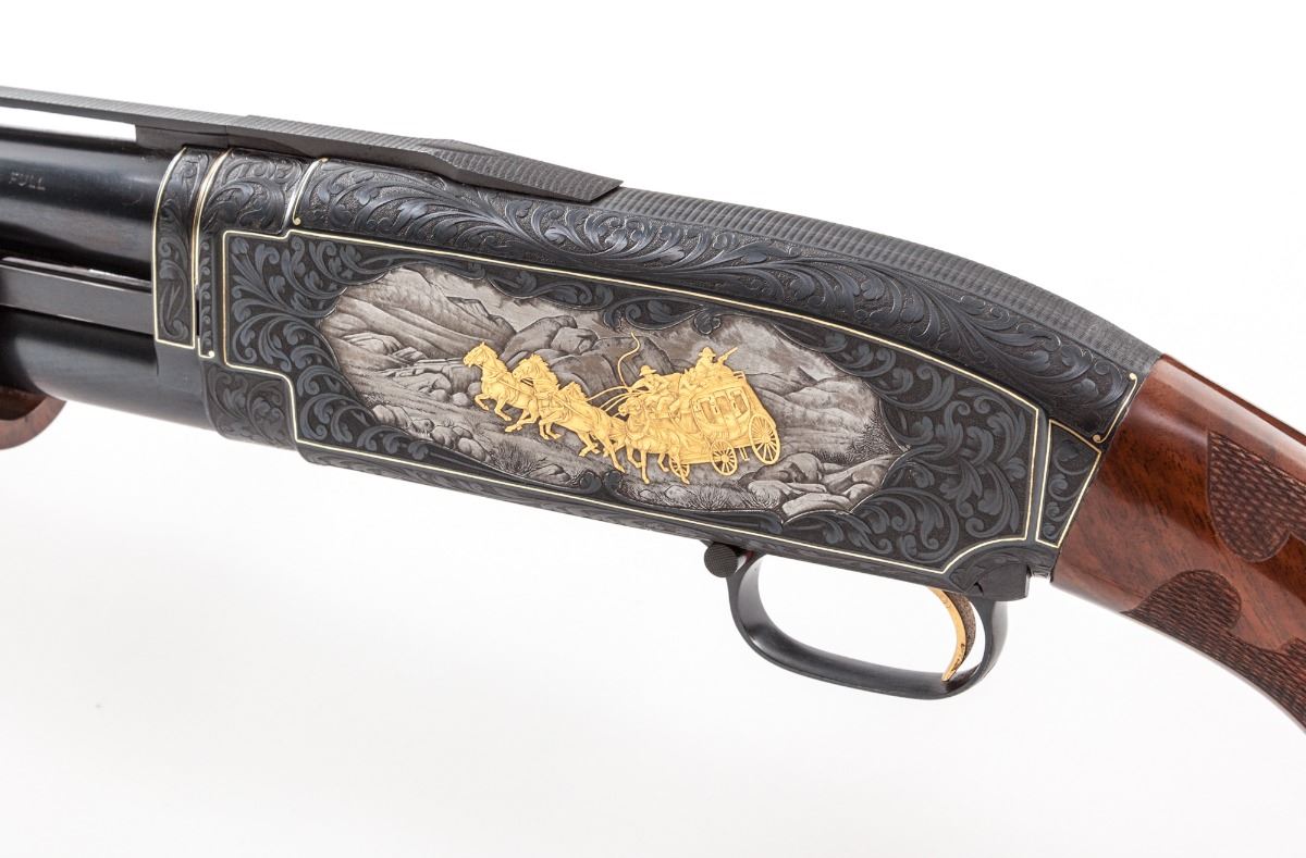 Dynamic Wild West Themed Winchester Model 12 Slide-Action Shotgun, by Gino Cargnel, #1288811, 12 ga., 2-3/4'' ch., polished blue finish 30'' barrel with matted 5/16'' ventilated rib and Bradley red front bead. Action is fully and intricately engraved with large open scrolls bordering gold inlaid bolting horses drawing a stagecoach through silvered mountain foothills on the left side of the receiver and a lone rider galloping across a silvered Monument Valley scene on the right side; receiver edges, barrel extension, muzzle and triggerguard are inlaid with gold bands, frame serial number is gold inlaid, trigger is gold-plated, and carrier and bolt are engine turned; triggerguard has a push-button safety. Flared pistol-grip Monte Carlo stock and contoured handle are finest dark swirl-grain burl walnut with a high-gloss finish and 20 line-per-inch checkering. Length of pull is 14-3/4'' over a 7/8'' black Kick-EEZ recoil pad, drop at comb is 1-3/8'', drop at MC is 1-3/8'', drop at heel is 1-7/8''; weight is 8-1/2 lbs. Original mfg. date is ca. 1950. Condition is near new since enhancement with a few handling and cycling marks. Est.: $7,500-$9,500. (C&R)