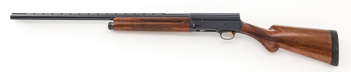 Modified Browning Auto-5 Light Twelve Semi-Automatic Shotgun, #5G9809, 12 ga., 2-3/4'' ch., blue finish, 27-1/2'' barrel with matted 5/16'' ventilated rib and front silver bead, full choke code, gold-plated trigger with a triggerguard mounted push-button safety; checkered round-knob stock and fingergroove forearm are light toned walnut with a semi-gloss finish. Length of pull is 14'' over a black 1'' Decelerator recoil pad; weight is 8 lbs. Overall condition is excellent with faint evidence of firing. Blue finish is better than 99% with scattered handling marks in the wood. Barrel has a gunsmith-installed removable Briley S-1 Vx Skt choke. Bore is bright. Est.: $500-$700. (C&R)